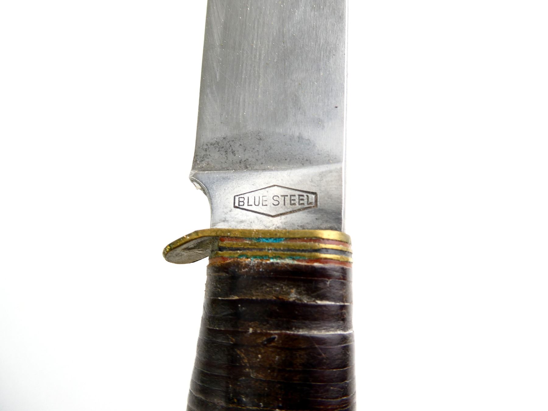 LOT INCLUDES; (3) STEEL FIXED BLADE KNIVES, LEATHER WASHER STYLE GRIP, VARIOUS MARKINGS, WITH LEATHER SHEATHS, BLADES APPROX. 5 1/8"-6.75" & OAL APPROX. 9 1/8"-11". SEE PHOTOS.