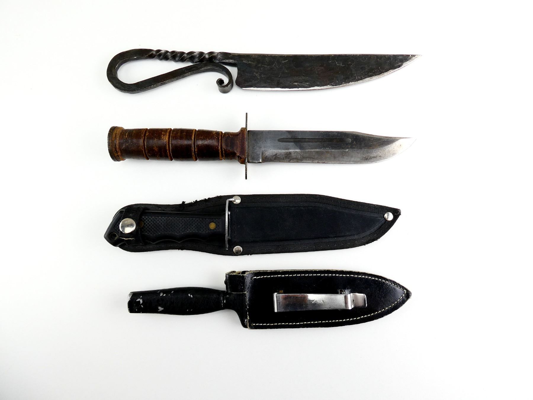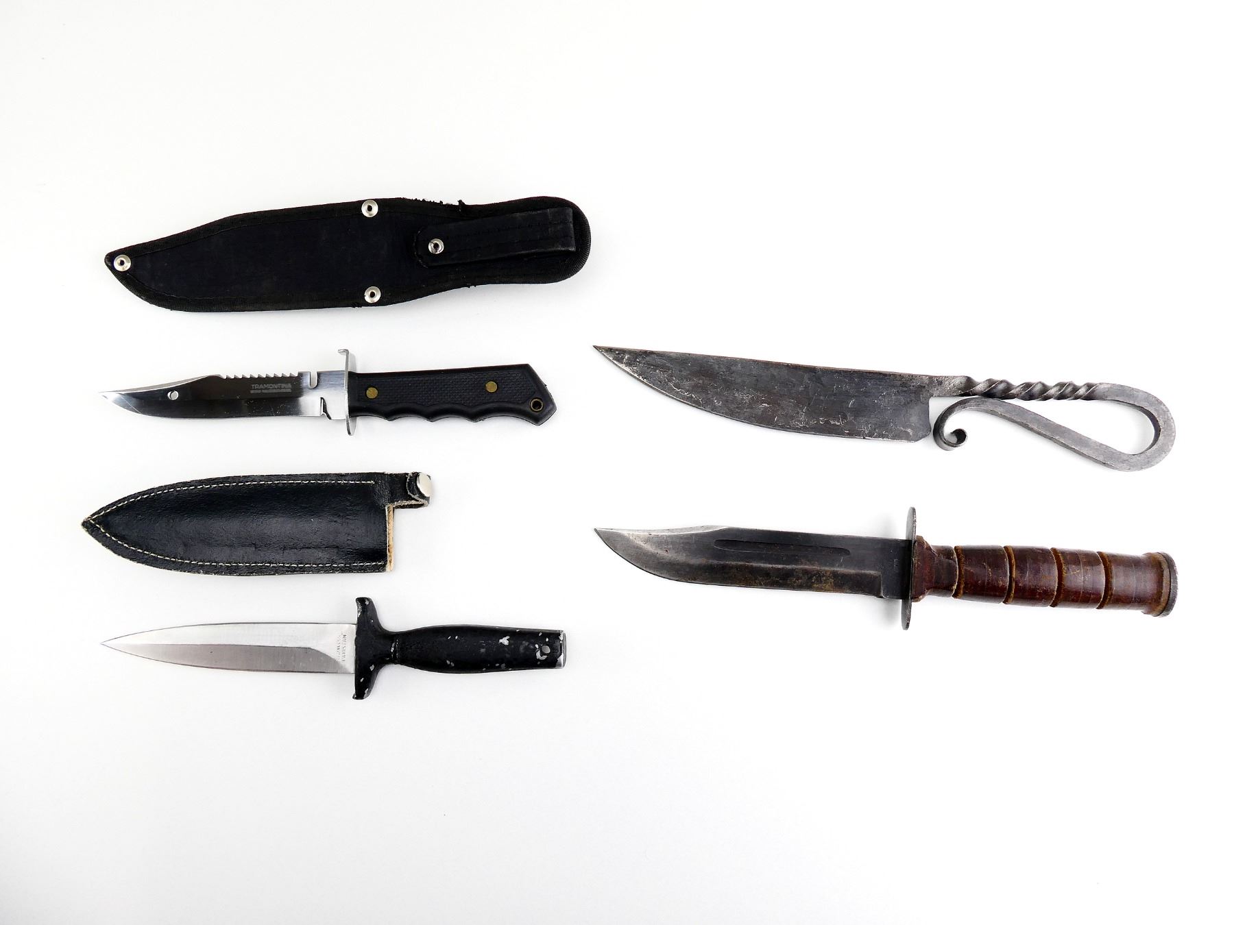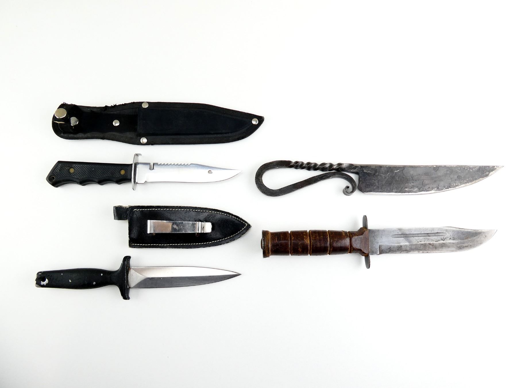 LOT INCLUDES; (4) FIXED BLADE KNIVES, VARIOUS MANUFACTURERS, SOME WITH SHEATHS, BLADES APPROX. 5.25"-6.75" & OAL'S APPROX. 9"-11". SEE PHOTOS.