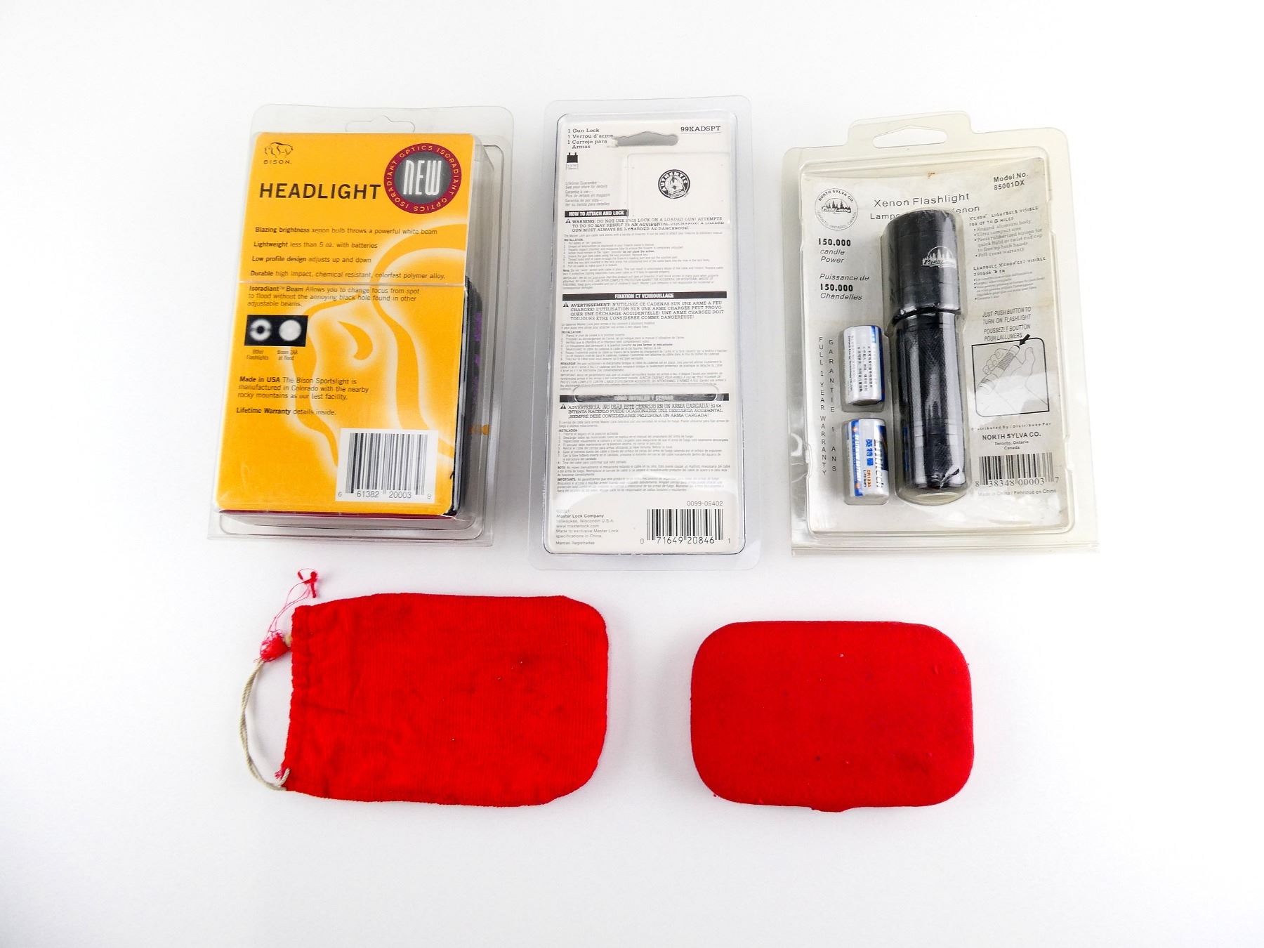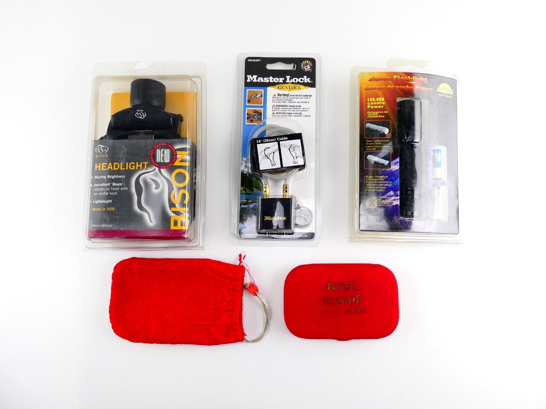LOT INCLUDES; PARKLANDS XENON FLASHLIGHT, 150,000 CANDLE POWER, MODEL #: 85001DX, UNTESTED, APPEARS NOS IN ORIGINAL PACKAGING, (1) BISON HEADLIGHT, ISORADIANT BEAM, LIGHTWEIGHT, UNTESTED, APPEARS NOS IN ORIGINAL PACKAGING, (1) MASTER LOCK GUN LOCK WITH KEYS, APPEARS NOS IN ORIGINAL PACKAGING & (1) HANDWARMER. SEE PHOTOS.