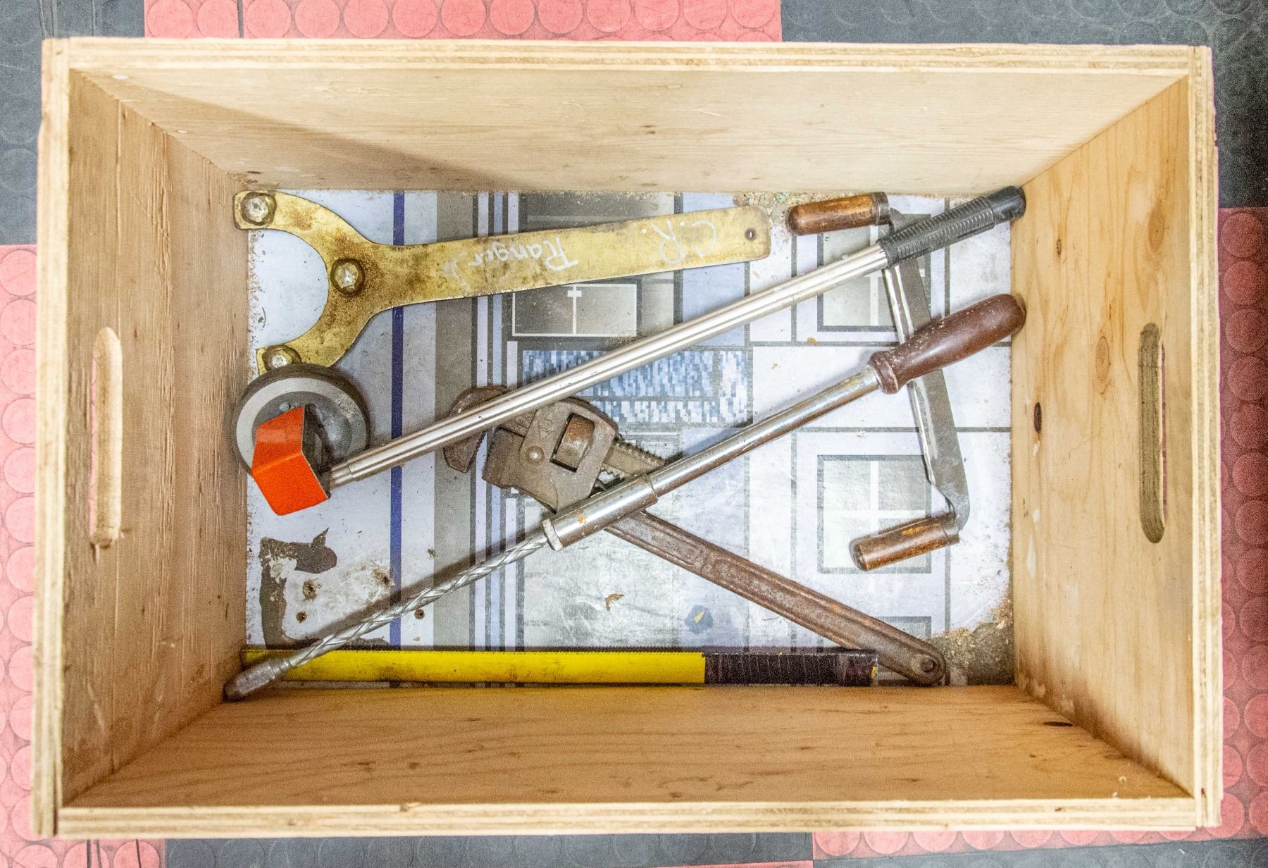 STILSON 18 PIPE WRENCH, STANLEY 'YANKEE SCREW DRIVER", PRECIMETER MODEL 305 ADJUSTABLE METRIC MEASURING TOOL, DRAW KNIFE, ETC.