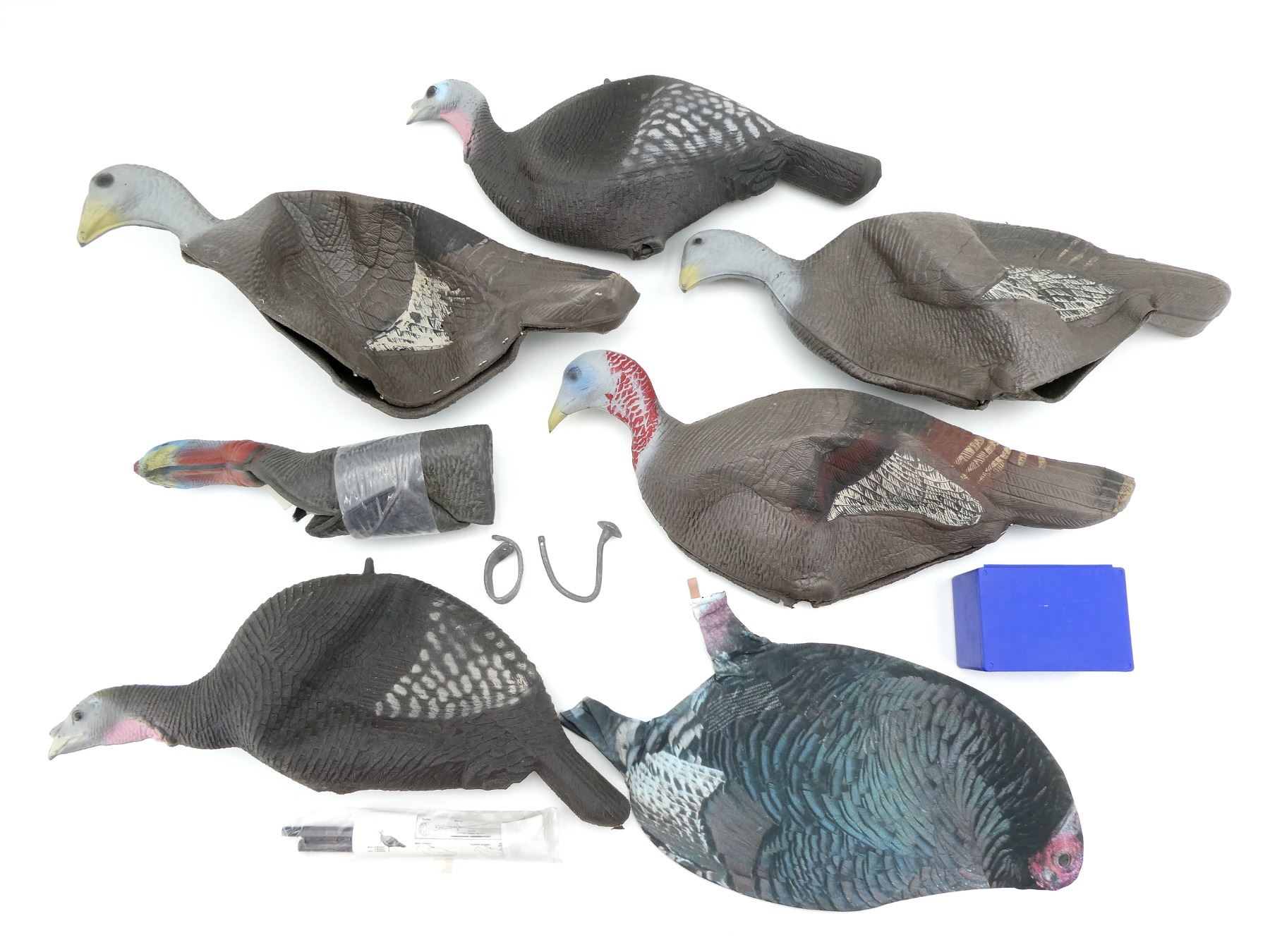 LOT INCLUDES; (7) FOAM / PLASTIC TURKEY DECOYS, VARIOUS SIZES / COLOURS, VARIOUS MARKINGS, SHOWS WEAR / TEAR & APPROX. (16) LEAD DECOY WEIGHTS IN PLASTIC CONTAINER, VARIOUS SIZES. SEE PHOTOS.