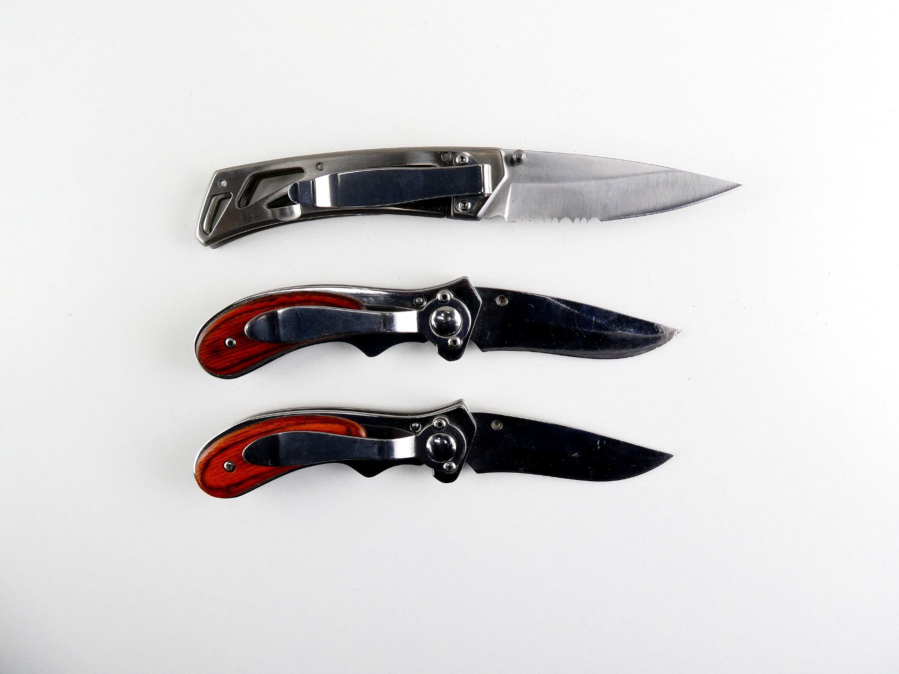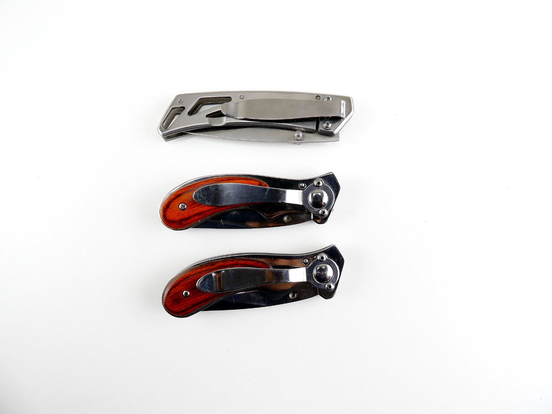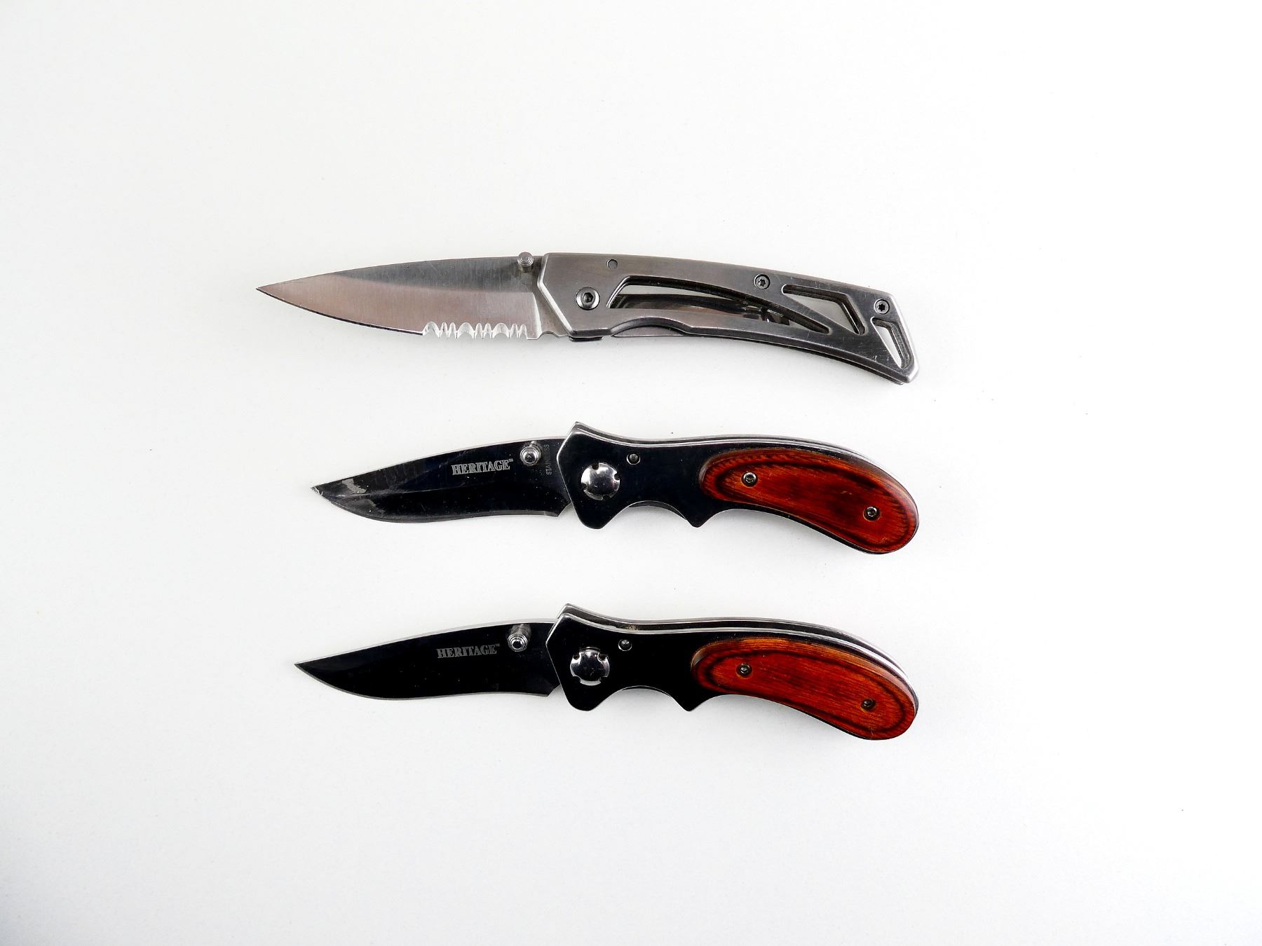 LOT INCLUDES; (3) FOLDING BLADE KNIVES, VARIOUS MANUFACTURERS INCLUDES HERITAGE / ETC., BLADES APPROX. 2.5"-2.75" & OAL'S APPROX. 6.25"-7". SEE PHOTOS.
