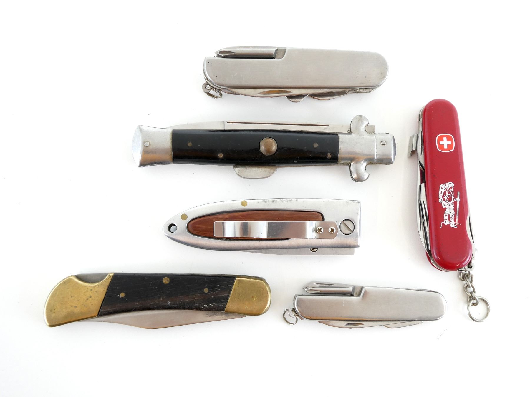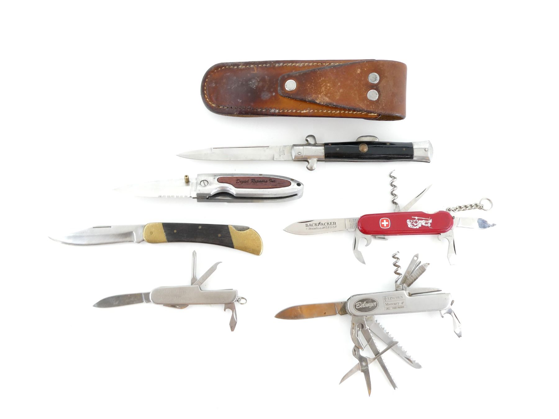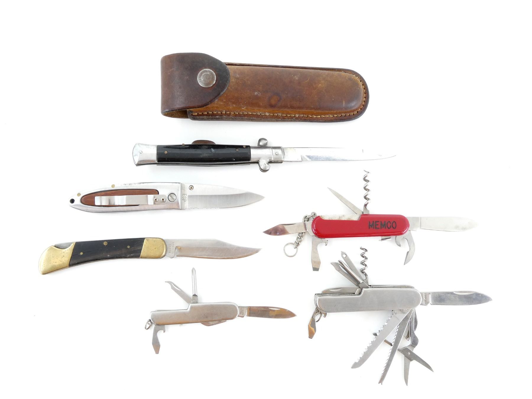 LOT INCLUDES; (1) SWISS ARMY STYLE MULTI-TOOL KNIFE, MARKED: "WENGER, DELEMONT, SWITZERLAND" ETC., VARIOUS OTHER MARKINGS, RED POLYMER HANDLE, WITH CORK SCREW, PICK, 2 BLADES, FLAT HEAD SCREWDRIVER, BOTTLE / CAN OPENER, BLADES APPROX. 2 5/8" & 1.75", (1) FOLDING KNIFE, STEEL BLADE, WOOD / BRASS HANDLE, BLADE APPROX. 3.25", (1) STAINLESS STEEL MULTI-TOOL KNIFE, VARIOUS MARKINGS, WITH FILE, CROSS POINT SCREW DRIVER, CAN OPENER, BOTTLE OPENER & KNIFE BLADE, BLADE APPROX. 2", (1) FOLDING KNIFE, STAINLESS STEEL / WOOD CONSTRUCTION, VARIOUS MARKINGS, SMOOTH & SERRATED EDGE, BELT CLIP, BLADE APPROX. 2.75", (1) STAINLESS STEEL MULTI-TOOL KNIFE, VARIOUS MARKINGS, WITH FILE, CORK SCREW, CROSS POINT SCREW DRIVER, SCISSORS, SAW, CAN OPENER, BOTTLE OPENER, KNIFE BLADE, ETC., SAW BLADE APPROX. 2 5/8", KNIFE BLADE APPROX. 2.5" & (1) FOLDING KNIFE, STEEL BLADE, VARIOUS MARKINGS, BLACK 2-PIECE POLYMER HANDLE, BLADE APPROX. 4", WITH LEATHER SHEATH, SHOWS WEAR, BELT LOOP, SNAP CLOSURE. SEE PHOTOS.