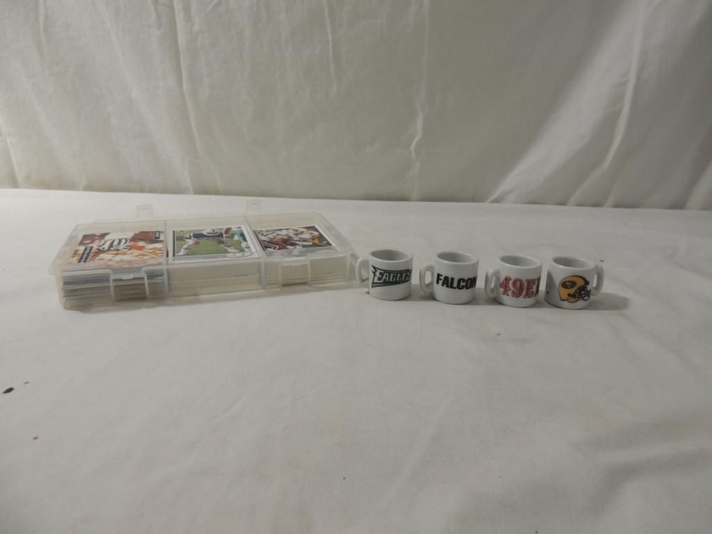 ASSORTED FOOTBALL PLAYER CARDS & FOUR MINI MUGS COLLECTIBLE AS SHOWN SEE PHOTO FOR MORE DETAILS.