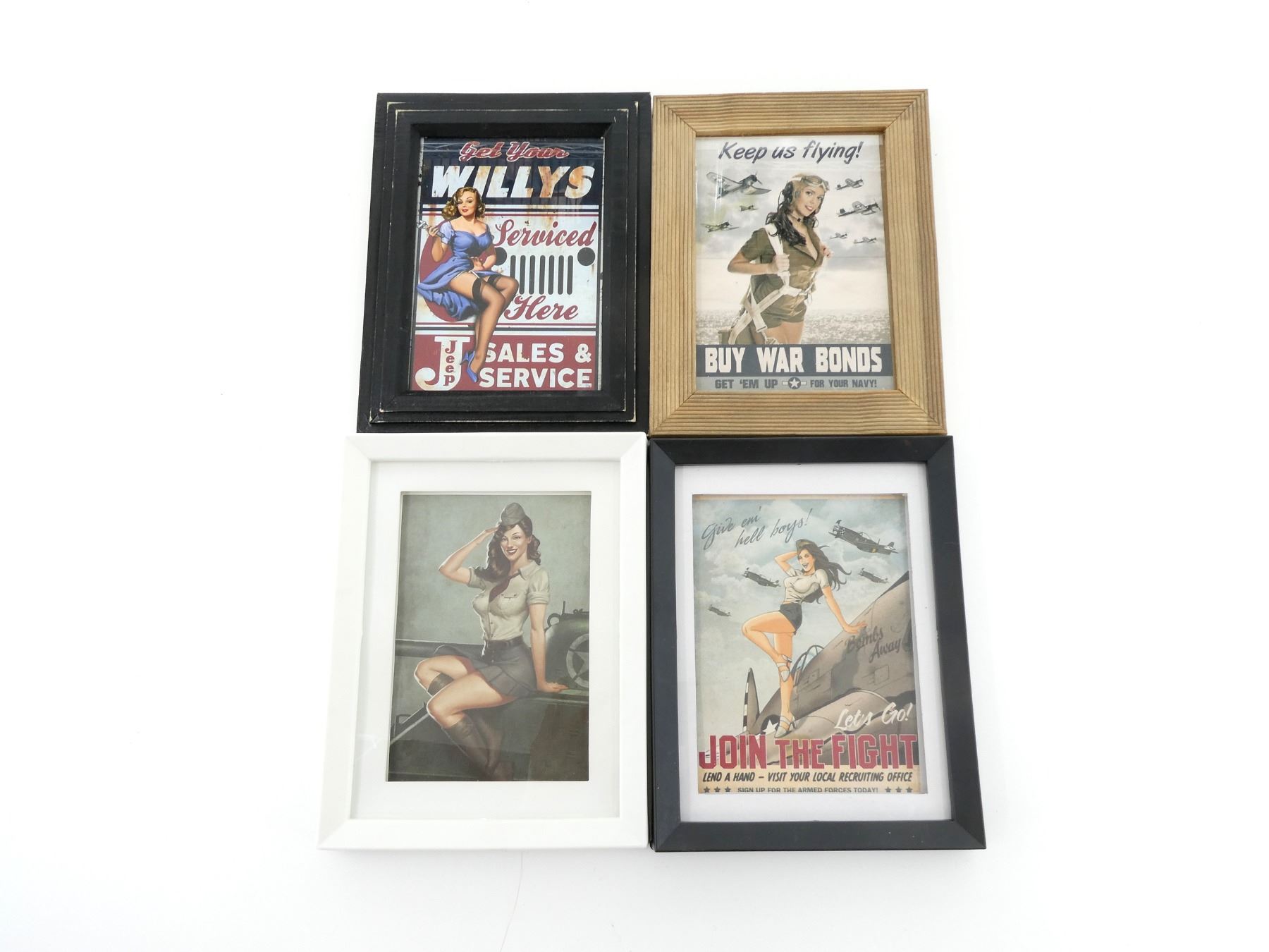 LOT INCLUDES; (1) "LET'S GO, JOIN THE FIGHT" FRAMED MINI POSTER, UNDER GLASS, APPROX. 8.75" X 6.75", (1) "JEEP SALES & SERVICE" FRAMED MINI POSTER, UNDER GLASS, APPROX. 8.75" X 6.75", (1) "KEEP US FLYING, BUY WAR BONDS" FRAMED MINI POSTER, UNDER GLASS, APPROX. 8.75" X 6.75" & (1) GIRL SITTING ON TANK FRAMED MINI POSTER, UNDER GLASS, APPROX. 8 7/8" X 6.75". SEE PHOTOS. *NO GUARANTEE ON GLASS FOR SHIPPING*