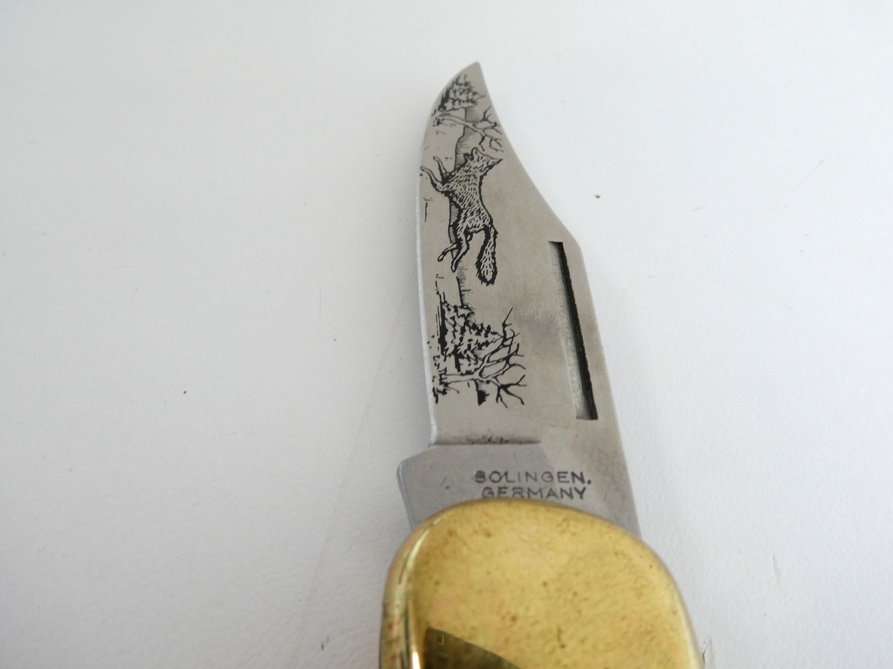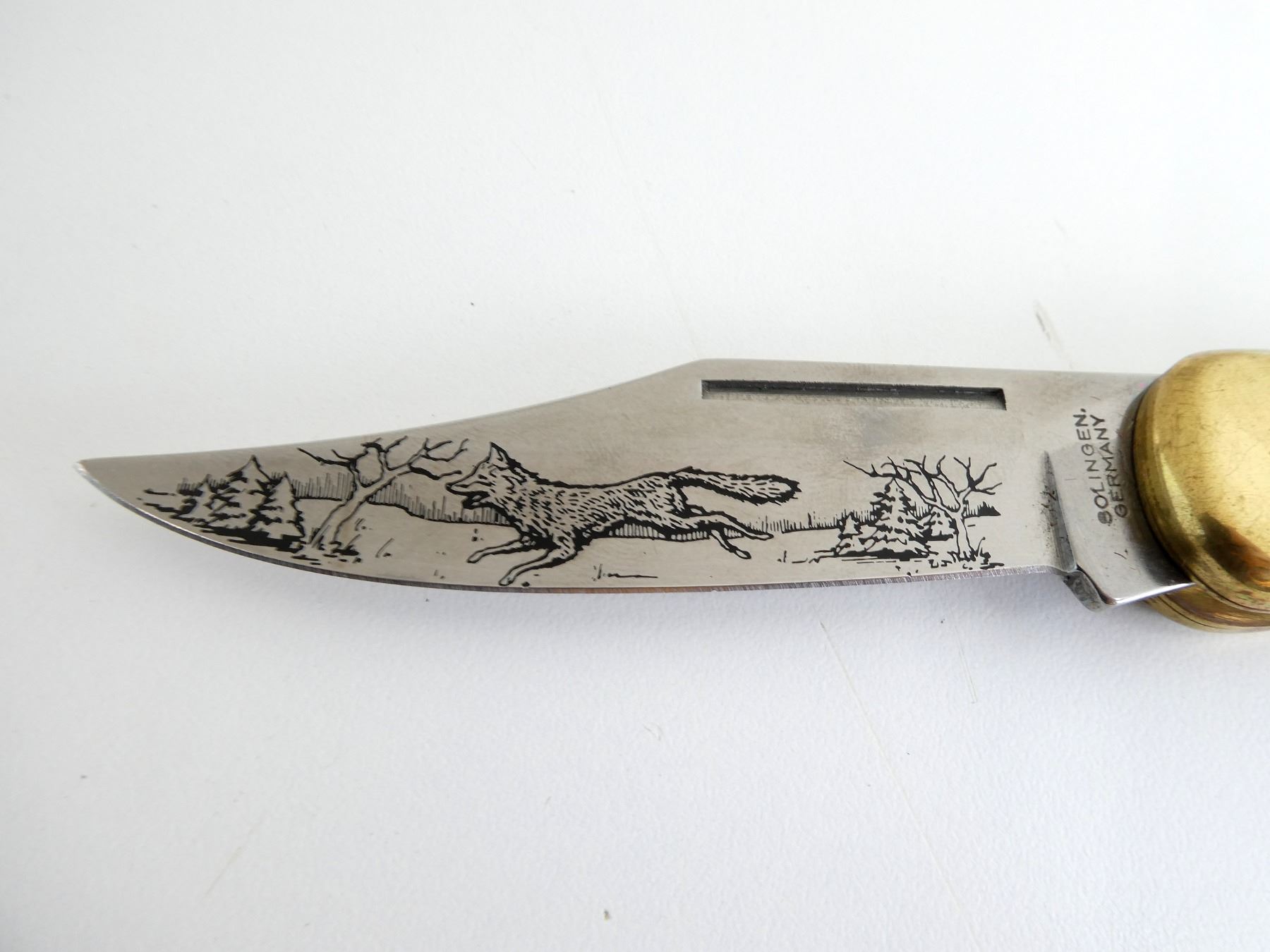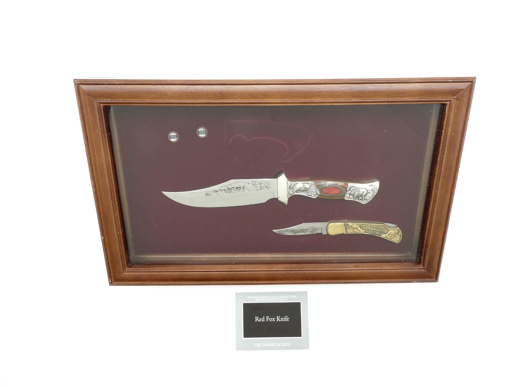 UNDER GLASS, LOT INCLUDES; (1) FRANKLIN MINT FIXED BLADE KNIFE, WILD BOARS ETCHED DESIGN ON BLADE, BLADE MARKED: "SOLINGEN, GERMANY", OTHER-SIDE MARKED: "C (COPYRIGHT) FM", DECORATIVE METAL / WOOD GRIP, TREES / WILD BOAR DESIGN ON METAL OF GRIP, NO SHEATH, BLADE APPROX. 6.5", OAL APPROX. 11 7/8", (1) FRANKLIN MINT FOLDING BLADE KNIFE WITH BOOKLET, FOX ETCHED DESIGN ON BLADE, BLADE MARKED: "SOLINGEN, GERMANY", OTHER-SIDE MARKED: "C (COPYRIGHT) FM", 2-PIECE BRASS GRIP WITH DECORATIVE FOX HEAD DESIGN, BLADE APPROX. 3.25", OAL APPROX. 7 3/8" & (1) GLASS DISPLAY CASE, WOOD / GLASS CONSTRUCTION, FELT LINED INSIDE, FITTED TO FRANKLIN MINT KNIVES WITH MAGNETS TO HOLD IN PLACE, LOCKABLE, MISSING KEY, MISSING THREE RUBBER FEET ON BOTTOM, APPROX. 18.5" X 11" X 3". SEE PHOTOS. *NO GUARANTEE ON GLASS FOR SHIPPING*