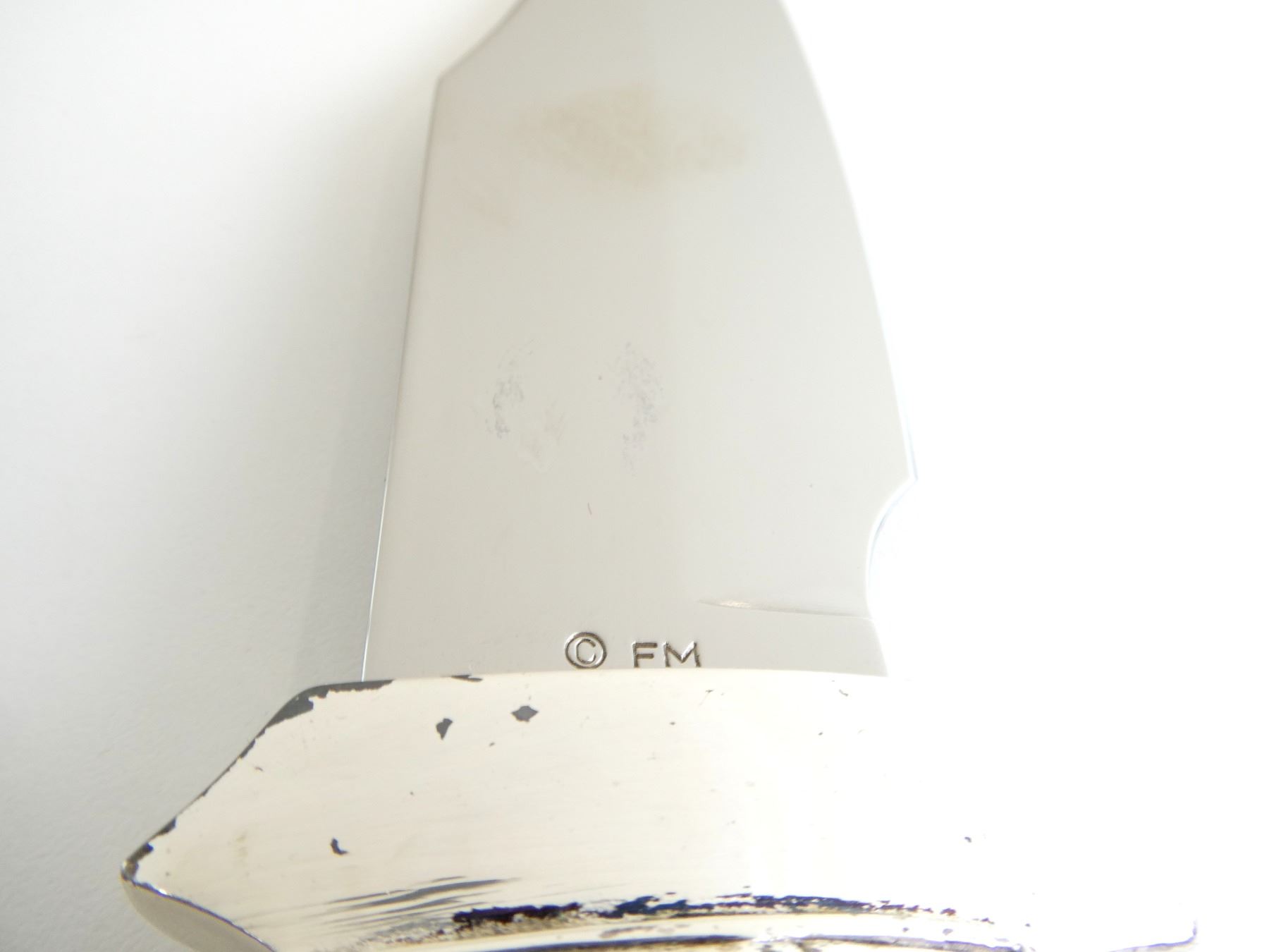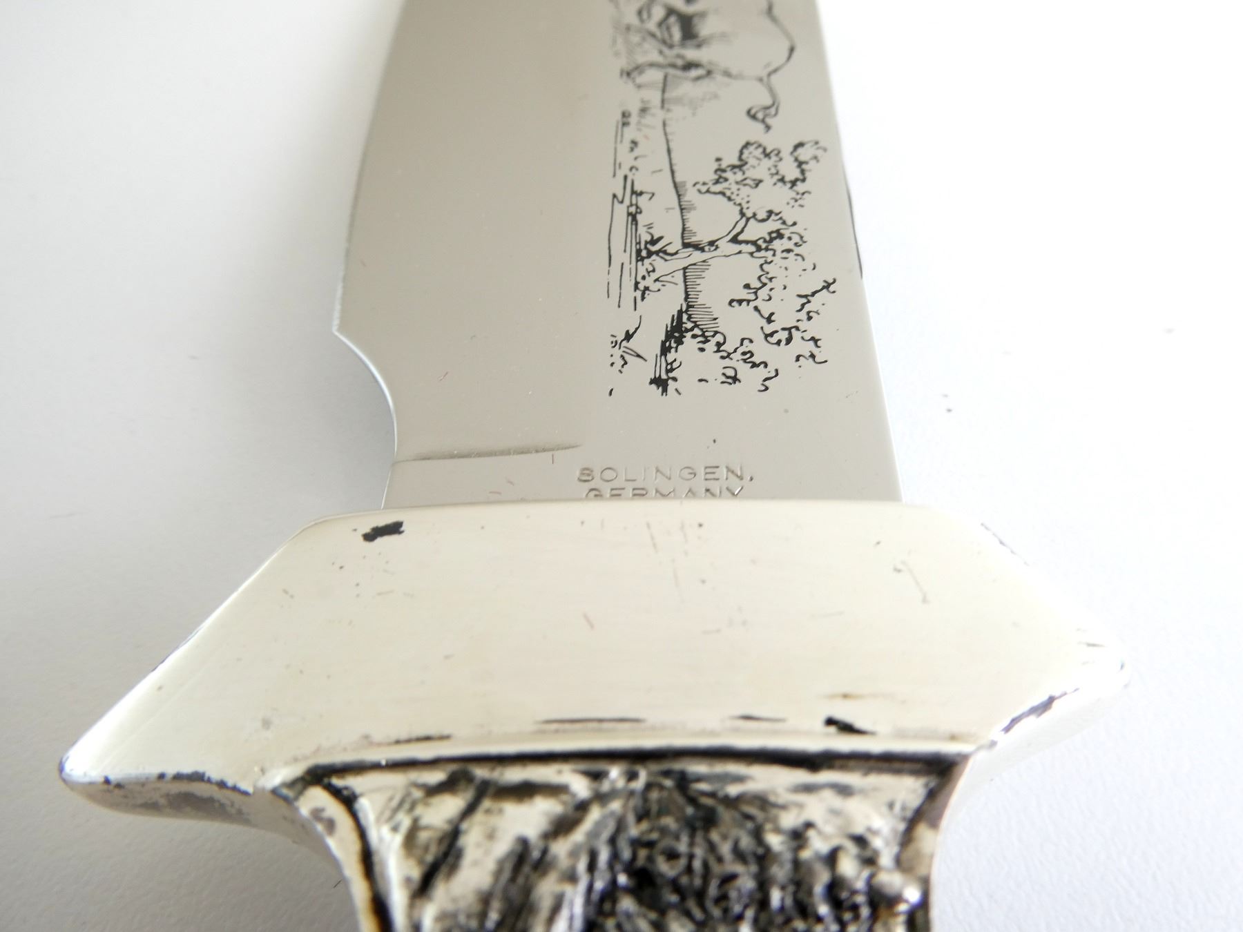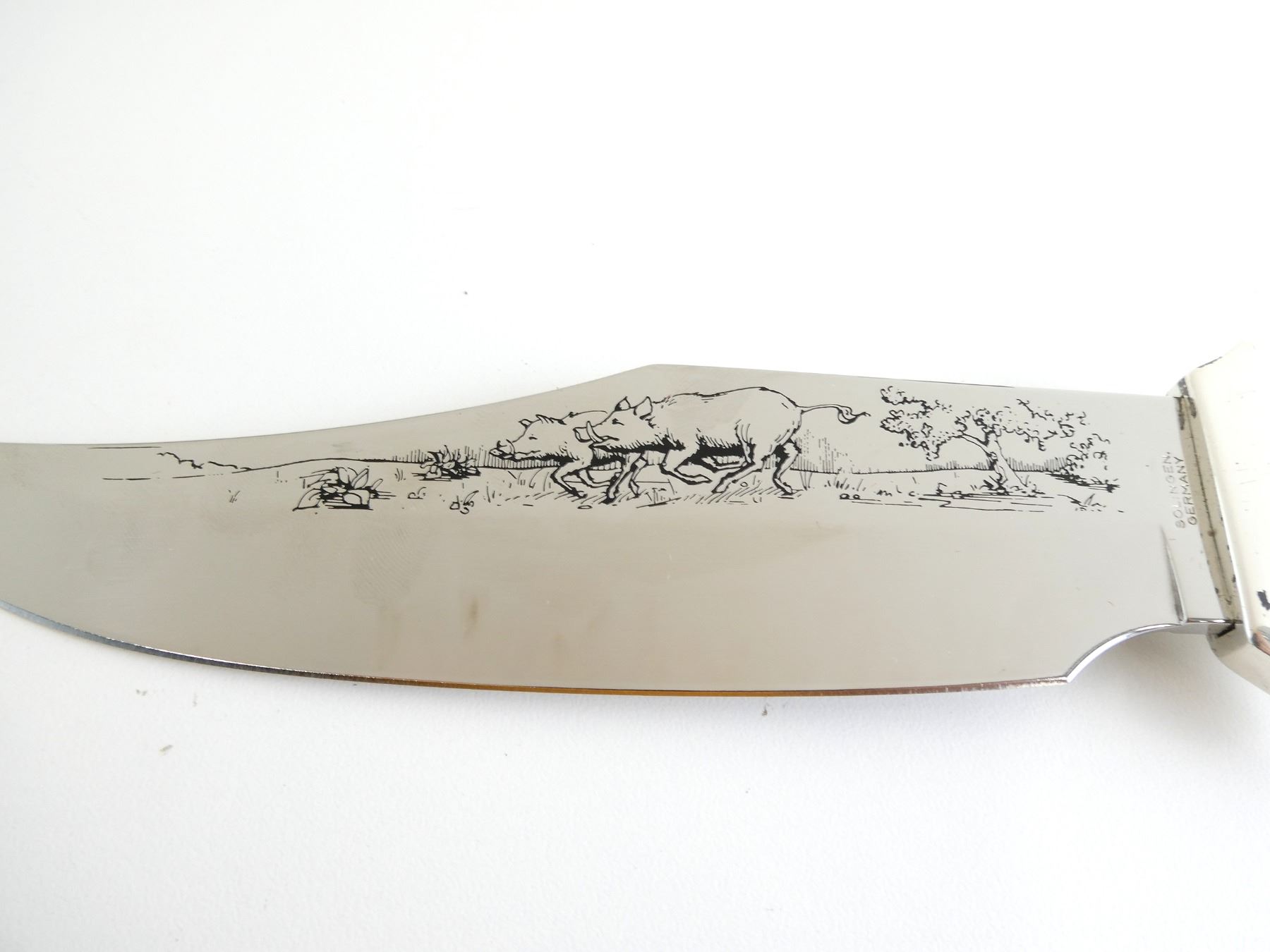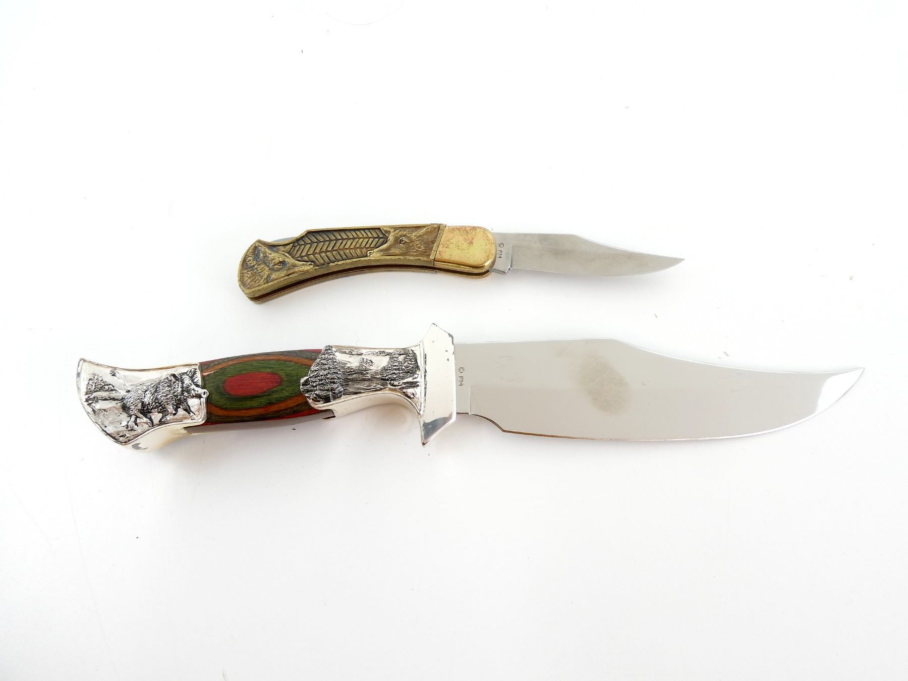 UNDER GLASS, LOT INCLUDES; (1) FRANKLIN MINT FIXED BLADE KNIFE, WILD BOARS ETCHED DESIGN ON BLADE, BLADE MARKED: "SOLINGEN, GERMANY", OTHER-SIDE MARKED: "C (COPYRIGHT) FM", DECORATIVE METAL / WOOD GRIP, TREES / WILD BOAR DESIGN ON METAL OF GRIP, NO SHEATH, BLADE APPROX. 6.5", OAL APPROX. 11 7/8", (1) FRANKLIN MINT FOLDING BLADE KNIFE WITH BOOKLET, FOX ETCHED DESIGN ON BLADE, BLADE MARKED: "SOLINGEN, GERMANY", OTHER-SIDE MARKED: "C (COPYRIGHT) FM", 2-PIECE BRASS GRIP WITH DECORATIVE FOX HEAD DESIGN, BLADE APPROX. 3.25", OAL APPROX. 7 3/8" & (1) GLASS DISPLAY CASE, WOOD / GLASS CONSTRUCTION, FELT LINED INSIDE, FITTED TO FRANKLIN MINT KNIVES WITH MAGNETS TO HOLD IN PLACE, LOCKABLE, MISSING KEY, MISSING THREE RUBBER FEET ON BOTTOM, APPROX. 18.5" X 11" X 3". SEE PHOTOS. *NO GUARANTEE ON GLASS FOR SHIPPING*