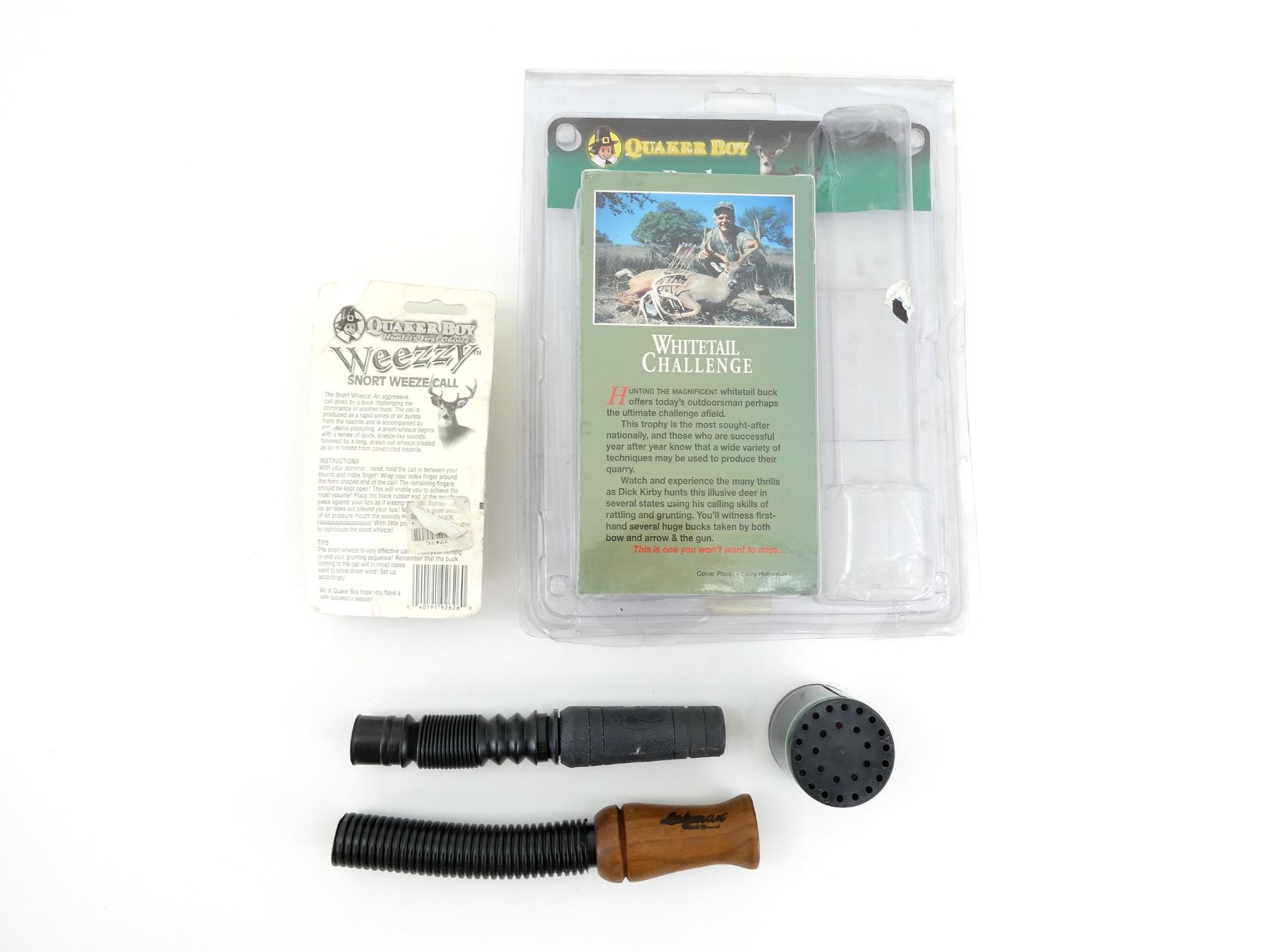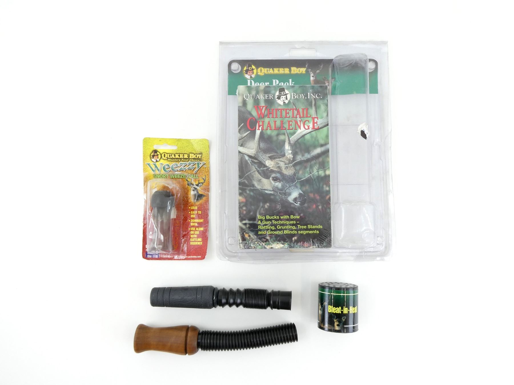 LOT INCLUDES; (1) LOHMAN DEER GRUNT CALL, PLASTIC / WOOD CONSTRUCTION, VARIOUS MARKINGS, OAL APPROX. 7 5/8", (1) QUAKER BOY WEEZZY SNORT WEEZE CALL, WITH ORIGINAL PACKAGING, OAL APPROX. 3" & (1) QUAKER BOY DEER PACK, WITH BLEAT-IN-HEAT CALL, BLACK PLASTIC MOUTH GAME CALL & UN-OPENED VHS TAPE, IN ORIGINAL PACKAGING. SEE PHOTOS.