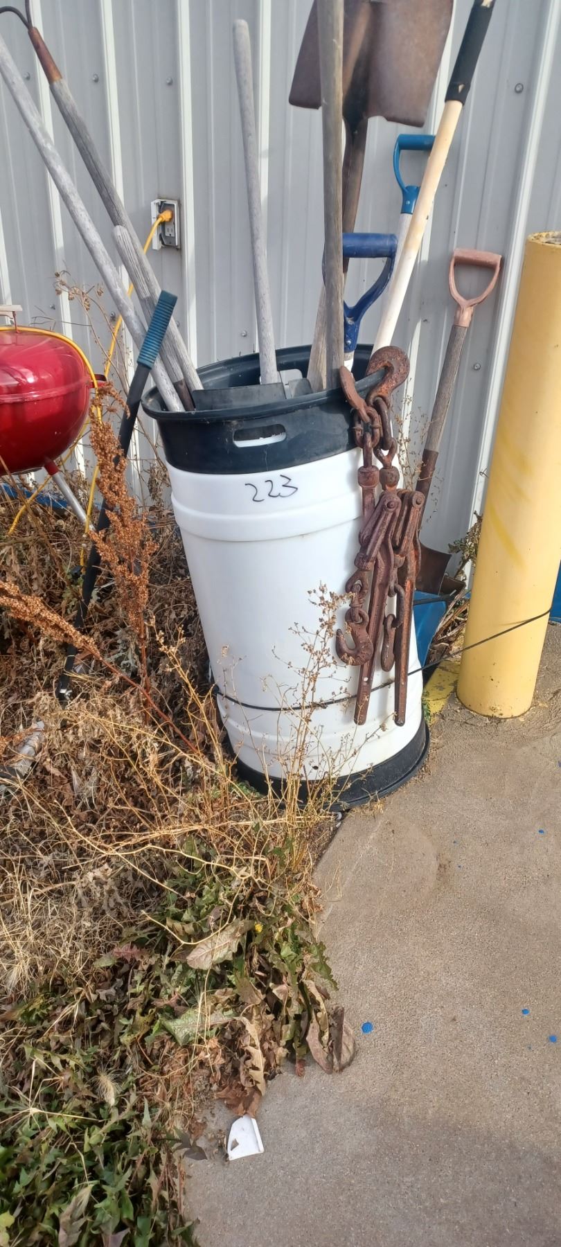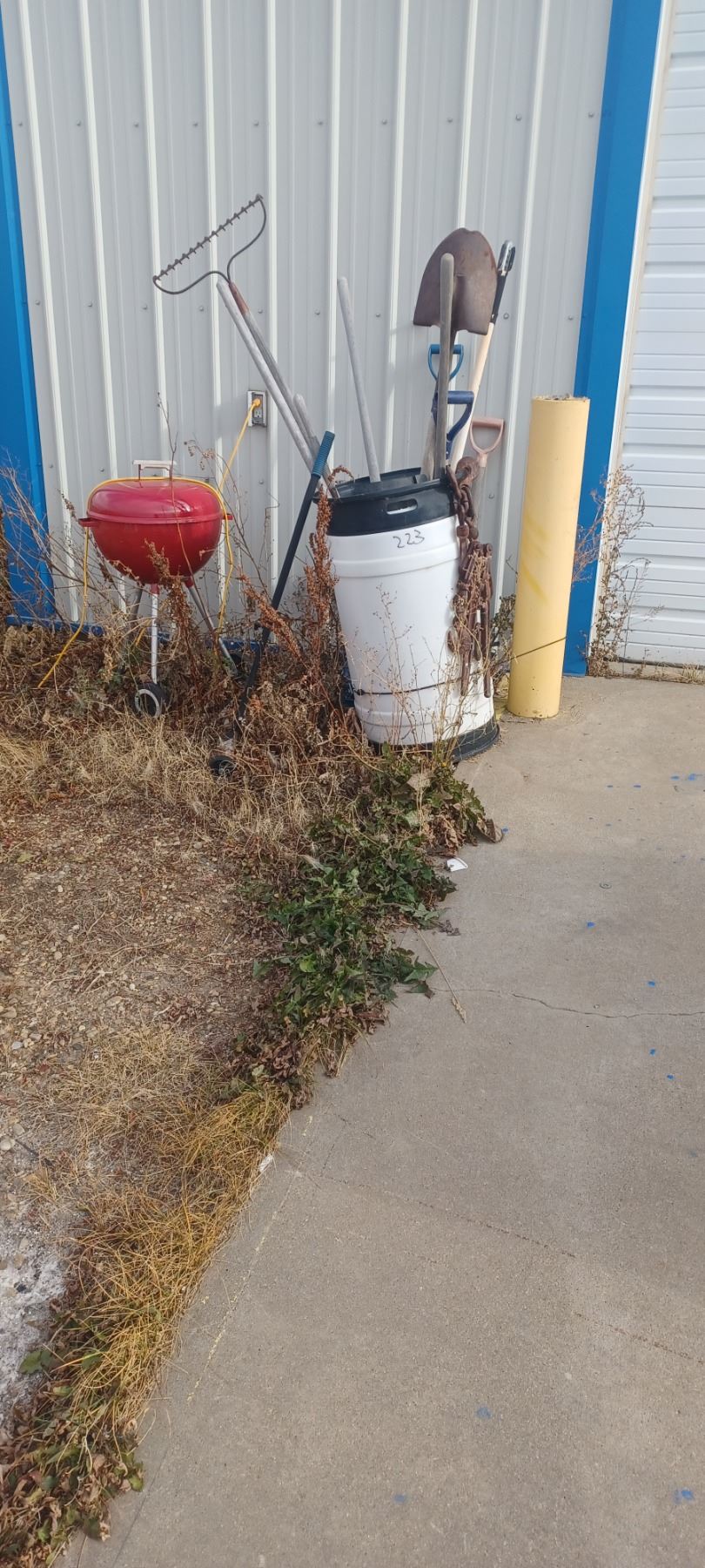 ASSORTED GARDEN TOOLS, BBQ, RAIN BARREL AND CHAIN BOOMERS
