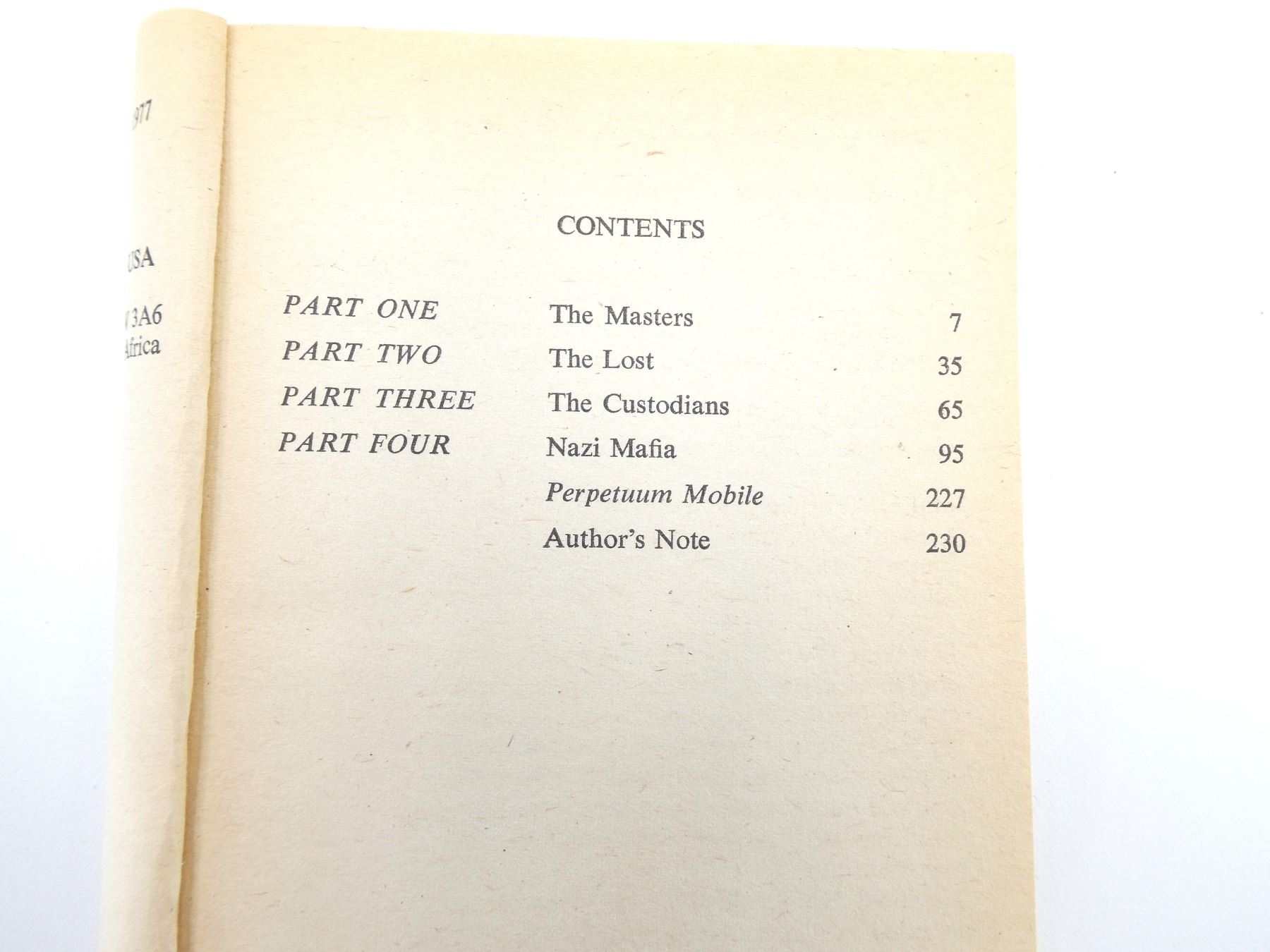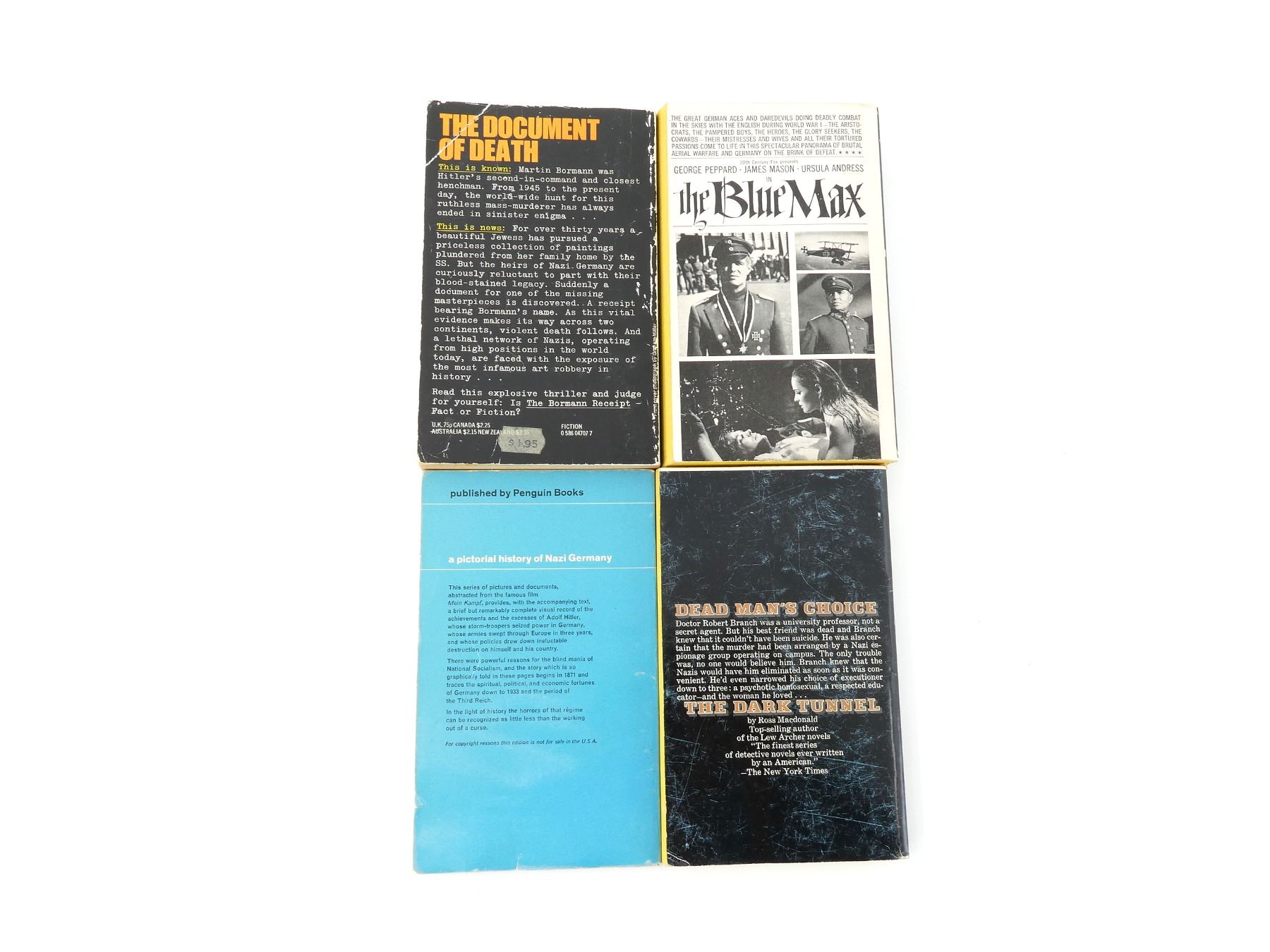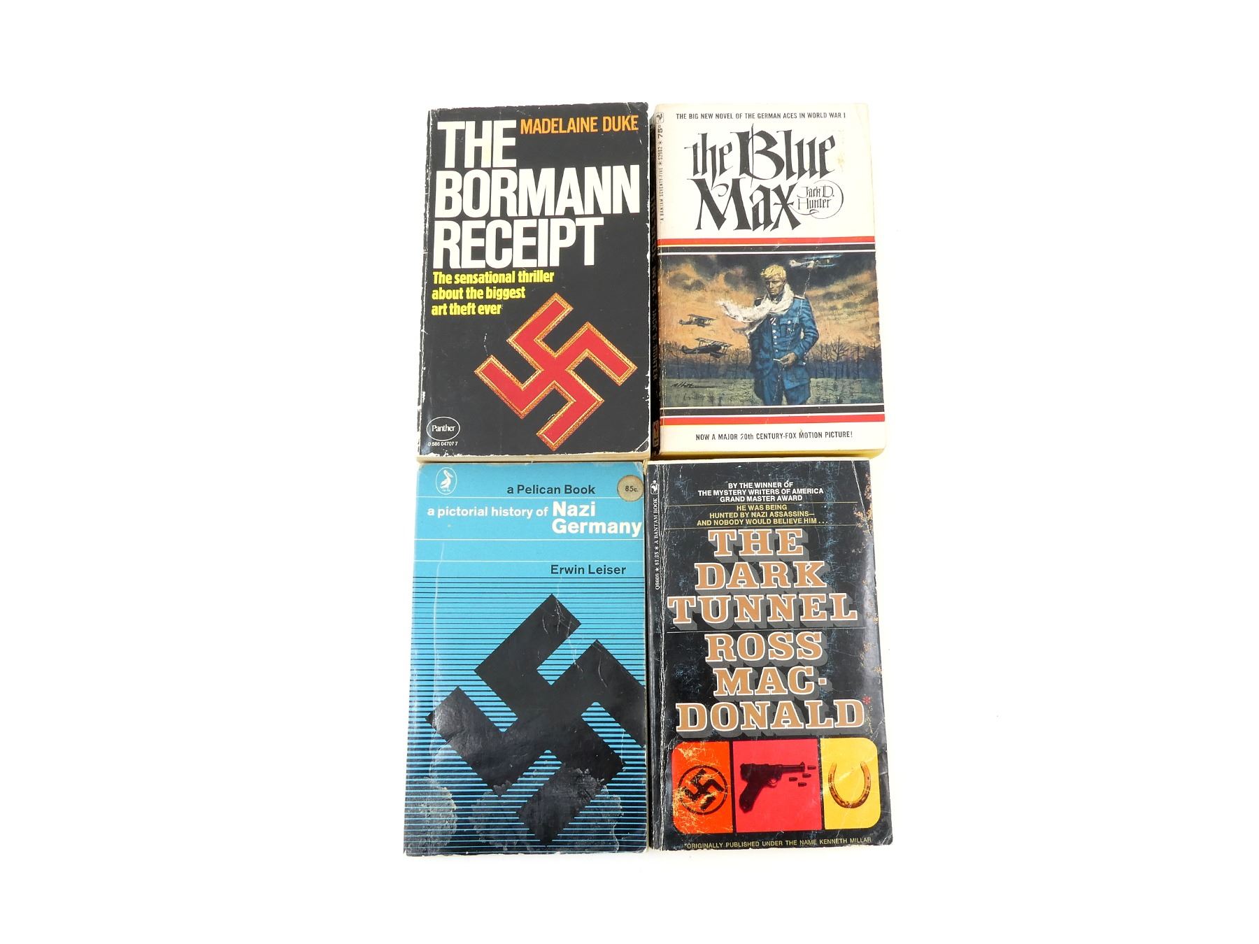 SOFT COVERS, LOT INCLUDES; (1) "A PICTORAL HISTORY OF NAZI GERMANY" BOOK BY ERWIN LEISER, COPYRIGHT 1962, (1)"THE BLUE MAX" BOOK BY JACK D. HUNTER, COPYRIGHT 1964, (1) "THE DARK TUNNEL" BOOK BY ROSS MACDONALD, COPYRIGHT 1944 & (1) "THE BORMANN RECEIPT" BOOK BY MADELAINE DUKE, COPYRIGHT 1977. SEE PHOTOS.