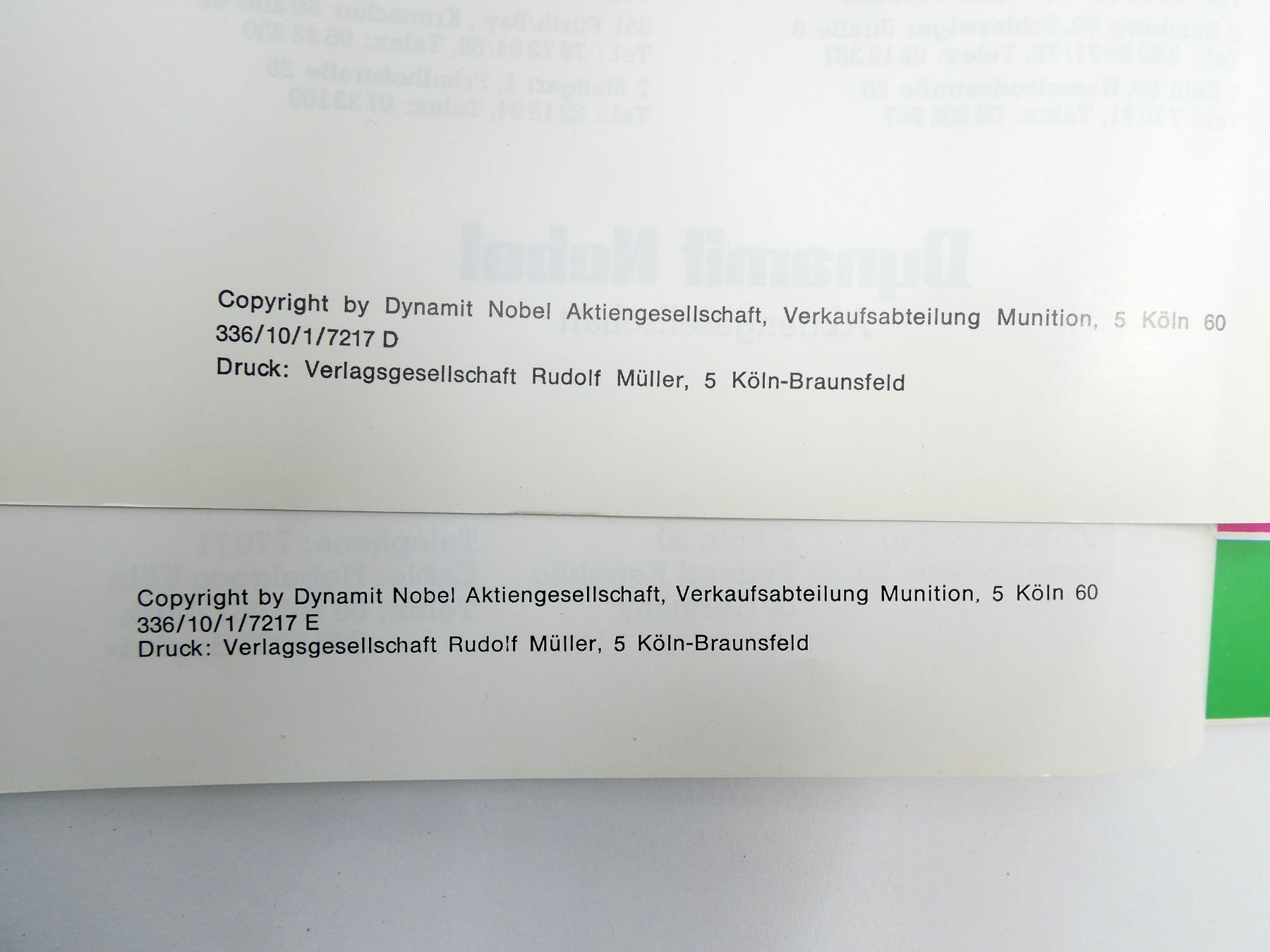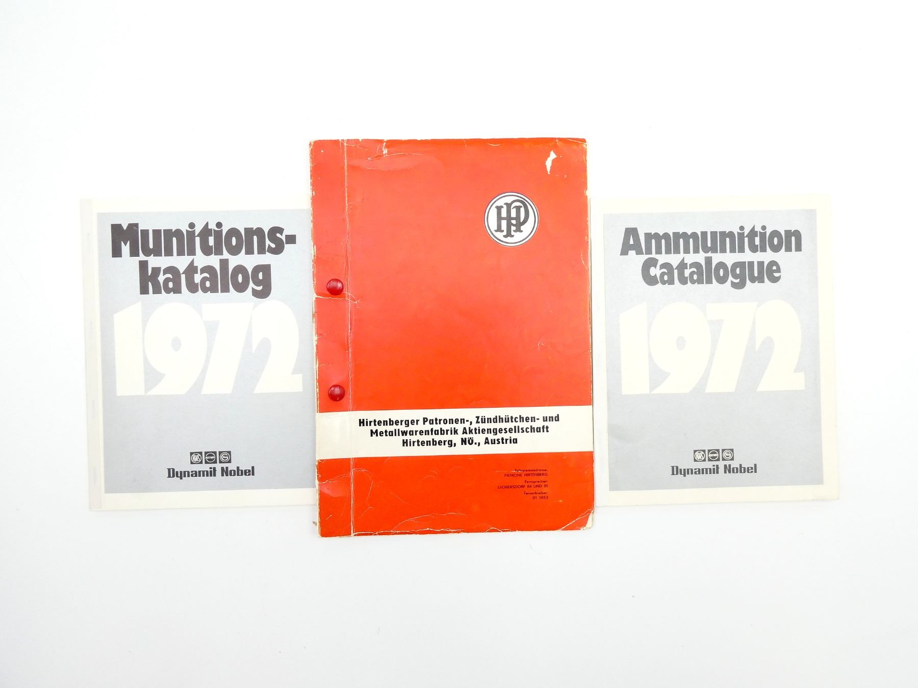 SOFT COVERS, LOT INCLUDES; "HIRTENBERGER PATRONEN-, ZUNDHUTCHEN- UND METALLWARENFABRIK AKTIENGESELLSCHAFT" CATALOGUE DATED 1958, IN GERMAN/ENGLISH, (1) "MUNITIONS- KATALOG 1972" CATALOGUE BY DYNAMIT NOBEL, IN GERMAN & (1) "AMMUNITION CATALOGUE 1972" CATALOGUE BY DYNAMIT NOBEL, IN ENGLISH. SEE PHOTOS.