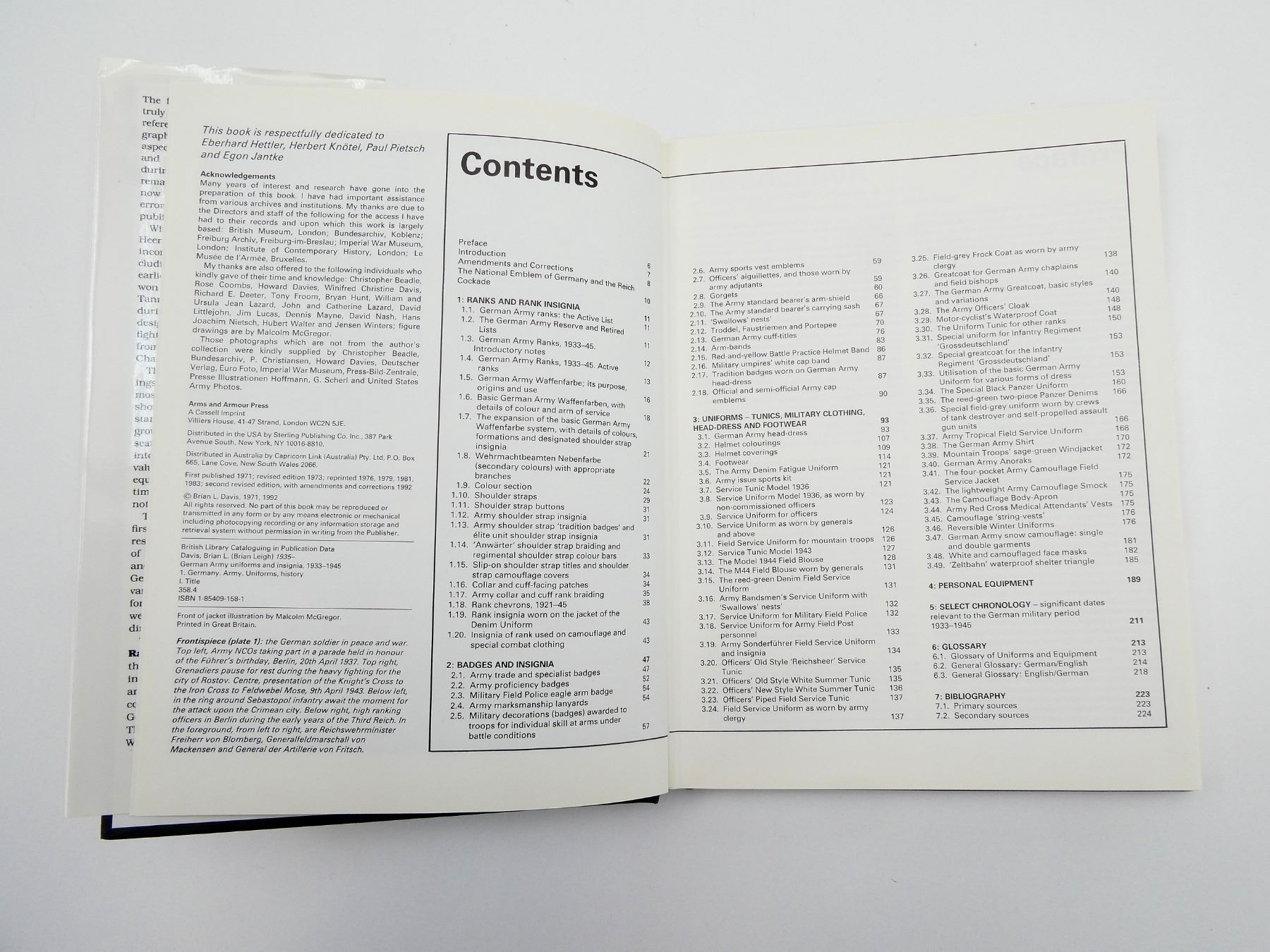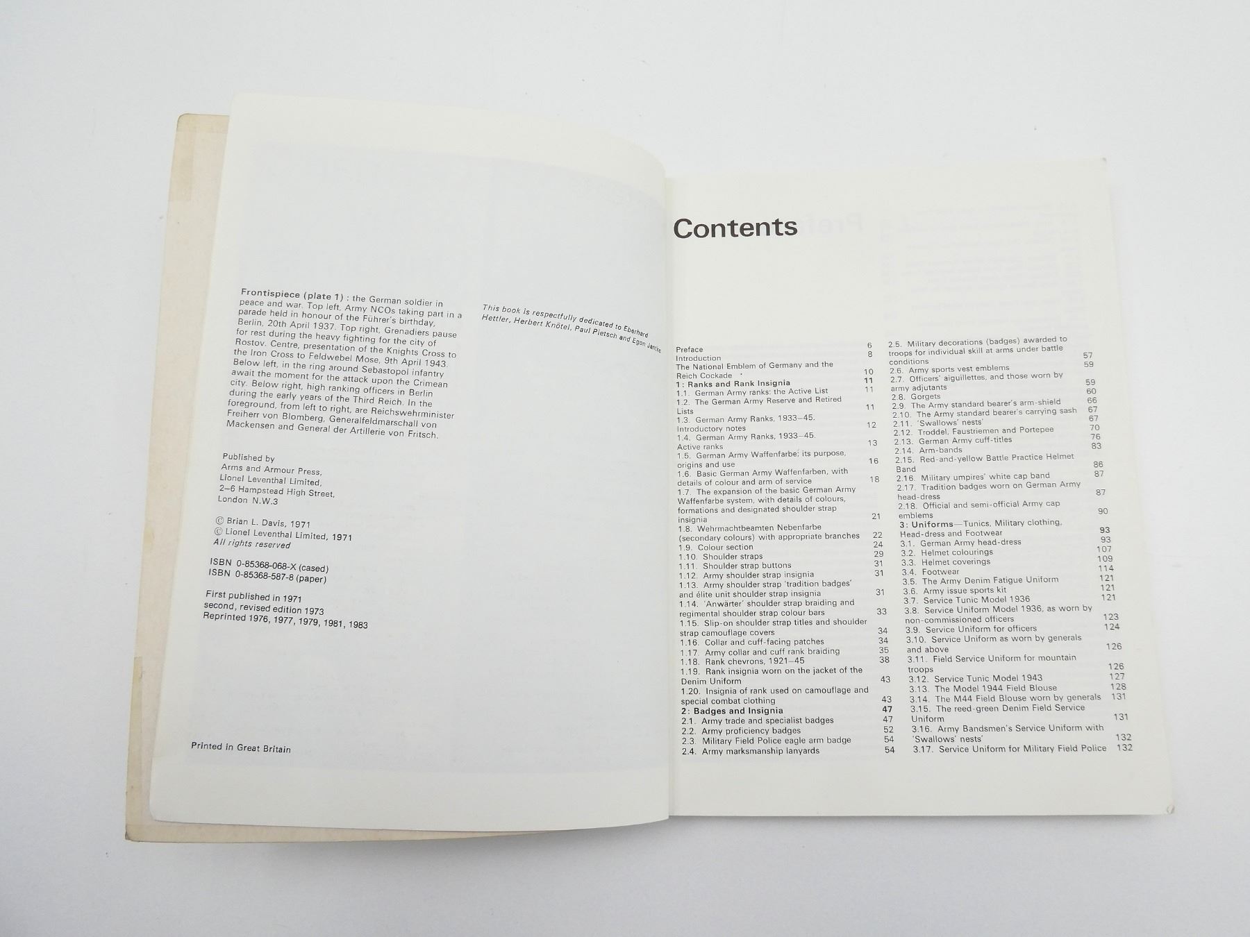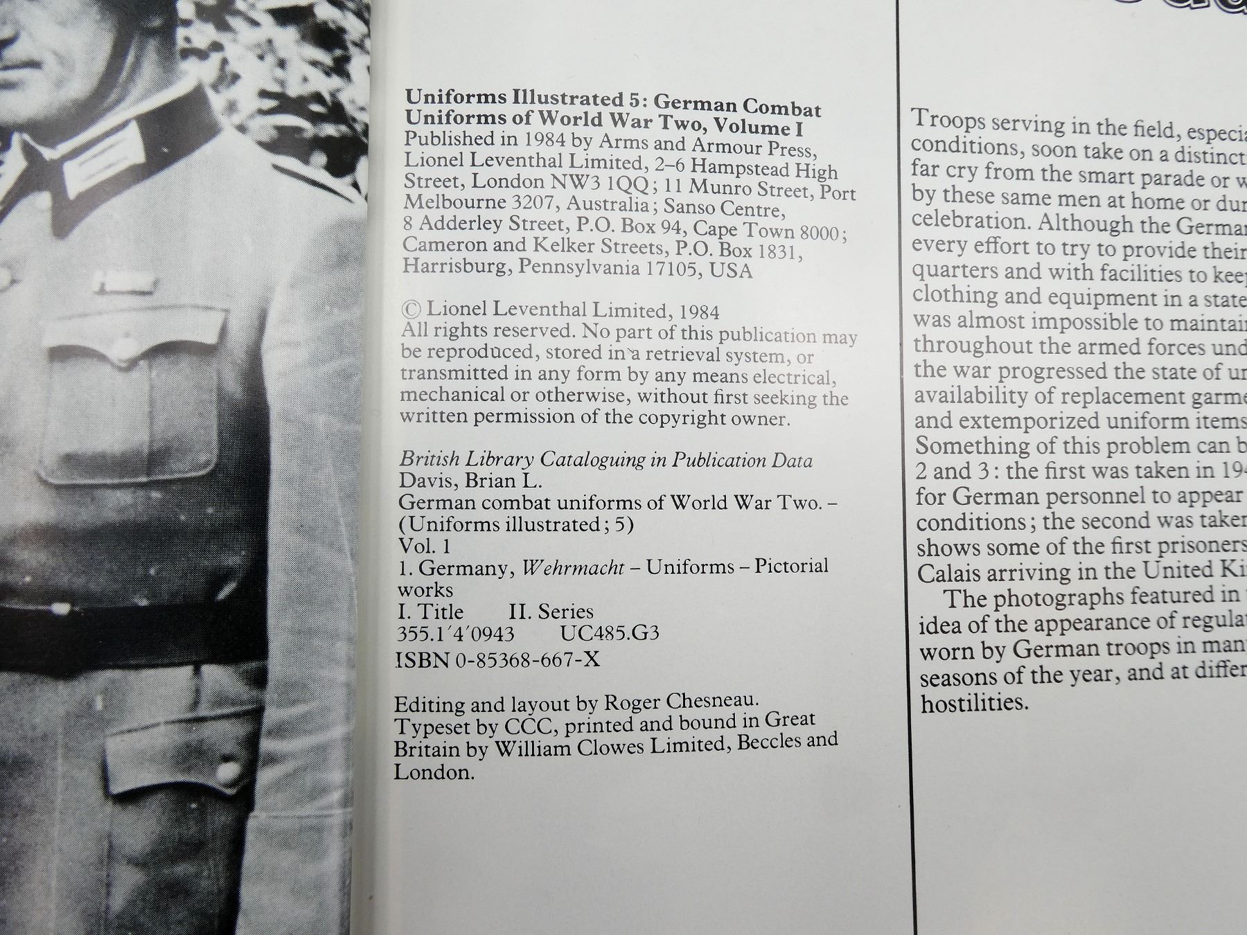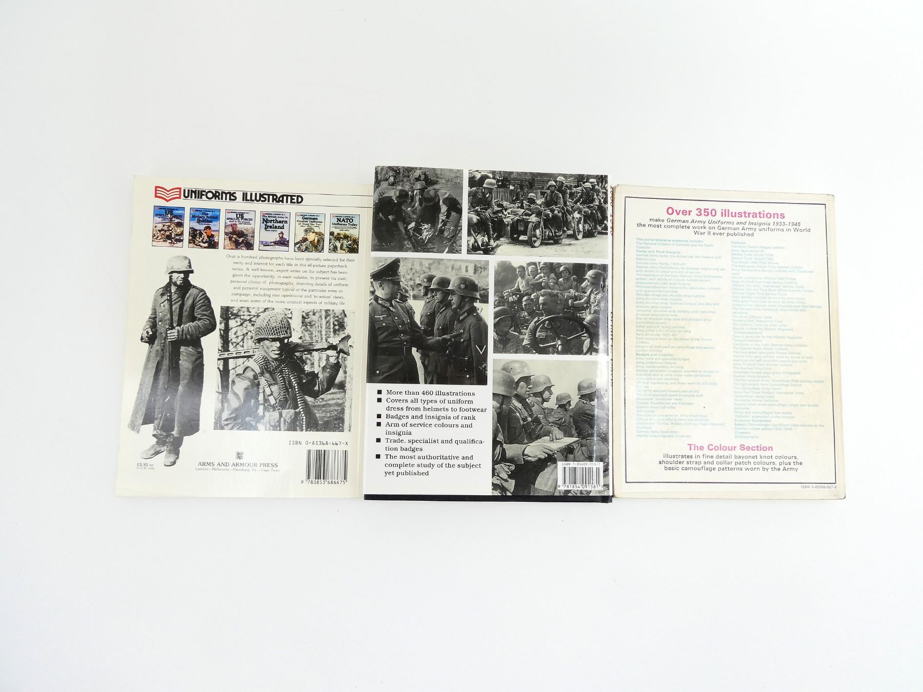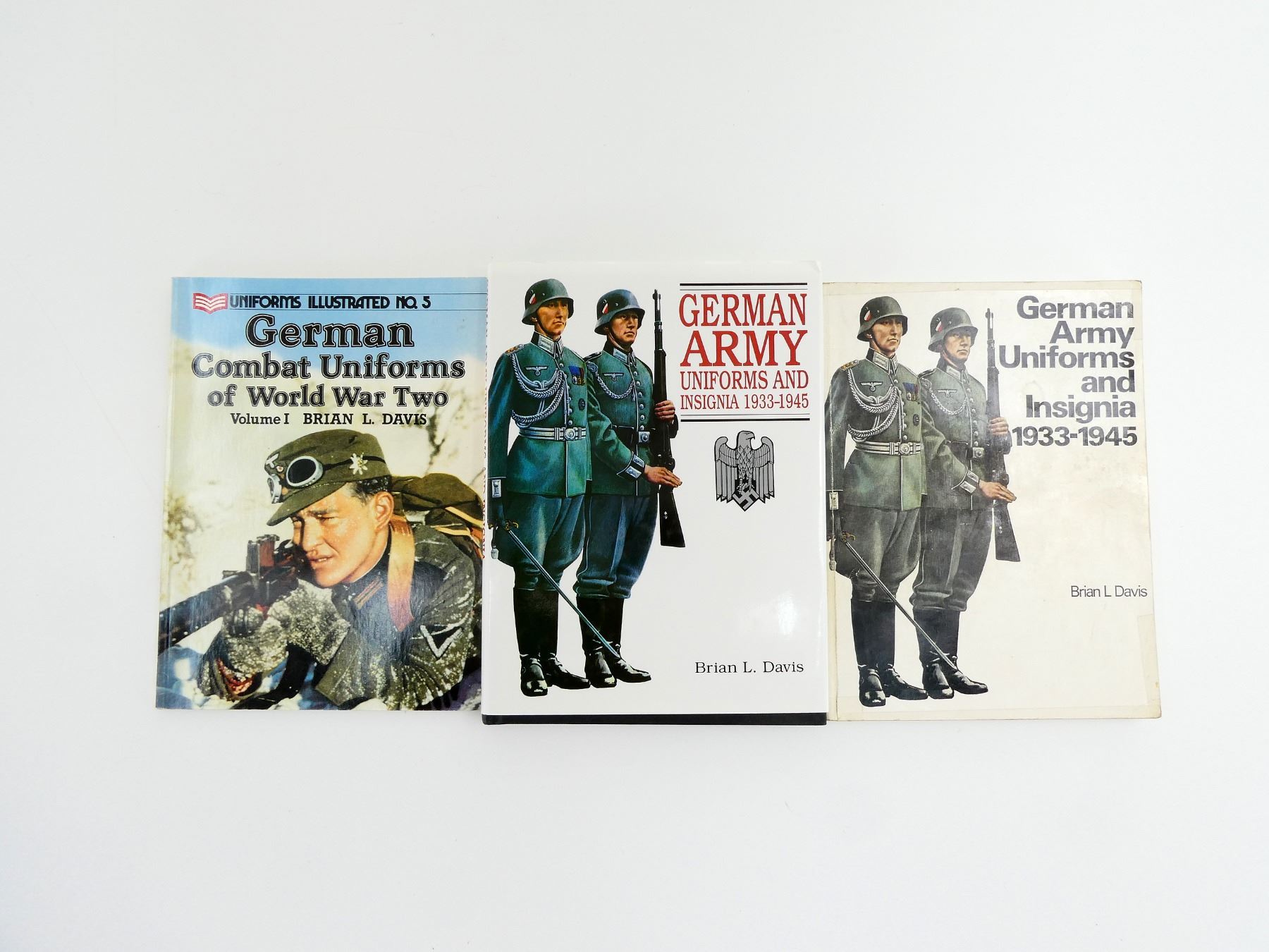 BY BRIAN L DAVIS, LOT INCLUDES; (1) "GERMAN ARMY UNIFORMS AND INSIGNIA 1933-1945" BOOK, SOFT COVER, ISBN: 0-85368-587-8, (1) "GERMAN ARMY UNIFORMS AND INSIGNIA 1933-1945" BOOK, HARD COVER WITH DUST COVER, ISBN: 1-85409-158-1 & (1) "GERMAN COMBAT UNIFORMS OF WORLD WAR TWO, VOLUME I" BOOK, SOFT COVER, ISBN: 0-85368-667-X. SEE PHOTOS.