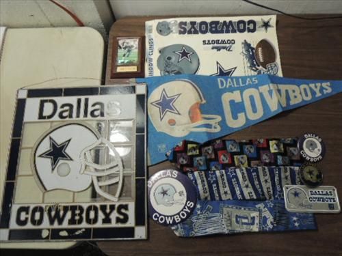 ASSORTED GROUP DALLAS COWBOY COLLECTIBLES: PENNANT, STICKERS, MEN'S TIES, PINS, HANGING GLASS SIGN AND MORE. AS SHOWN. VIEW PICTURE FOR DETAIL.