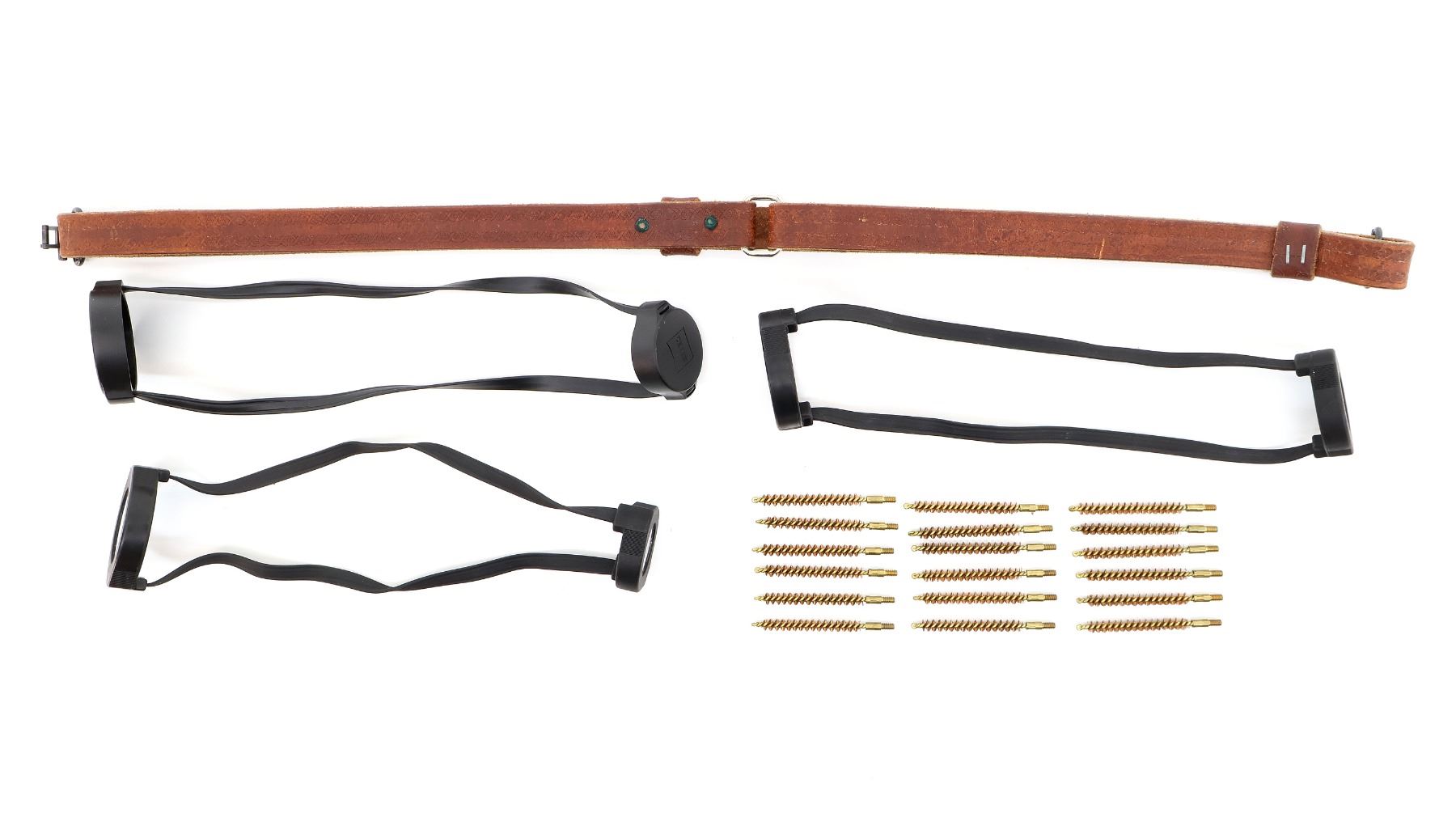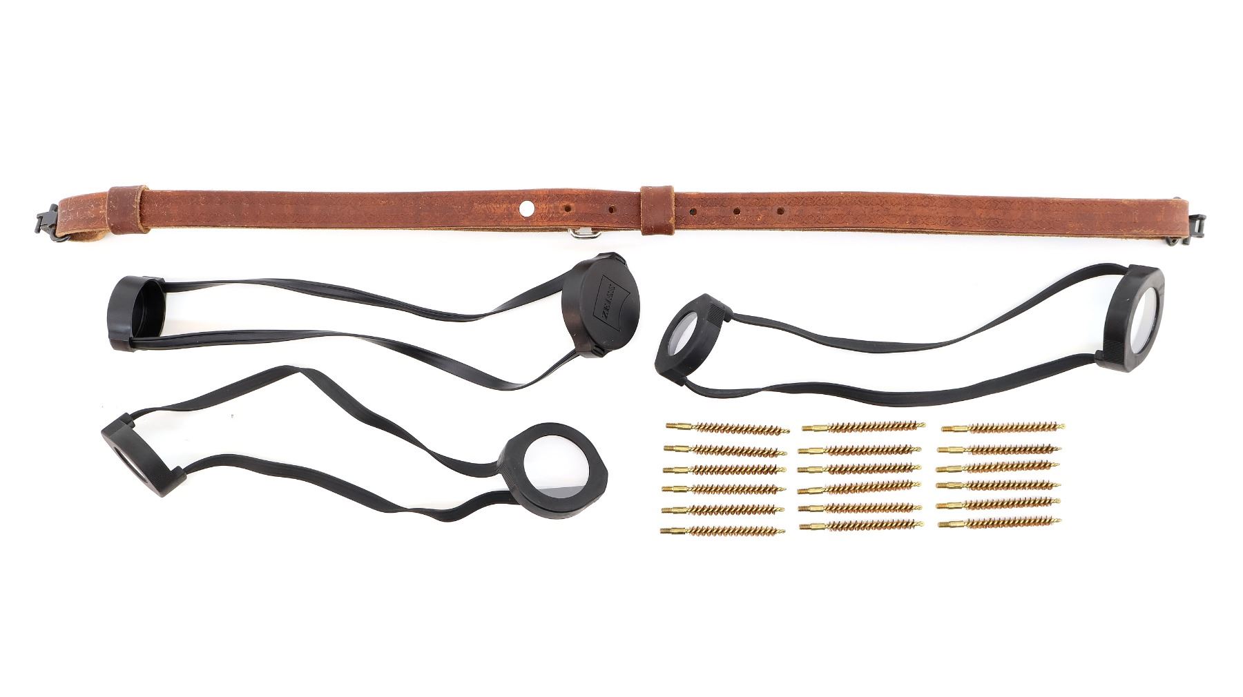 LOT INCLUDES; (1) UNKNOWN BROWN LEATHER SLING, ENGRAVED DESIGN, SLING SWIVELS ATTACHED, OVERALL LENGTH APPROX. 30", (1) PACK OF 17 "NO-HARM BRASS CORE" BRONZE CLEANING BRUSHES, 6.5-.264 RIFLE, 8/32 THREADS, (1) ZEISS SCOPE LENS COVERS & (2) SWAROVSKI OPTIK SCOPE LENS COVERS, ETC. SEE PHOTOS.