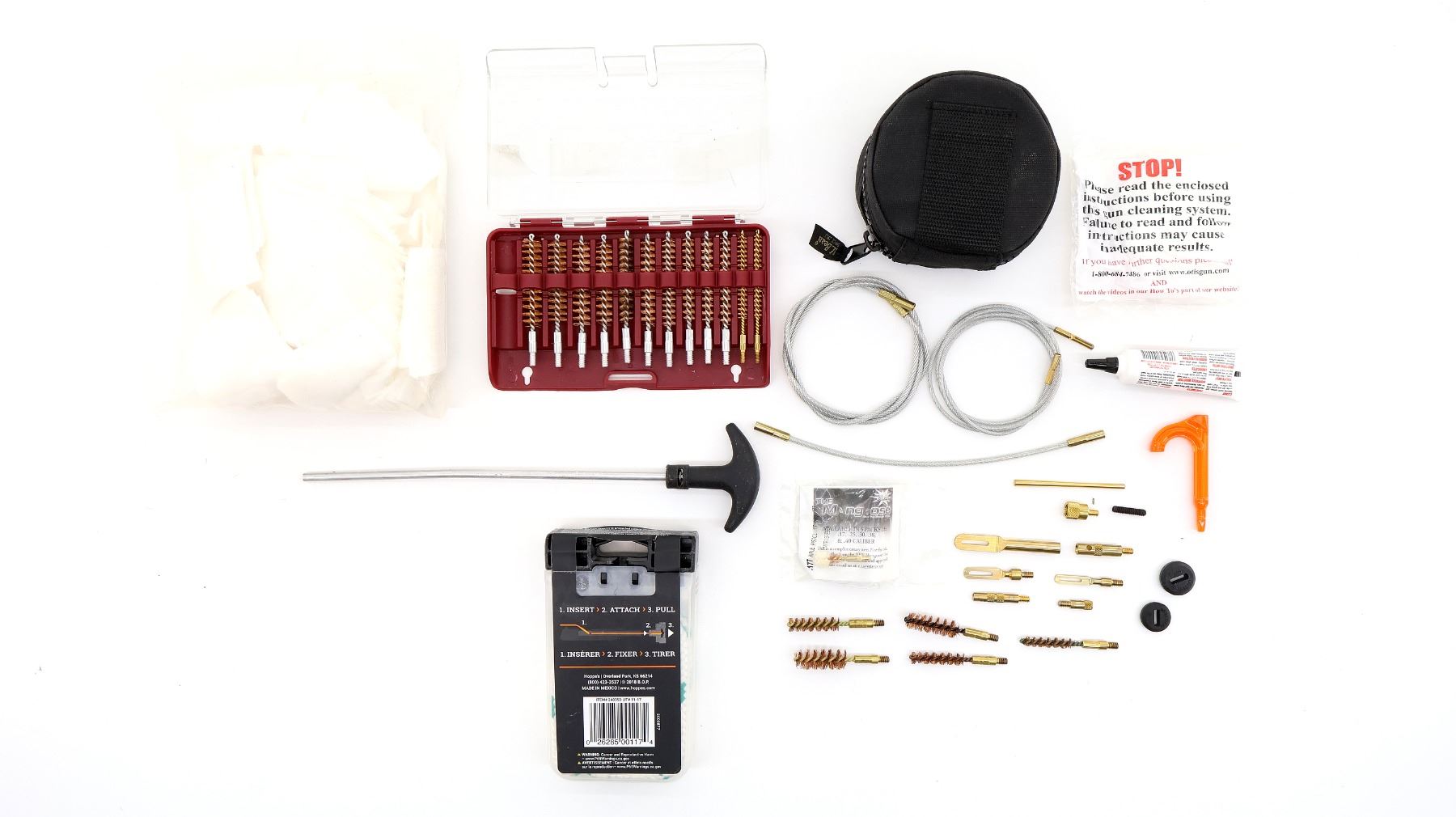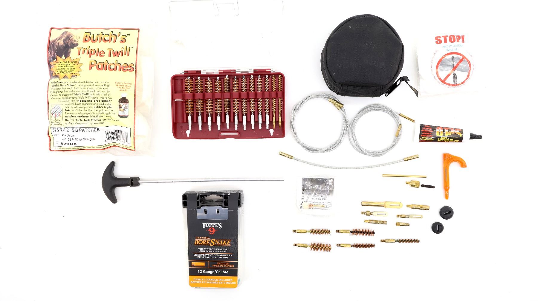 LOT INCLUDES; (1) OTIS CLEANING KIT, INCLUDES; BRUSHES, BORE SNAKE, JAGS, PATCHES, ETC., IN COMPACT CARRY CASE, APPEARS NEW OLD STOCK, (1) HOPPE'S BORE SNAKE, FOR SHOTGUN, 12 GAUGE, CASE & T-HANDLE INCLUDED, NEW OLD STOCK, SEALED IN ORIGINAL PACKAGING, (1) UNKNOWN CLEANING ROD, (1) SET OF TIPTON GUN CLEANING BRUSHES, MAY NOT BE COMPLETE / PIECES MAY BE MISSING & (1) PACK OF BUTCH'S TRIPLE TWILL PATCHES, MAY NOT BE COMPLETE / PIECES MAY BE MISSING. SEE PHOTOS.