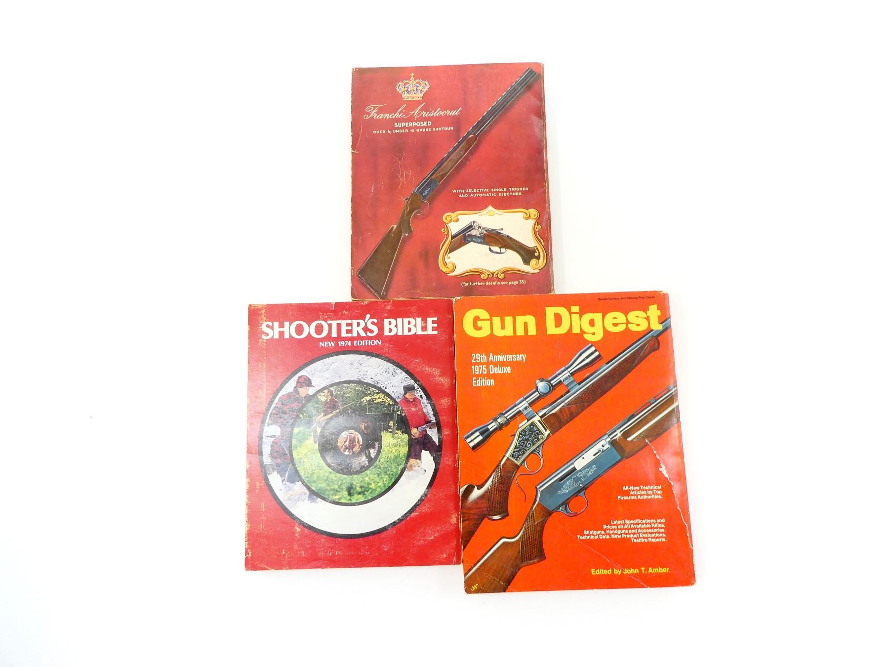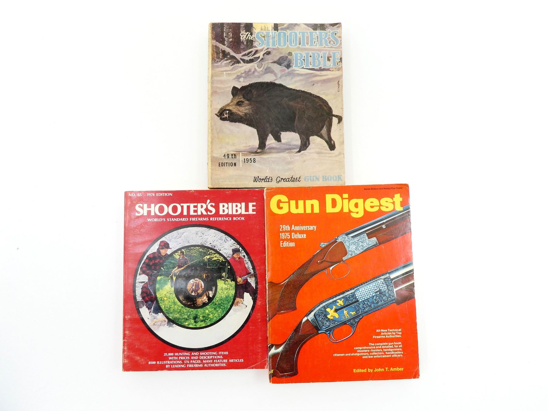 SOFT COVERS, LOT INCLUDES; (1) "GUN DIGEST 29TH ANNIVERSARY 1975 DELUXE EDITION" CATALOGUE EDITED BY JOHN T. AMBER, ISBN: 0-695-80498-7, (1) "THE SHOOTER'S BIBLE 49TH EDITION 1958" CATALOGUE PUBLISHED BY STOEGER ARMS CORPORATION, COPYRIGHT 1957 & (1) "SHOOTER'S BIBLE NO. 65 1974 EDITION" CATALOGUE EDITED BY ROBERT KOUMJIAN, ISBN: 0695-80393-X. SEE PHOTOS.