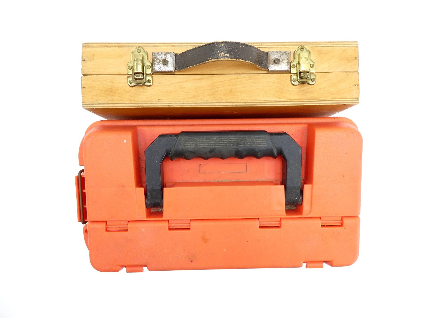 LOT INCLUDES; (1) WOODEN GUN HOBBYIST CASE, BRASS LATCH CLOSURE, LEATHER CARRY HANDLE, APPROX. 12.5" X 6.5" X 3", WITH METAL CLEANING ROD, OAL APPROX. 8", VARIOUS WIRE BRUSHES, PULL THRU, FLAD HEAD SCREW DRIVERS, JAG, ETC. & (1) ORANGE PLASTIC PLANO CLEANING KIT, APPROX. 15" X 8" X 6.75", WITH CLEANING PATCHES, VARIOUS ALLEN KEYS, VARIOUS HOPPE'S CLEANING RODS (ALL INCOMPLETE), OAL'S APPROX. 11 5/8" TO 23.75", ETC. SEE PHOTOS.