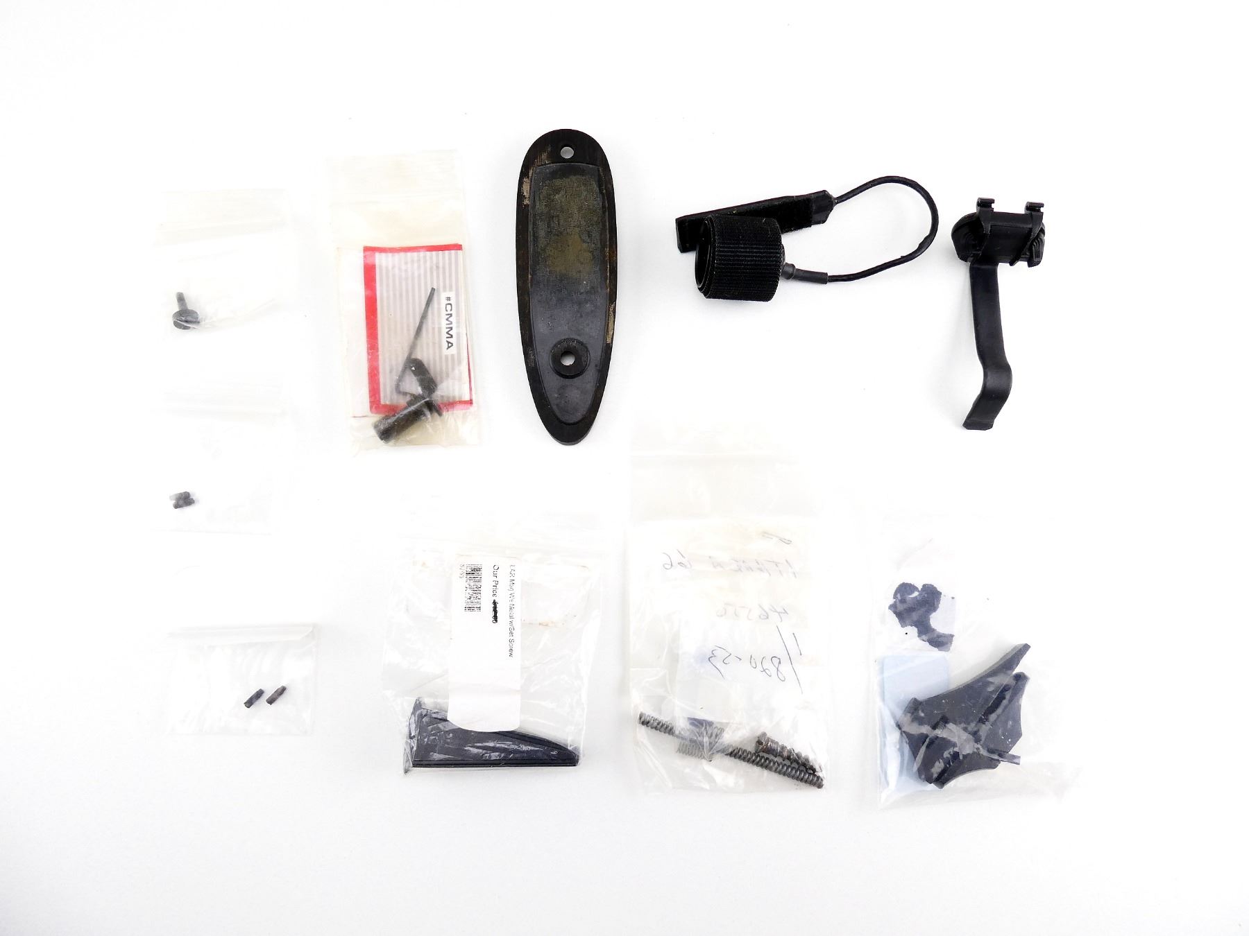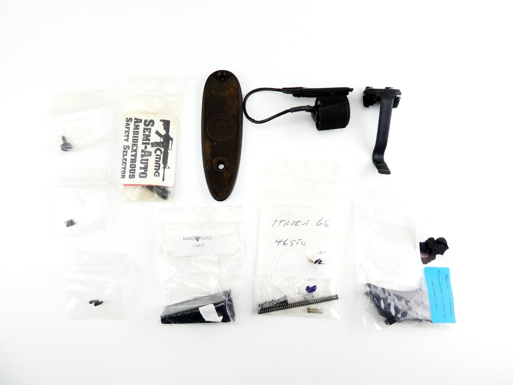 LOT INCLUDES; ITHACA 66 PARTS, WINCHESTER BUTT PLATE, AR-15 SAFETY & MAG COUPLER, UNKNOWN FRONT & REAR SIGHTS, SCREWS, FLASHLIGHT PARTS, ETC. MAY REQUIRE FITTING. SEE PHOTOS.