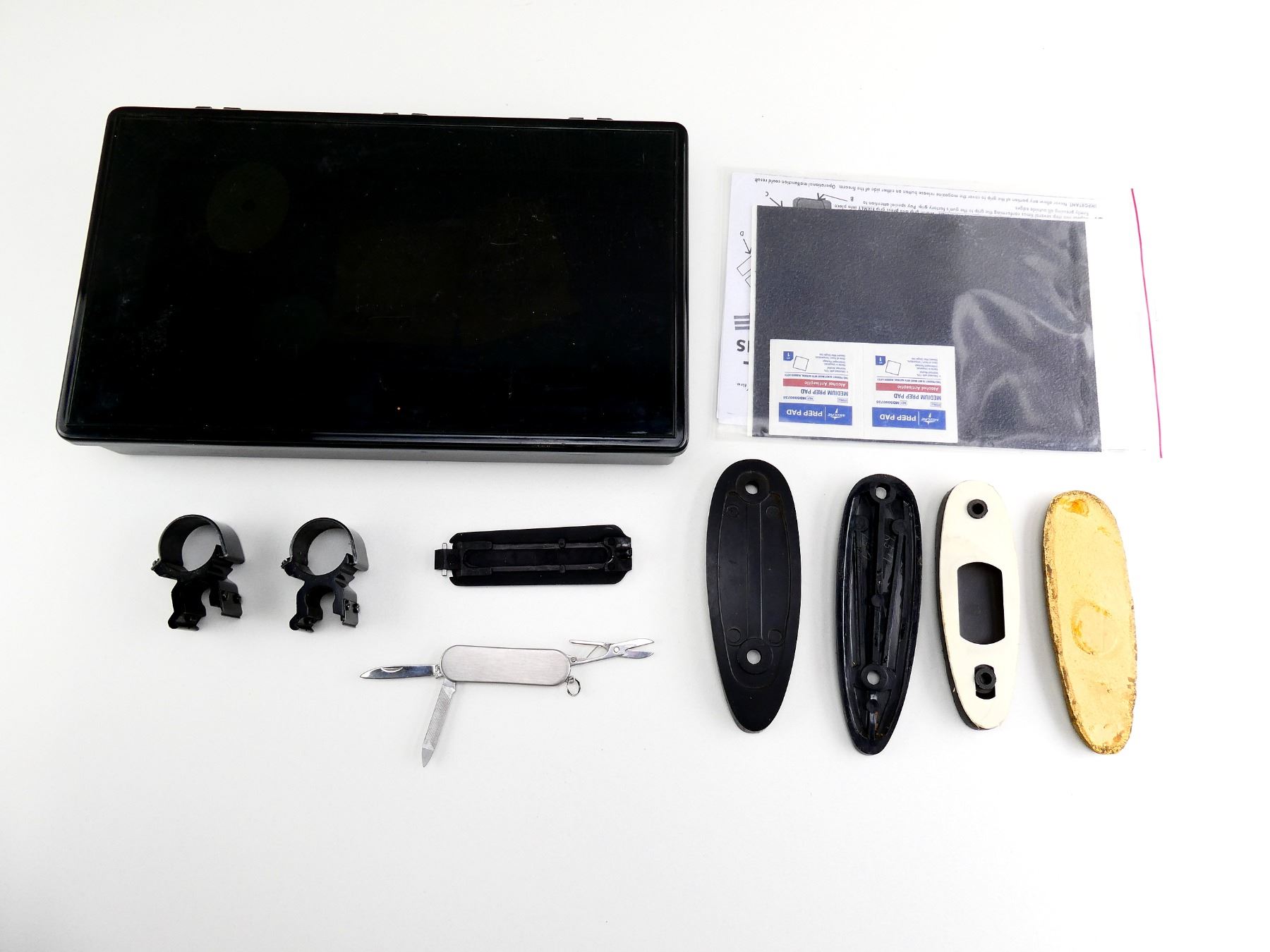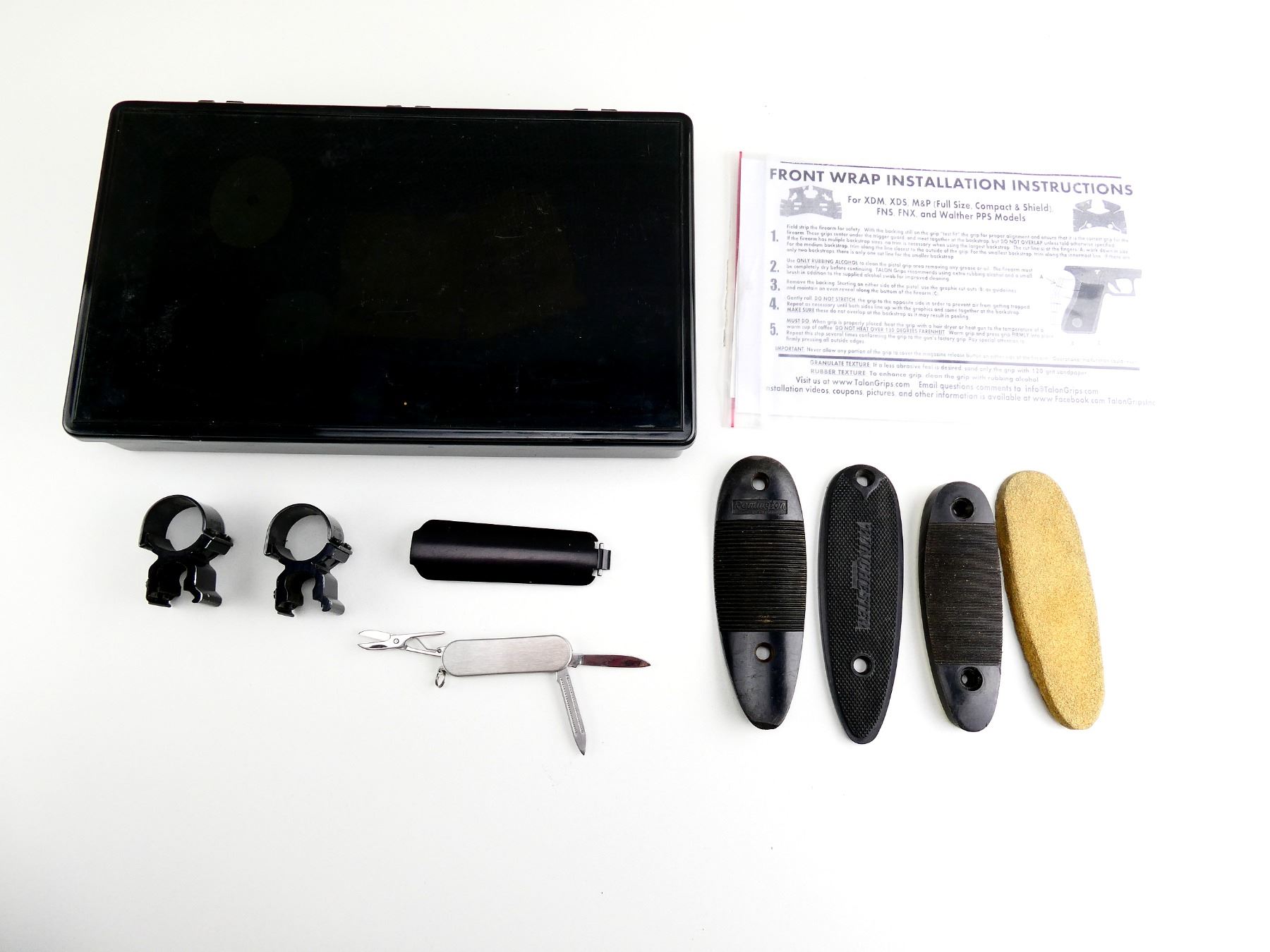 LOT INCLUDES; (3) ASSORTED BLACK POLYMER BUTT PLATES, REMINGTON FOREND CAP, WEAVER 1" SCOPE RINGS, UNKNOWN FLOOR PLATE, VARIOUS SCOPE BASES, ETC. MAY REQUIRE FITTING. SEE PHOTOS.