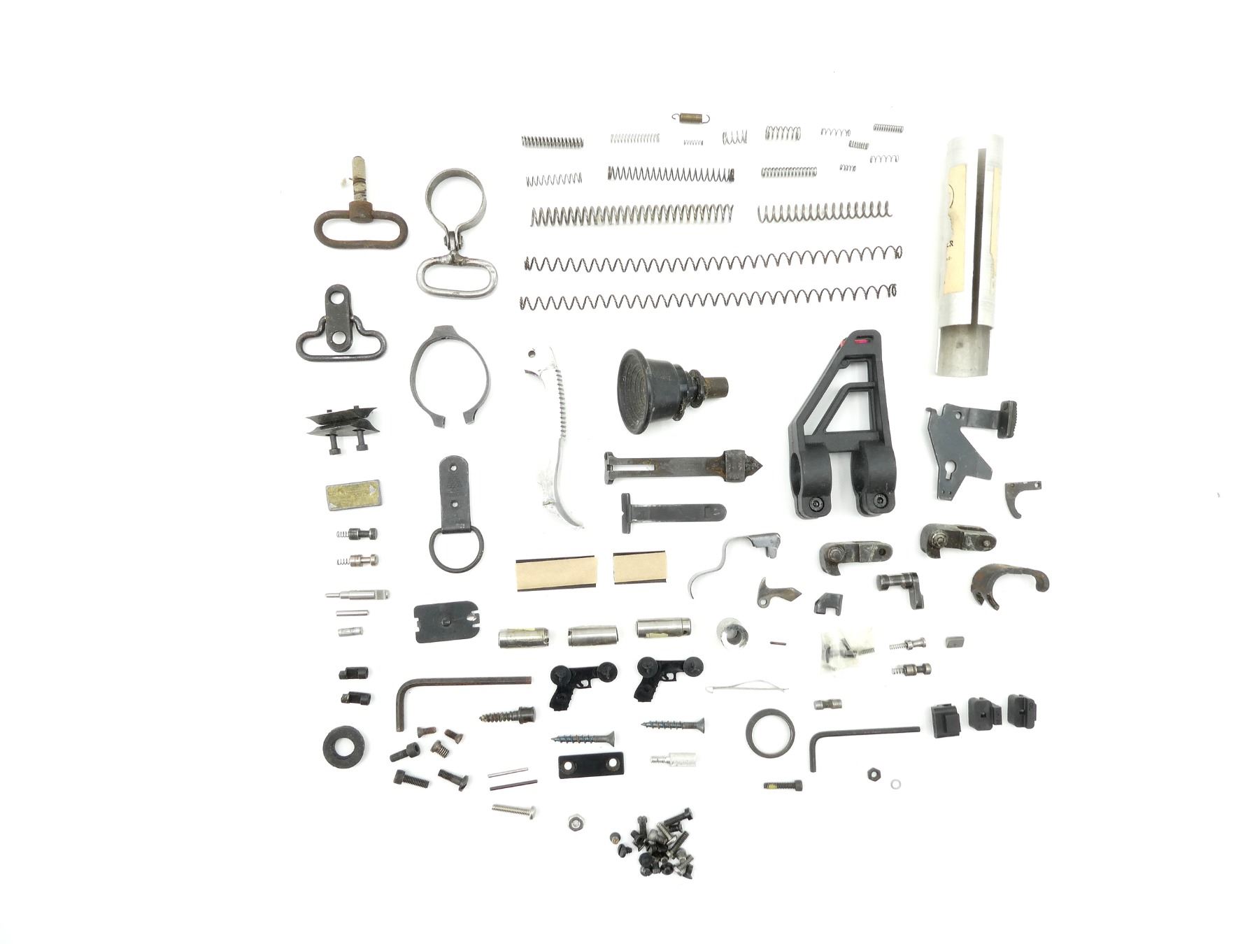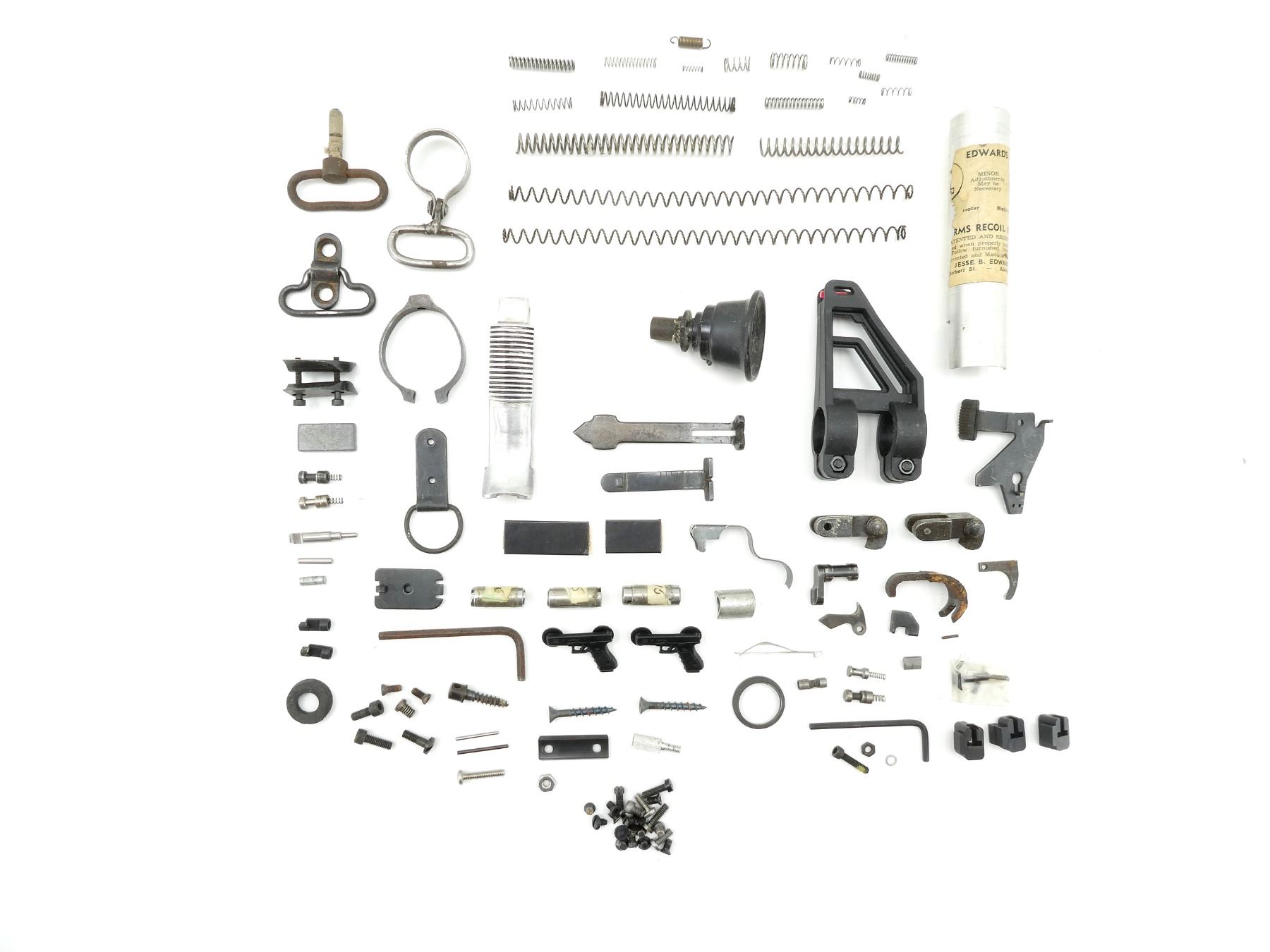LOT INCLUDES; SWIVELS, FRONT SIGHT RAMP, REAR SIGHT, SAFETY LEVER, VARIOUS SPRIGS / PLUNGERS / SCREWS, ETC. MAY REQUIRE FITTING. SEE PHOTOS.