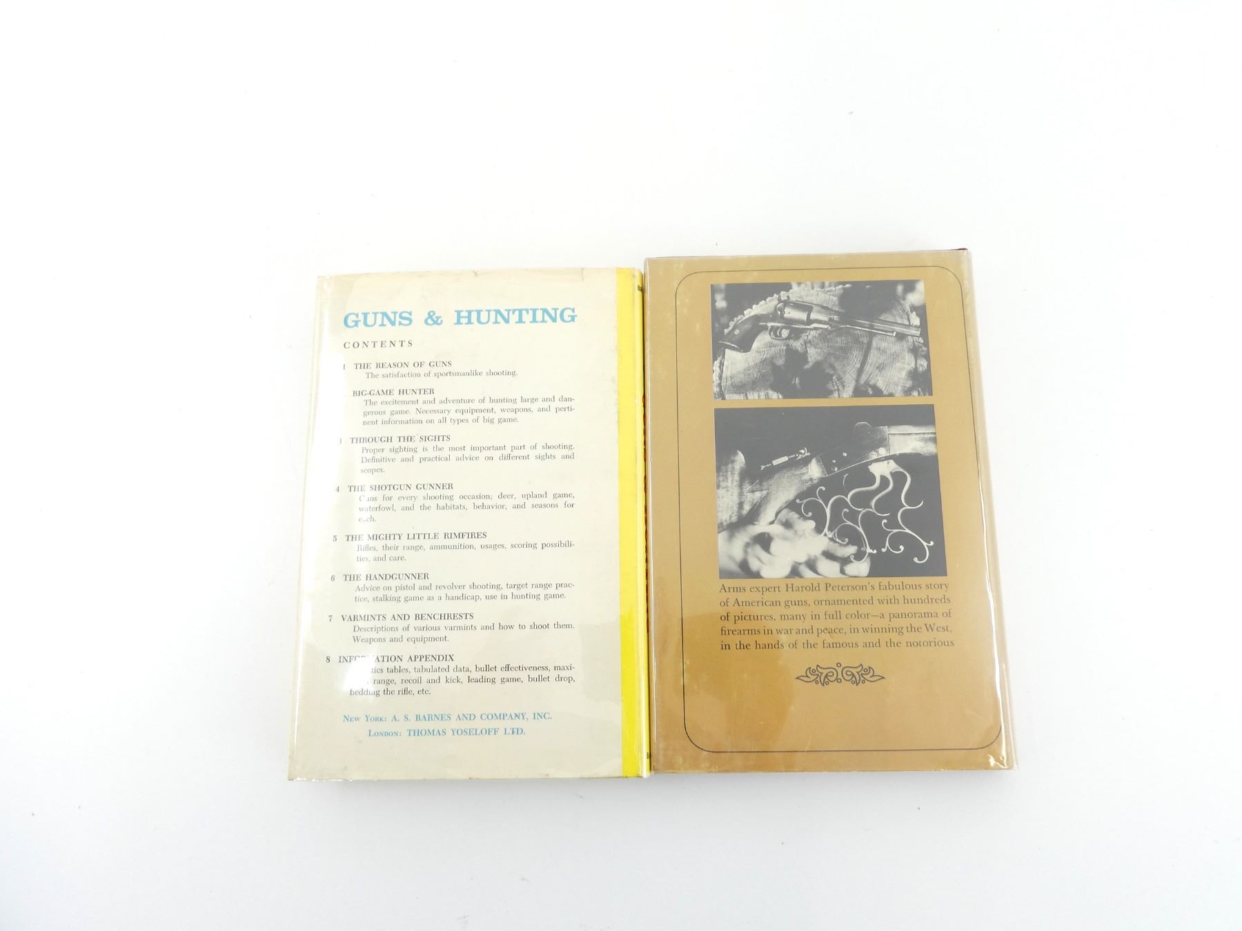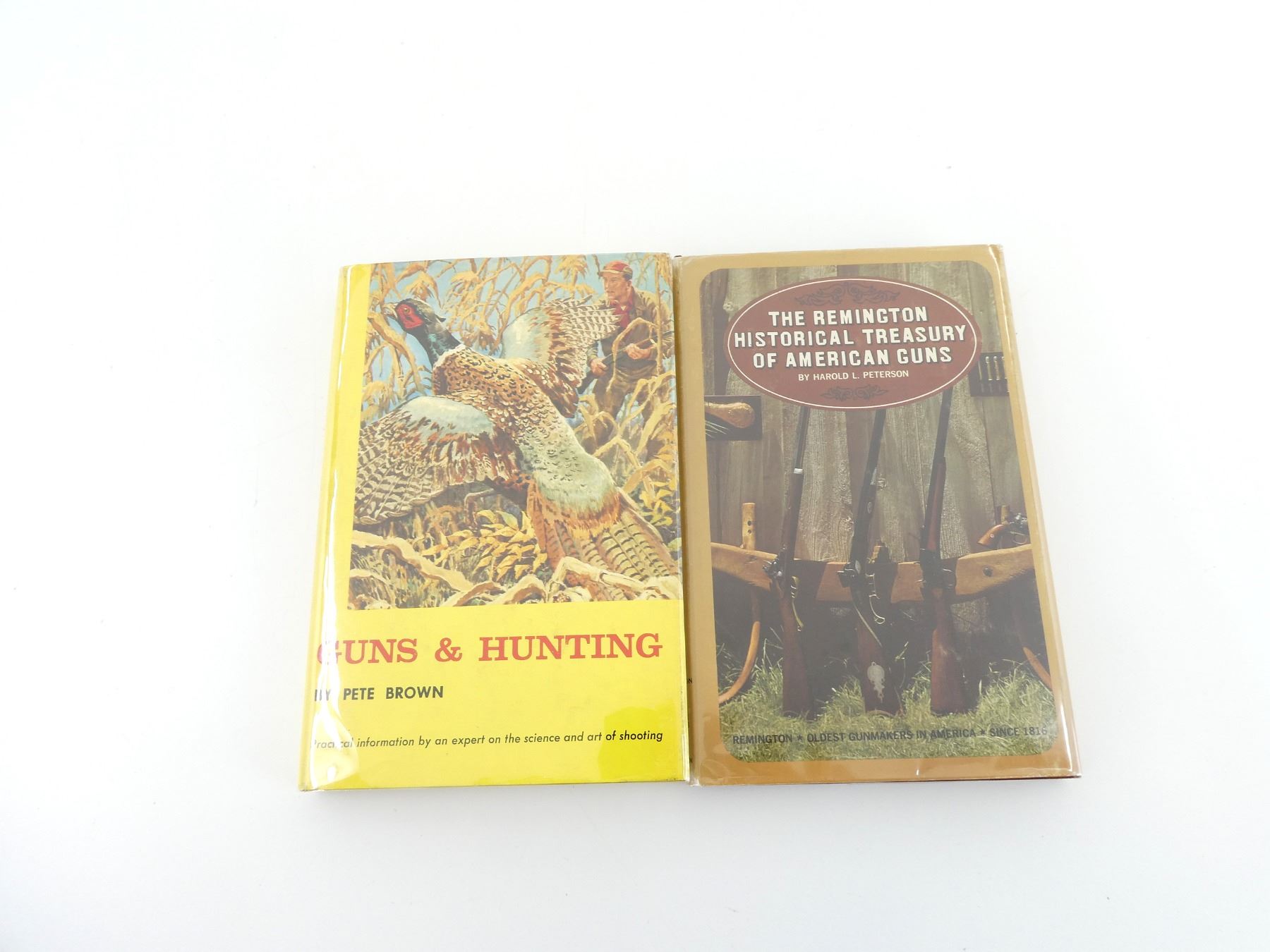 HARD COVERS WITH DUST COVERS, LOT INCLUDES; (1) "GUNS AND HUNTING" BOOK BY PETE BROWN, COPYRIGHT 1955 & (1) "THE REMINGTON HISTORICAL TREASURY OF AMERICAN GUNS" BOOK BY HAROLD L. PETERSON, COPYRIGHT 1966. SEE PHOTOS.