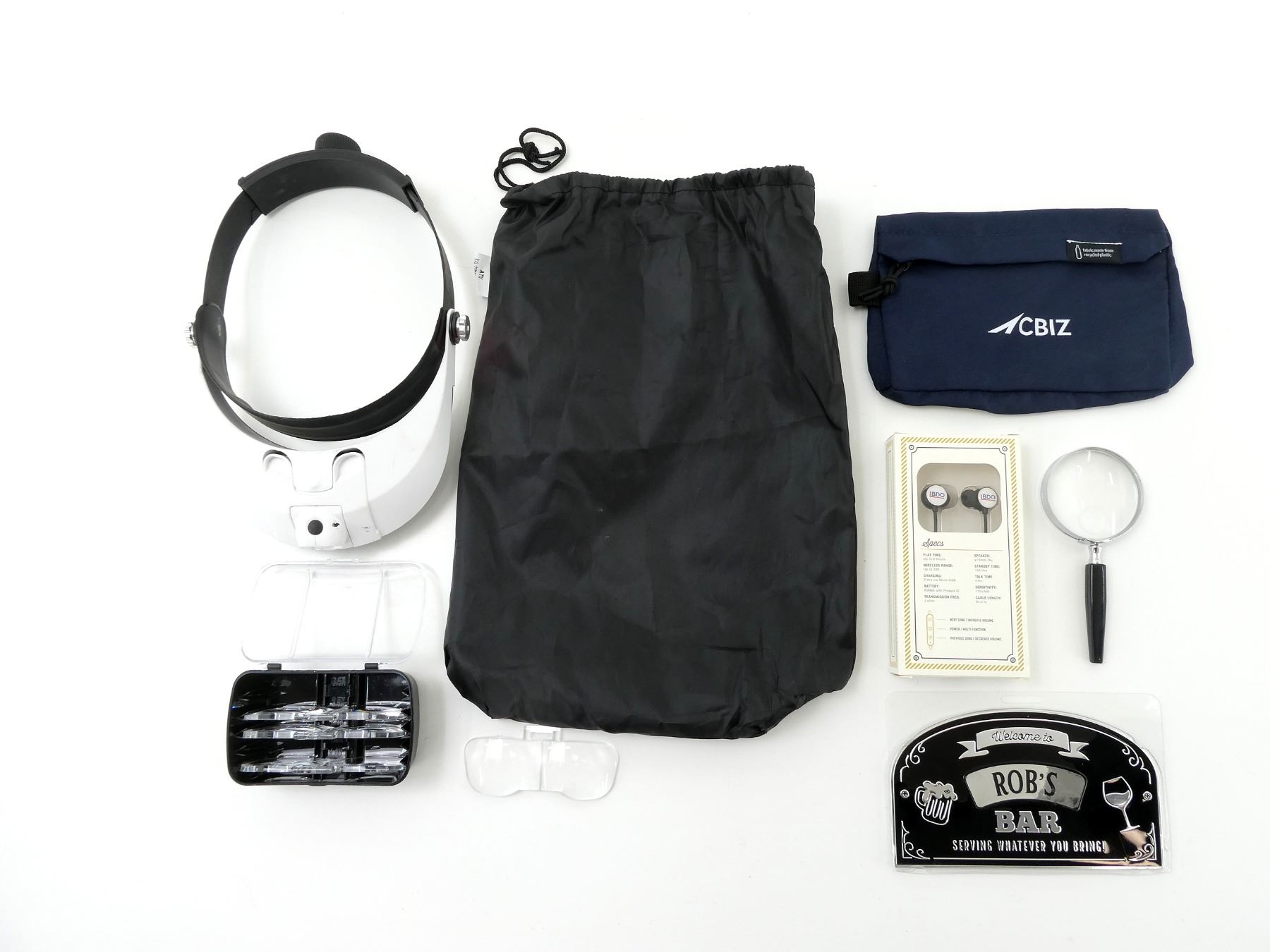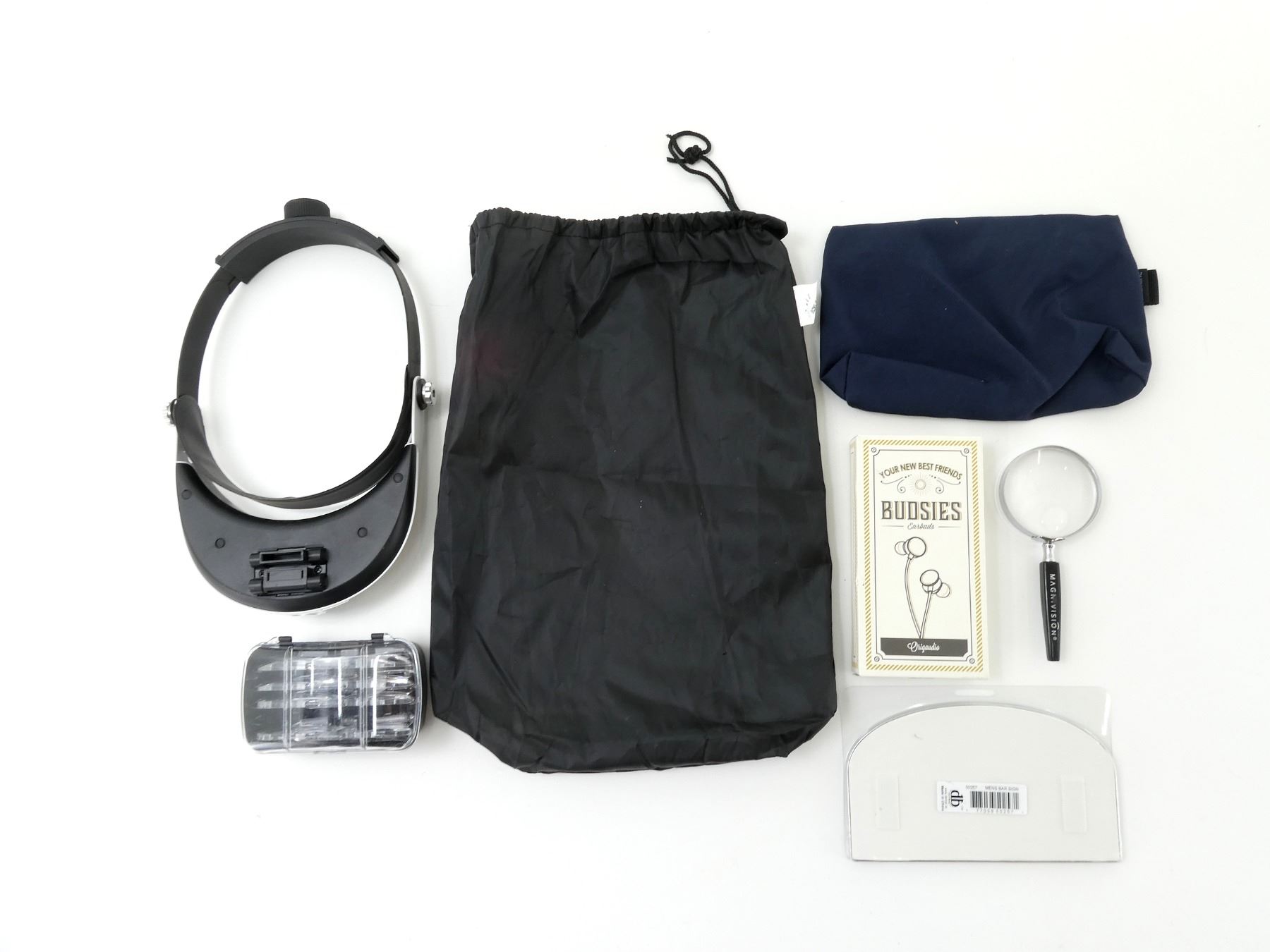 LOT INCLUDES; (1) UNKNOWN HEAD LAMP WITH MAGNIFYING LENSES, UNTESTED, (1) MAGNIFYING GLASS, (1) BUDSIES EARBUDS, UNTESTED, (1) SMALL POUCH, ETC. SEE PHOTOS.