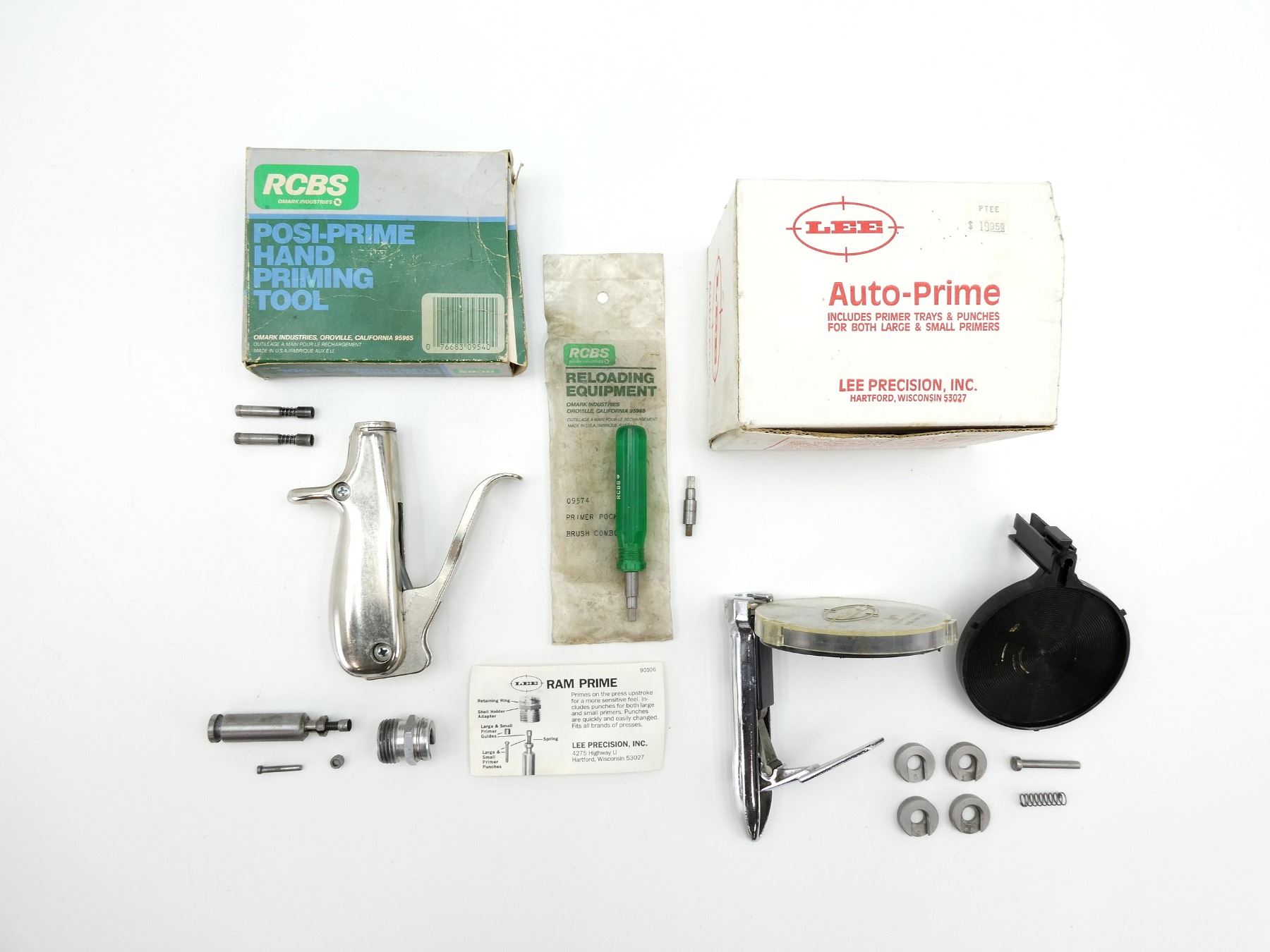 LOT INCLUDES; (1) RCBS HAND PRIMING TOOL WITH ORIGINAL PACKAGING, TOP IS CRACKED, MAY REQUIRE ADJUSTMENTS AND/OR MAY NOT BE COMPLETE, (1) LEE AUTO PRIME HAND PRIMING TOOL WITH LARGE / SMALL PRIMER TRAYS, LARGE / SMALL PUNCHES (ONE INSTALLED), WITH ORIGINAL PACKAGING / INSTRUCTIONS, (5) LEE SHELL HOLDERS, #1, #2, #3 (INSTALLED ON LEE HAND PRIMER), #4 & #6, (1) LEE RAM PRIME & (1) RCBS PRIMER POCKET BRUSH, LARGE / SMALL, WITH HANDLE. SEE PHOTOS.