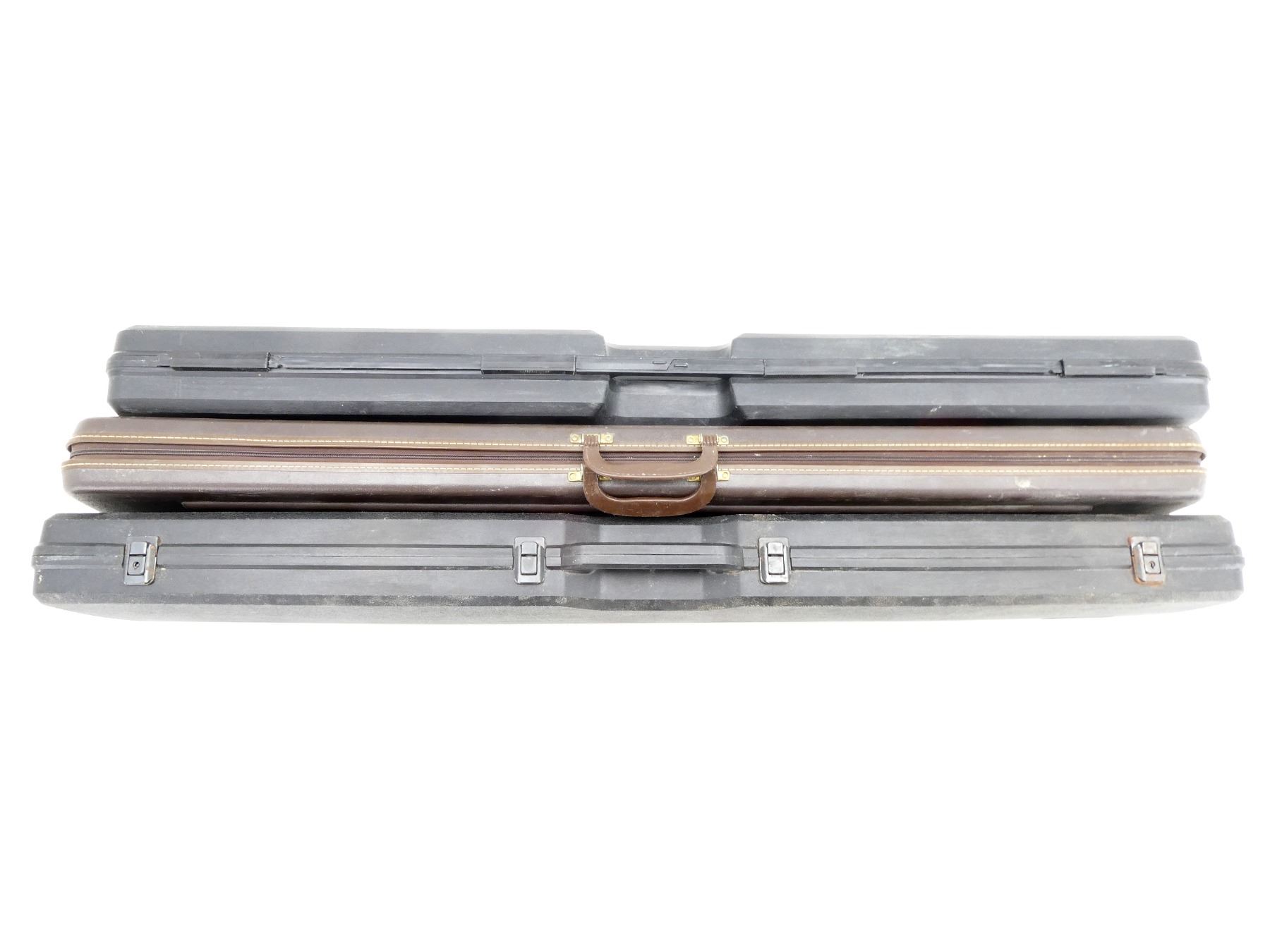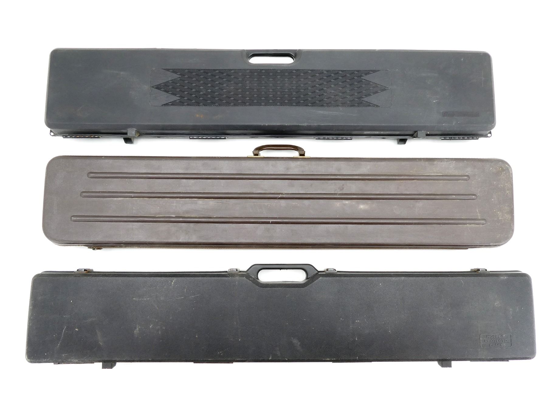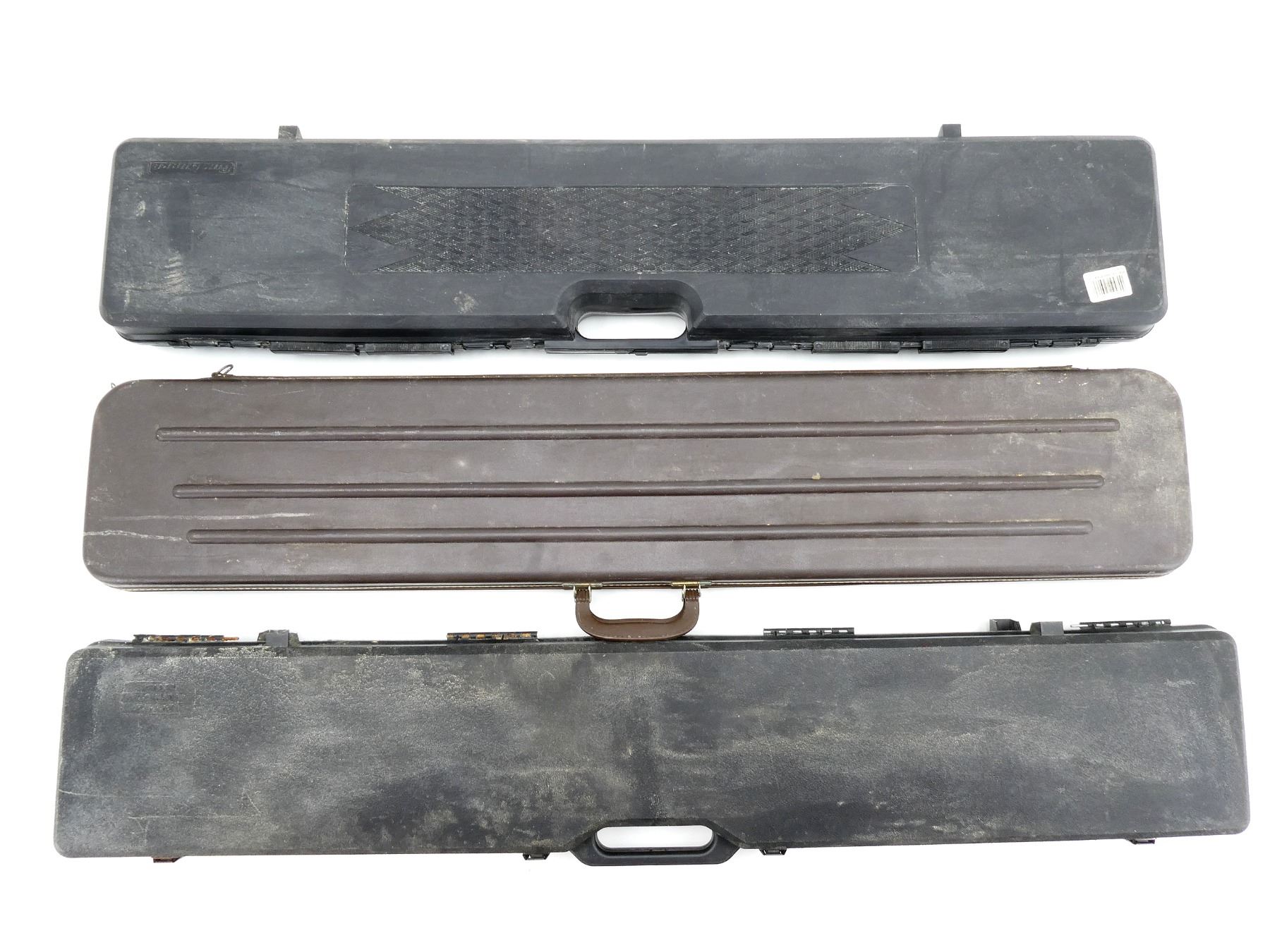 LOT INCLUDES; (2) BLACK HARD PADDED GUN CASES, CARRY HANDLES, (4) LATCHES, (2) ARE LOCKING WITH NO KEYS, (1) BROWN HARD PADDED GUN CASE, CARRY HANDLES, ZIPPERED, APPROX. OAL 47"-49", SHOWS WEAR AND TEAR FROM USAGE, SEE PHOTOS