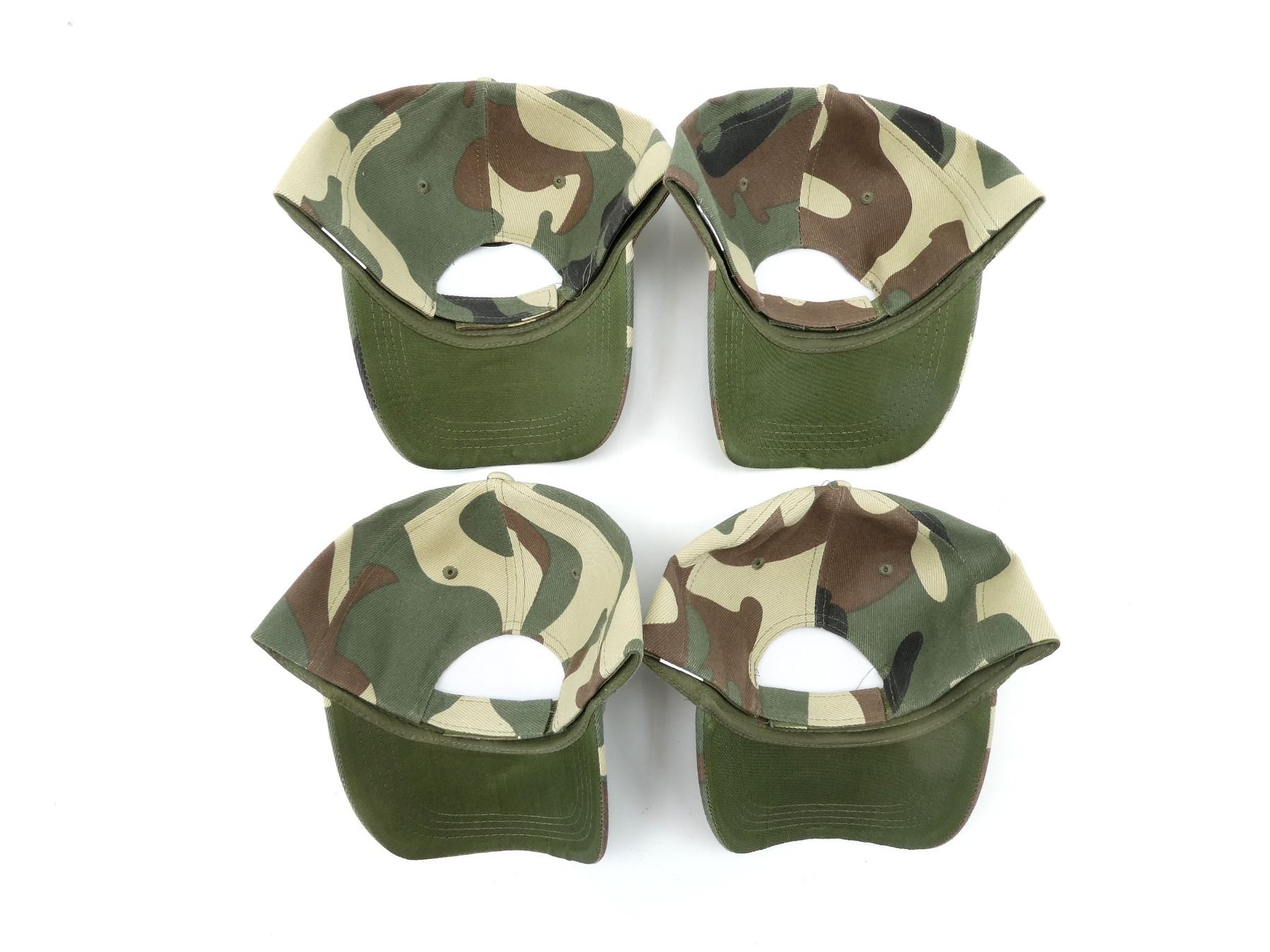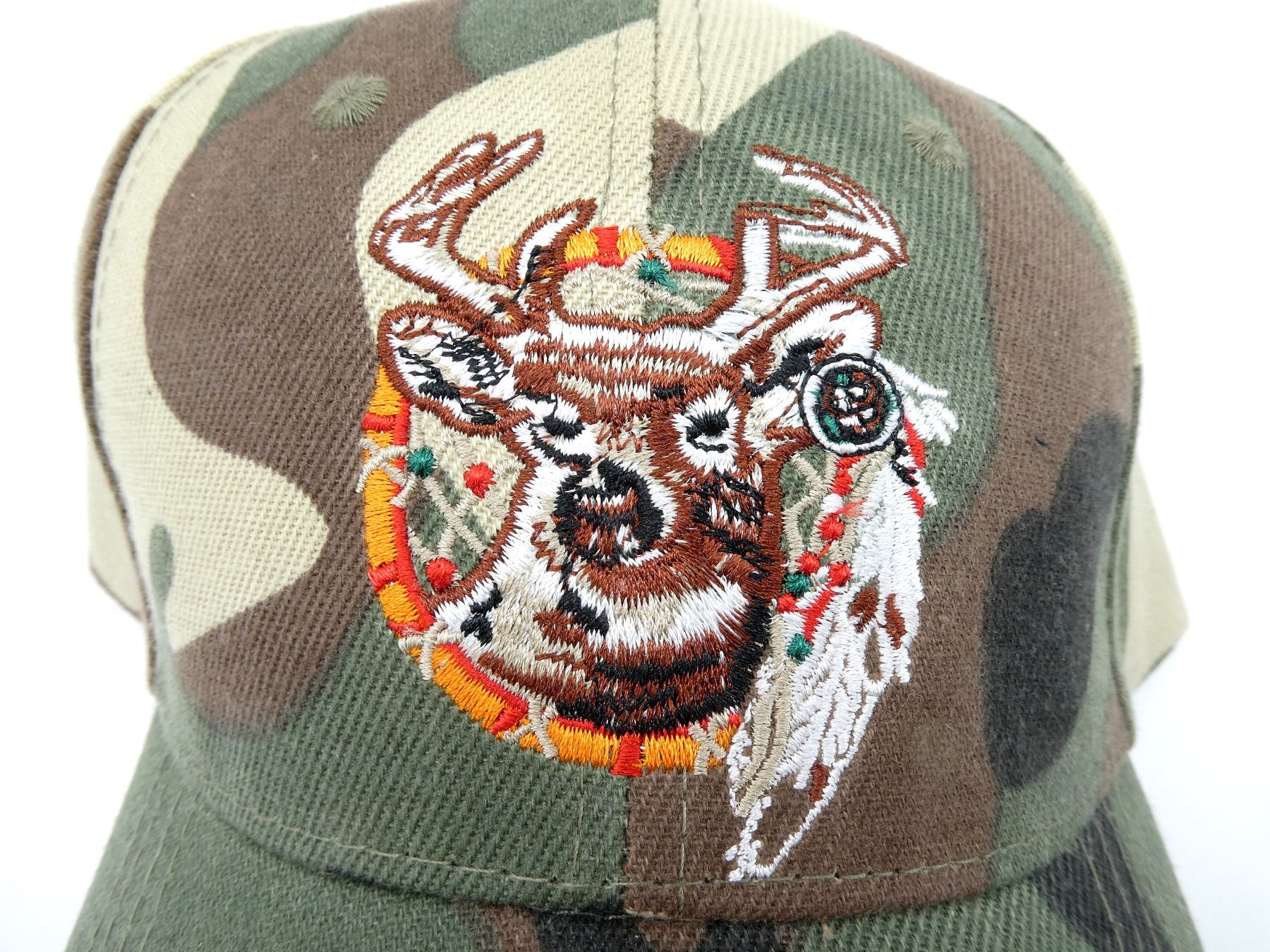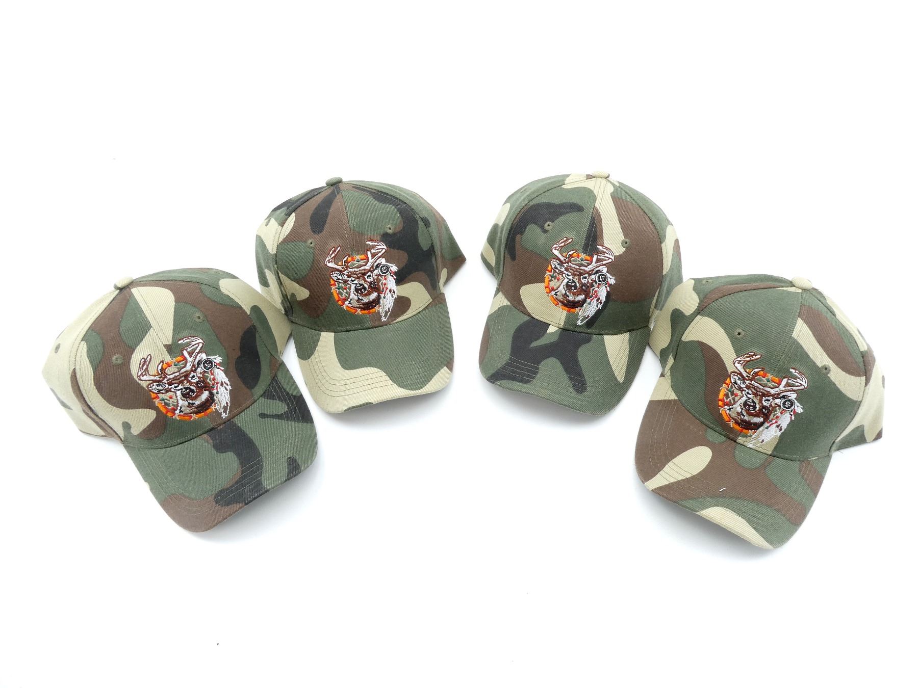 LOT INCLUDES; (4) CAMO POLYESTER HATS, WITH DEER & DREAMCATCHER EMBROIDERY, ADJUSTABLE WITH VELCRO. SEE PHOTOS.