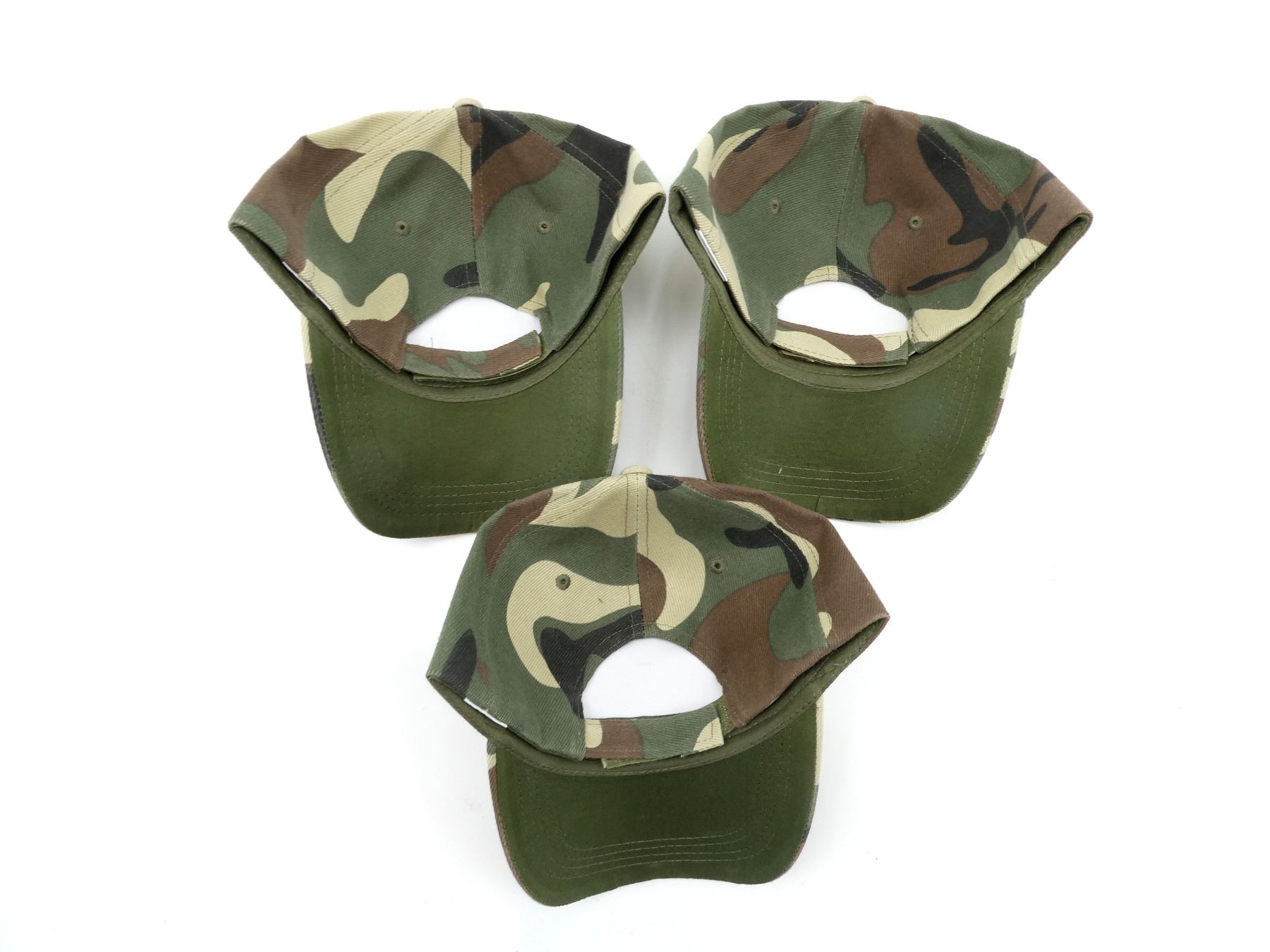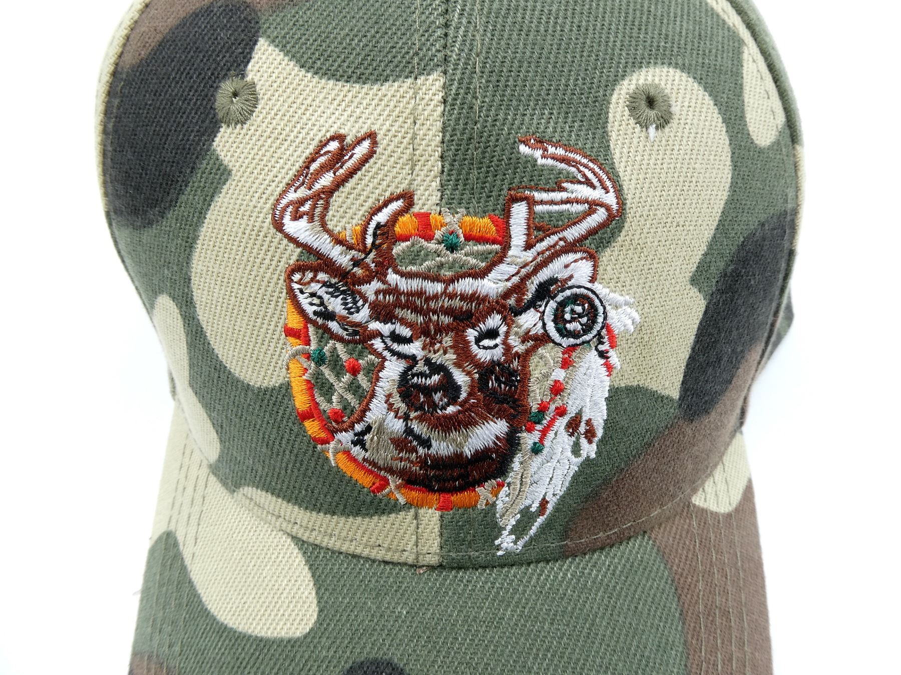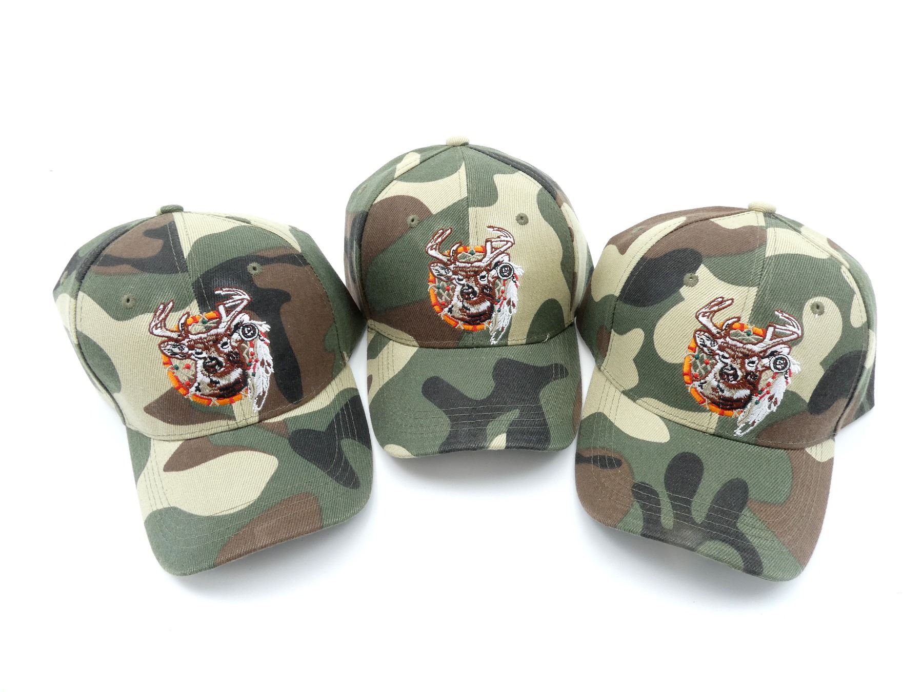 LOT INCLUDES; (3) CAMO POLYESTER HATS, WITH DEER & DREAMCATCHER EMBROIDERY, ADJUSTABLE WITH VELCRO. SEE PHOTOS.