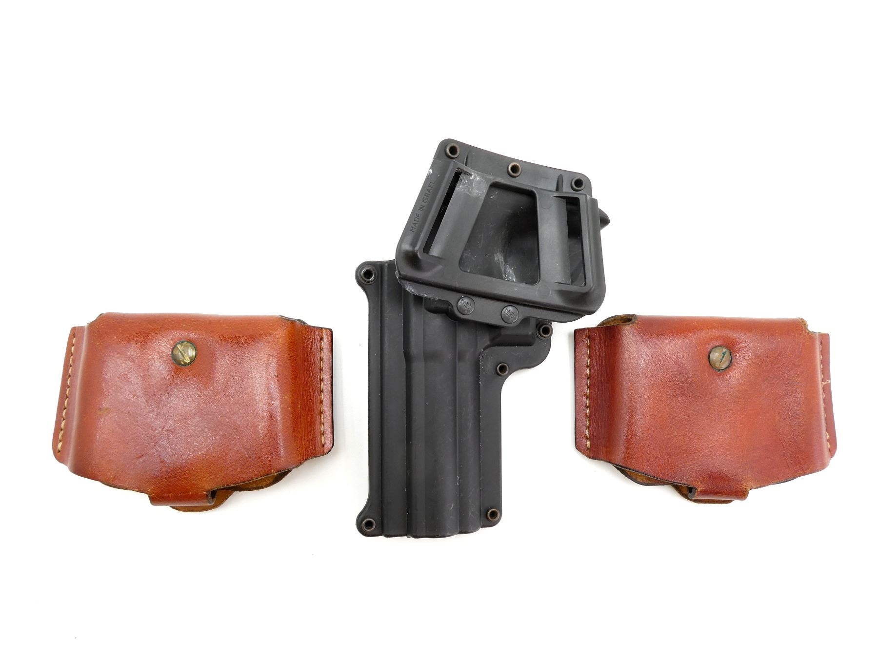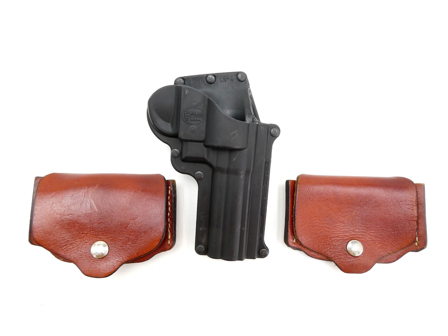 LOT INCLUDES; (1) FOBUS MODEL LK-4 BLACK POLYMER HOLSTER, FITS RUGER SECURITY SIX REVOLVERS, BELT LOOP & (2) TAN LEATHER DOUBLE POCKET MAG POUCHES, FITS SINGLE STACK STYLE MAGS, SLIDE / SNAP ON BELT, NO VISIBLE MARKINGS. SEE PHOTOS.