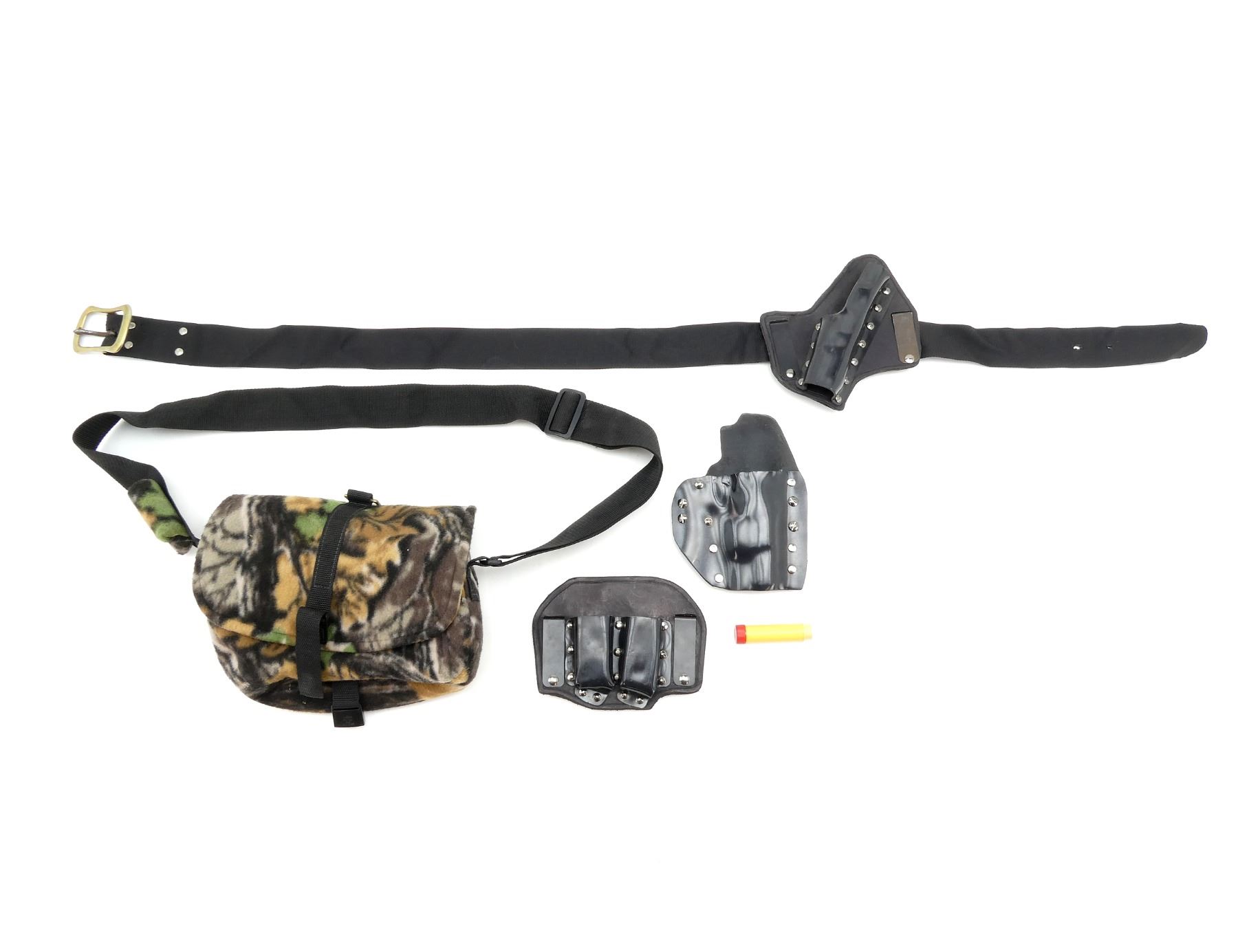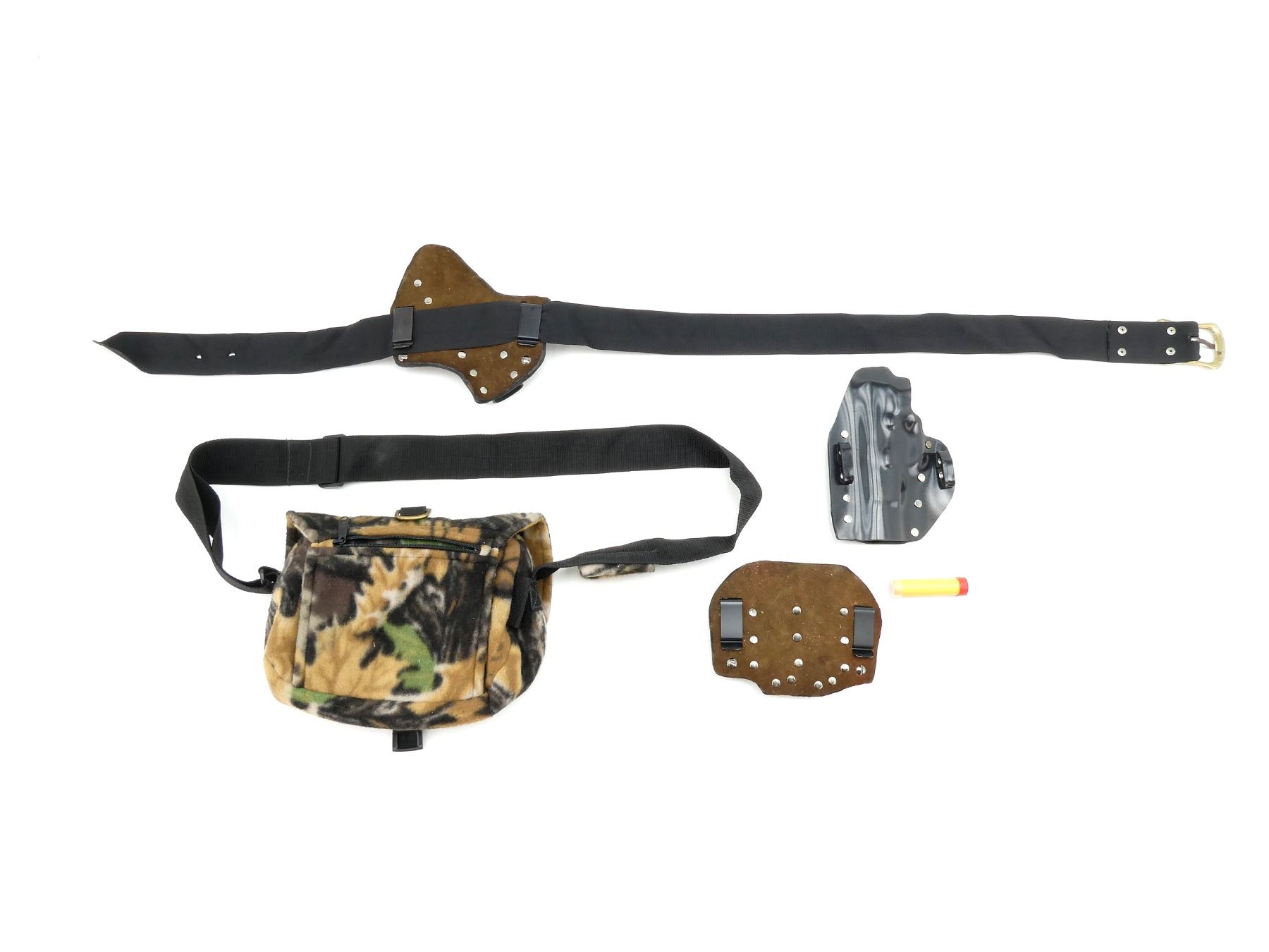 LOT INCLUDES; (1) BLACK PLASTIC PISTOL HOLSTER, NO VISIBLE MARKINGS, TWO BELT LOOPS, OAL APPROX. 7.75", (1) BLACK PLASTIC / LEATHER DOUBLE MAG POUCH, NO VISIBLE MARKINGS, TWO BELT CLIPS, MAG SLEEVE OAL APPROX. 3.5", (1) BLACK PLASTIC / LEATHER PISTOL HOLSTER, NO VISIBLE MARKINGS, TWO BELT CLIPS, ATTACHED TO BLACK NYLON BELT WITH BRASS BUCKLE, HOLSTER OAL APPROX. 6.75", BELT OAL APPROX. 50.75, ADJUSTABLE & (1) CAMO FELT RANGE / SHOOTING BAG, VARIOUS POCKETS, VARIOUS MARKINGS ON BUCKLE, ADJUSTABLE BLACK NYLON CARRY STRAP. SEE PHOTOS.