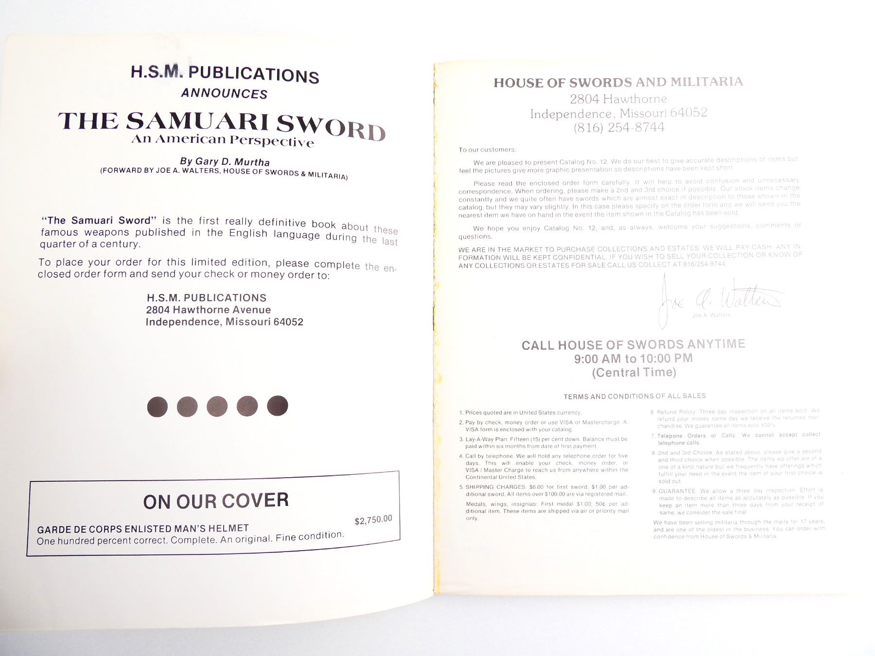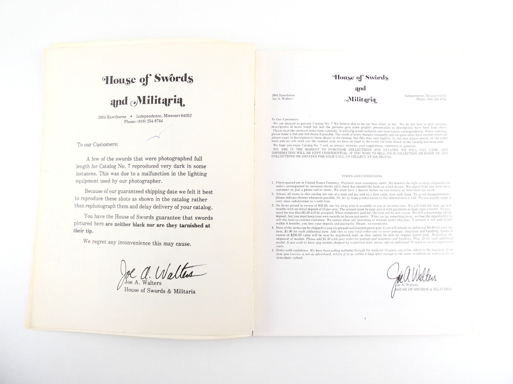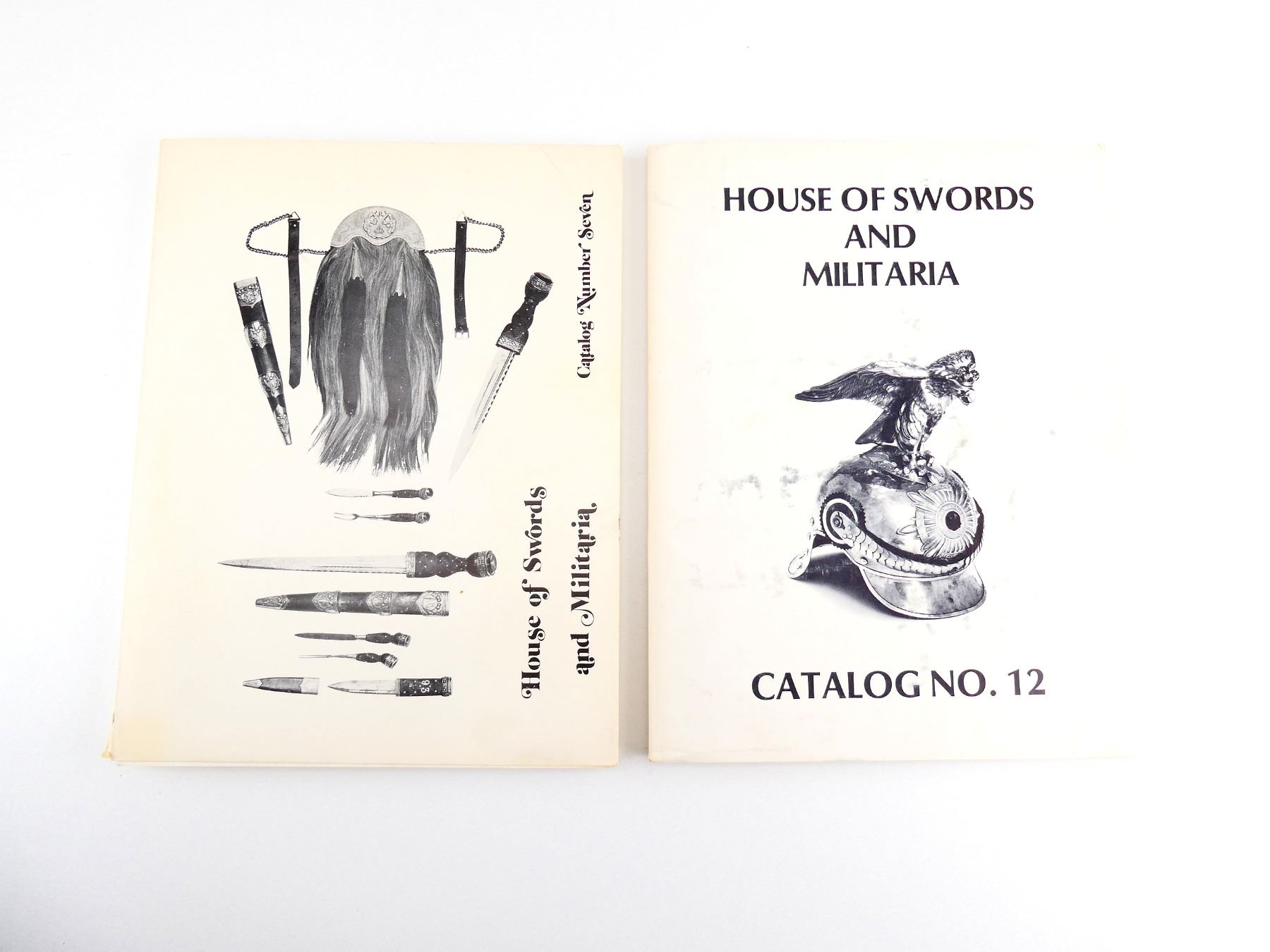 SOFT COVERS, LOT INCLUDES; (1) "HOUSE OF SWORDS AND MILITARIA CATALOGUE NUMBER SEVEN" WITH ACCOMPANYING "SPECIAL OFFERING SUPPLEMENT" & (1) "HOUSE OF SWORDS AND MILITARIA CATALOGUE NO. 12". SEE PHOTOS.