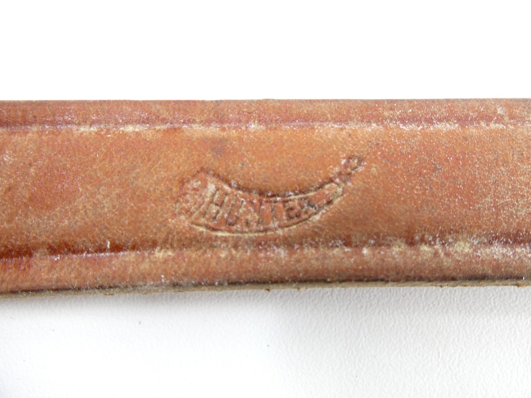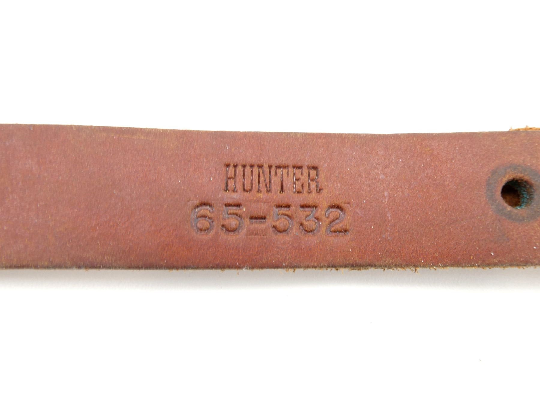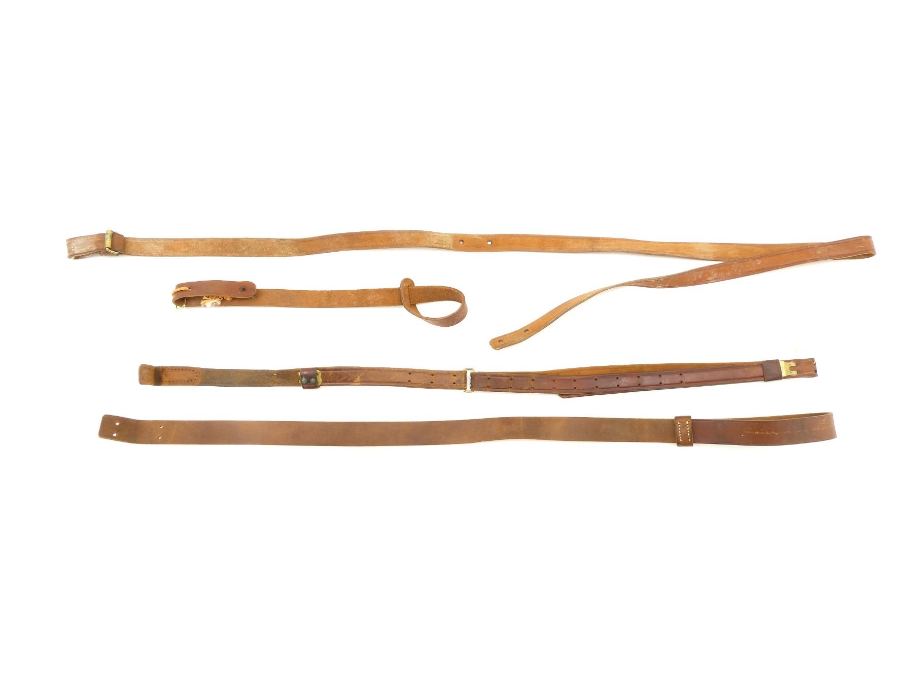 LOT INCLUDES; (1) HUNTER BROWN LEATHER SLING, MARKED "HUNTER", "65-532", OVERALL LENGTH APPROX. 20", ADJUSTABLE, (1) UNKNOWN BROWN LEATHER SLING, UNMARKED, OVERALL LENGTH APPROX. 36.5", ADJUSTABLE, (1) UNKNOWN BROWN LEATHER SLING, UNMARKED, OVERALL LENGTH APPROX. 36.5", ADJUSTABLE & (1) UNKNOWN BROWN LEATHER SLING, UNMARKED, OVERALL LENGTH APPROX. 64.5". SEE PHOTOS.