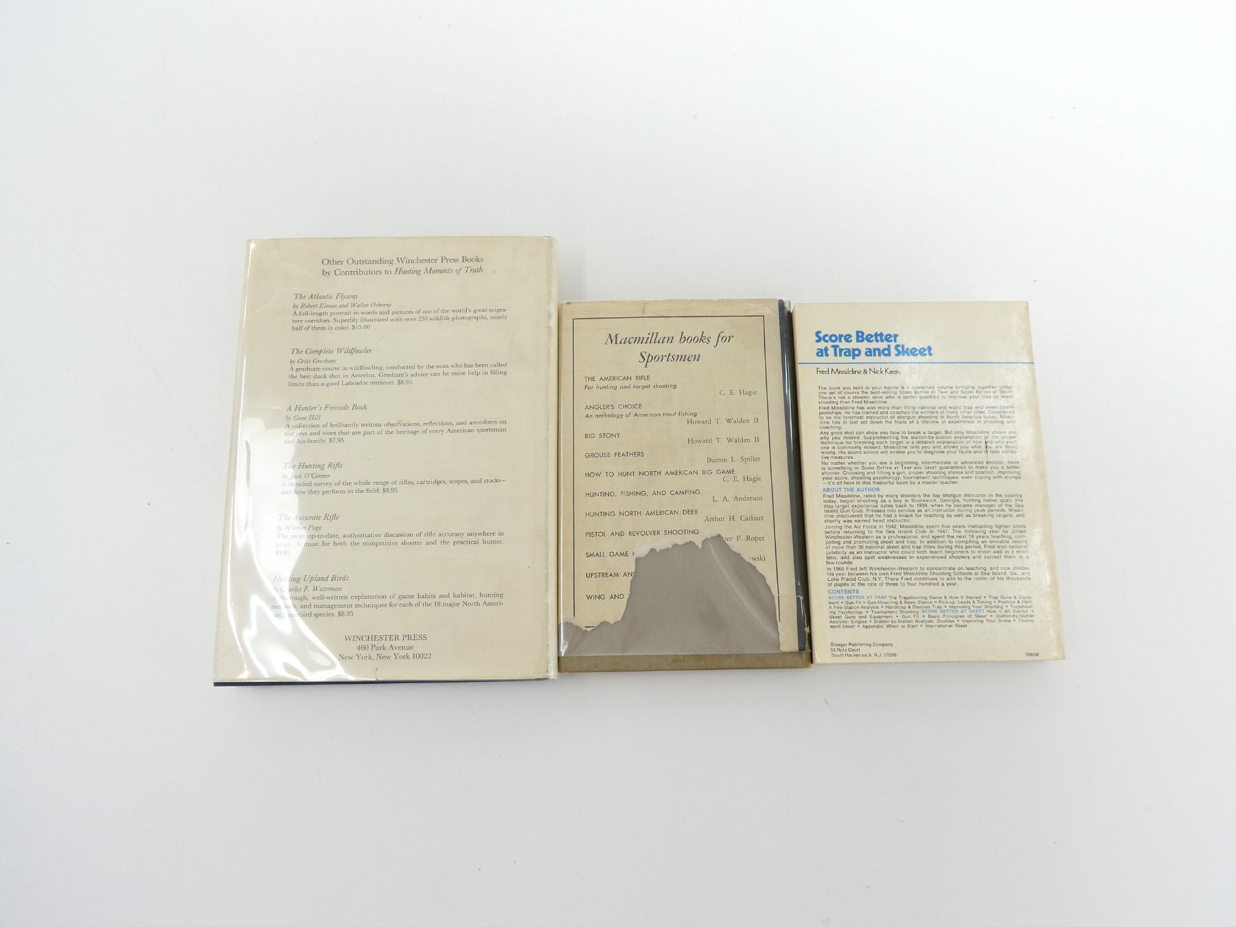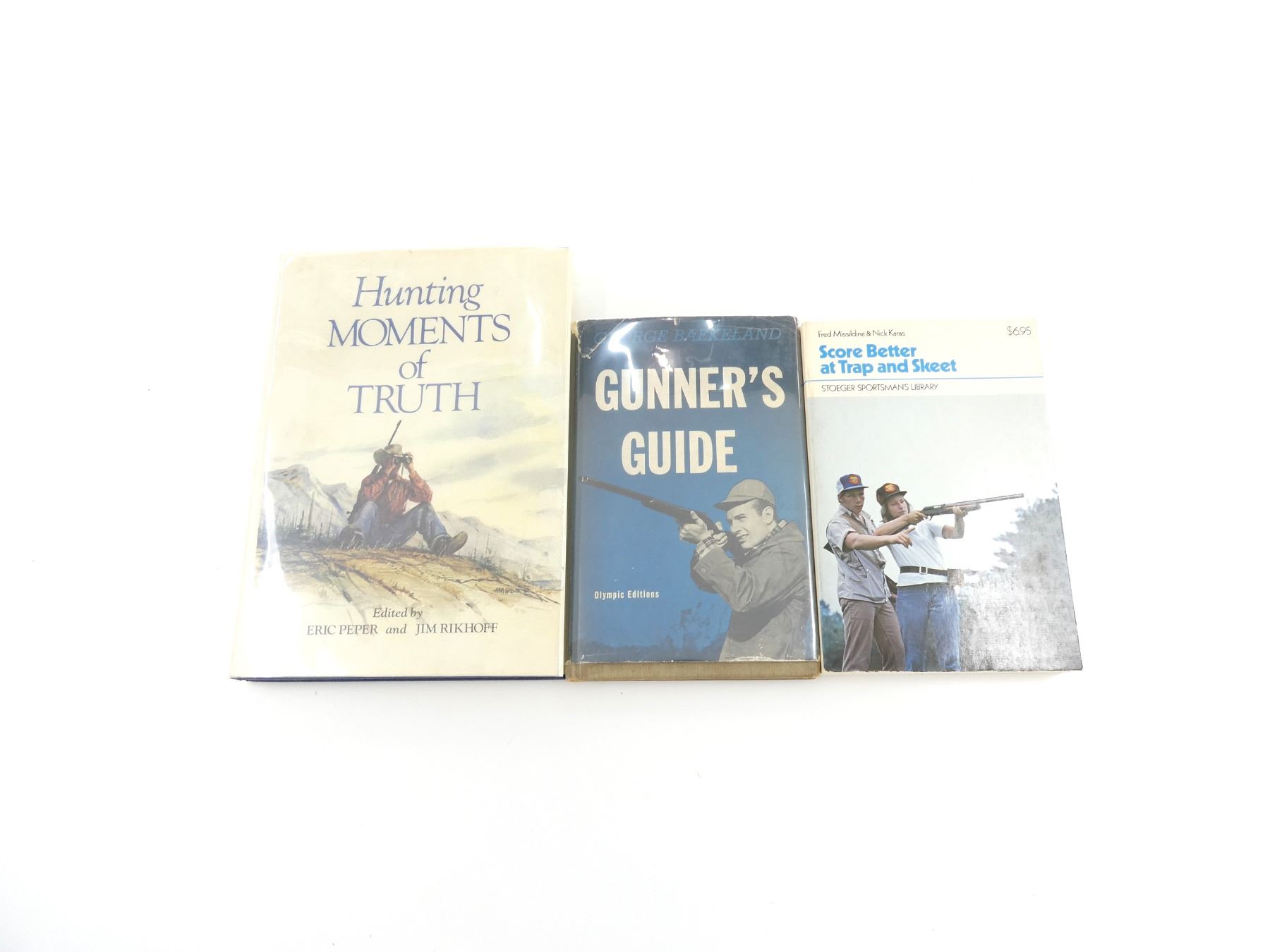 LOT INCLUDES; (1) "SCORE BETTER AT TRAP AND SKEET" BOOK BY FRED MISSILDINE WITH NICK KARAS, SOFT COVER, ISBN: 0-88317-043-4, (1) "GUNNER'S GUIDE" BOOK BY GEORGE BAEKELAND, HARD COVER WITH DUST COVER, COPYRIGHT 1948 & (1) "HUNTING MOMENTS OF TRUTH" BOOK EDITED BY ERIC PEPER & JIM RIKHOFF, HARD COVER WITH DUST COVER, ISBN: 0-87691-117-3. SEE PHOTOS.