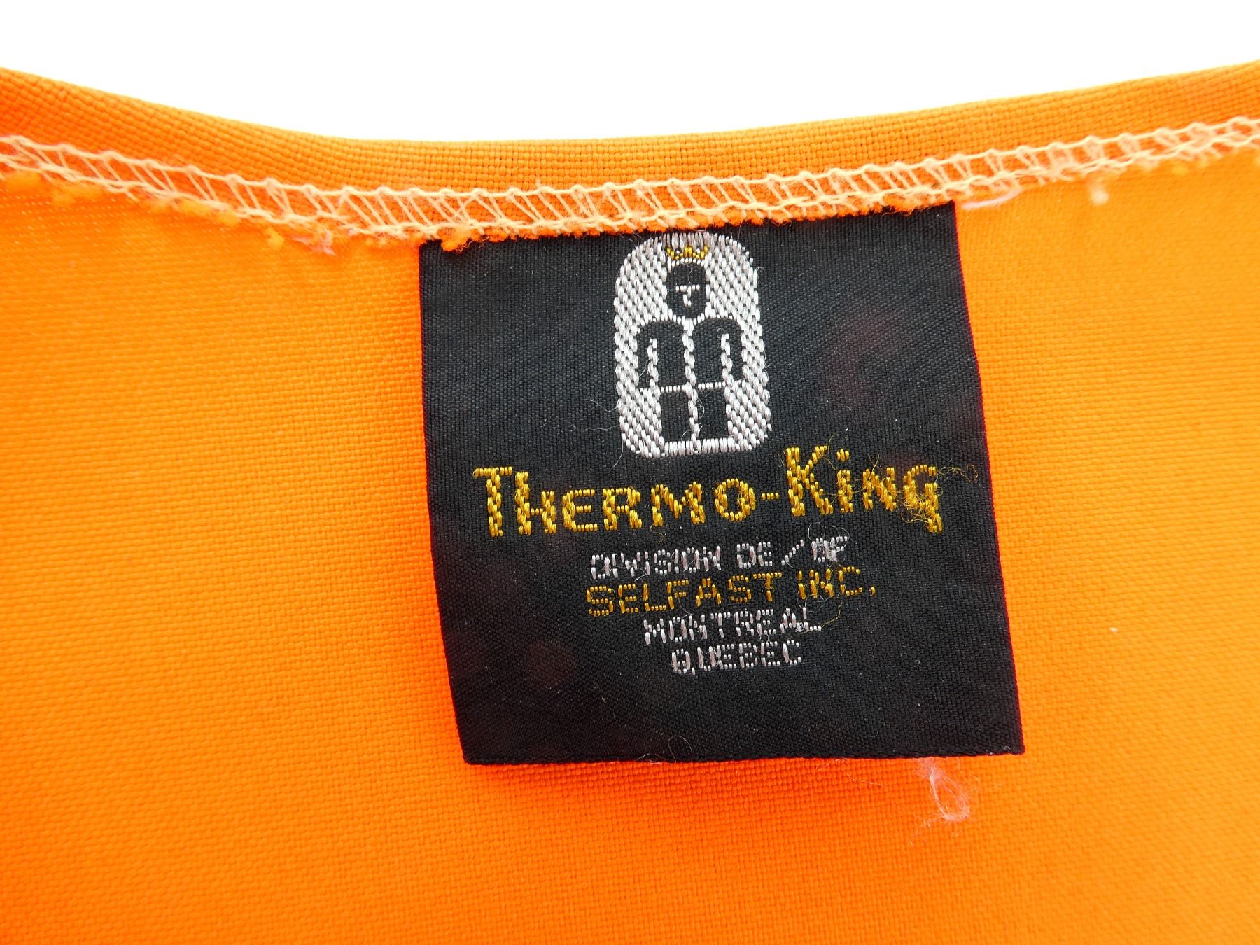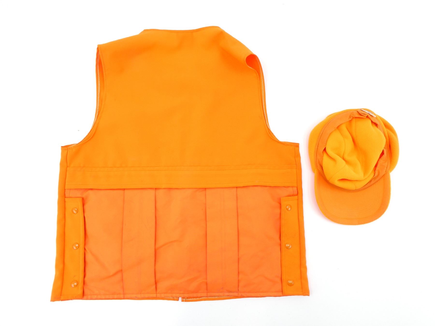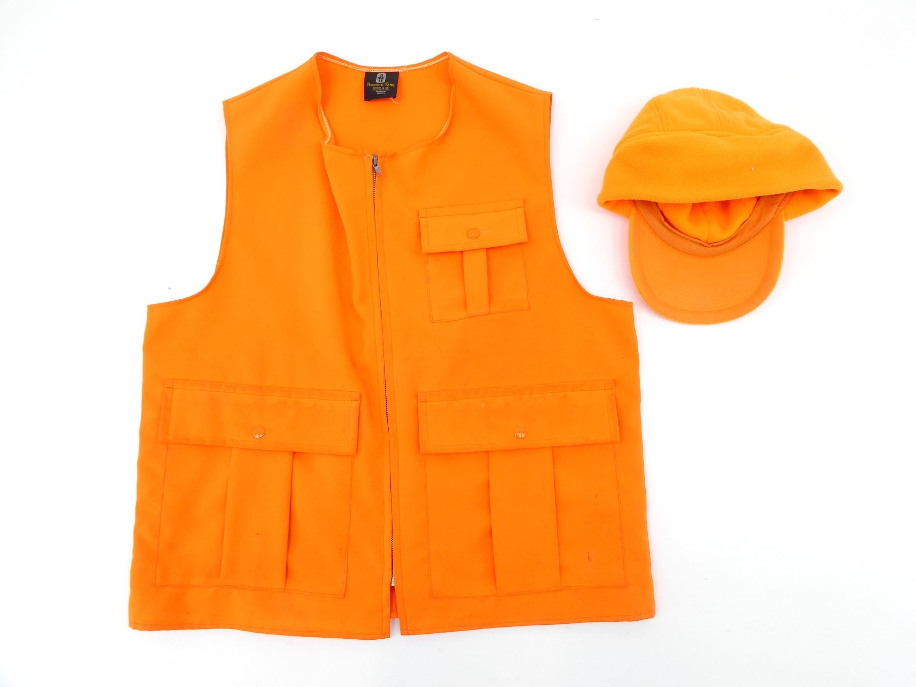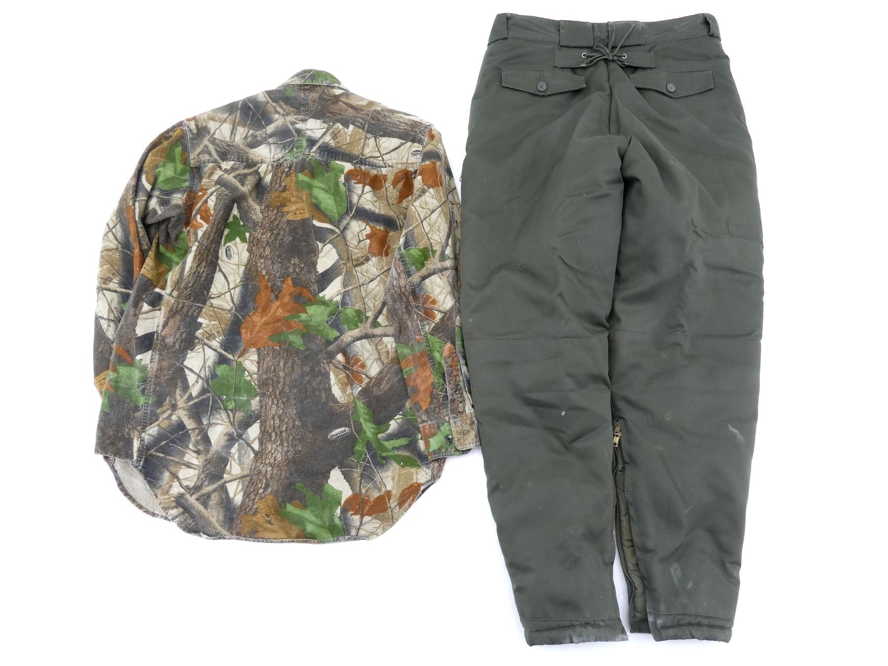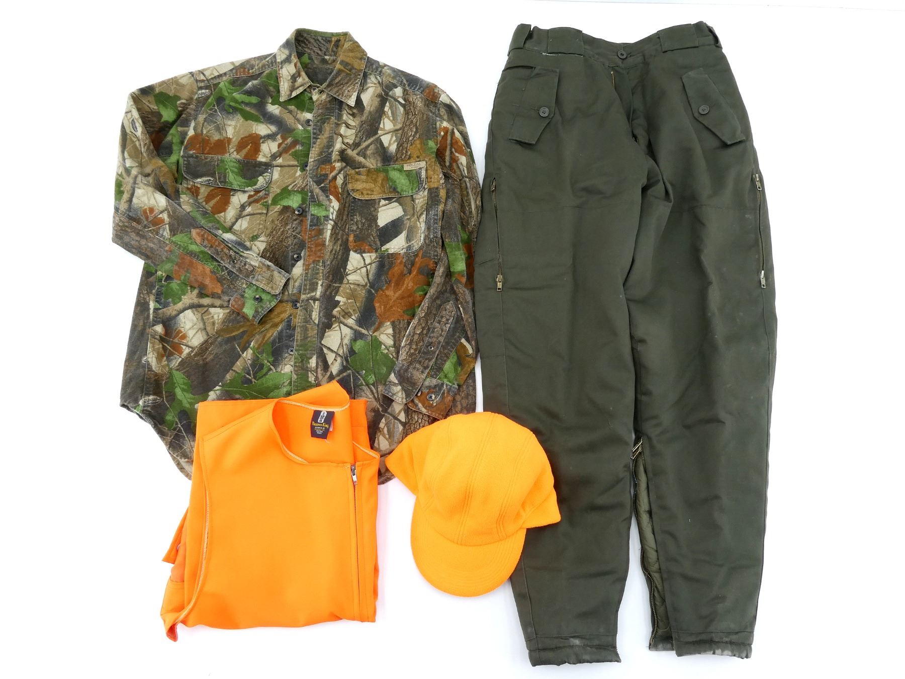 LOT INCLUDES; (1) UNKNOWN REALTREE HARDWOOD CAMO BUTTON-DOWN LONG-SLEEVE SHIRT, SHOULDER LENGTH OVERALL LENGTH APPROX. 20", (1) MILITAIRE GREEN PANTS, MARKED SIZE 32, (1) ORANGE THERMO-KING VEST, SHOULDER LENGTH APPROX. 16.75" & (1) UNKNOWN ORANGE POLYESTER HAT. SEE PHOTOS.