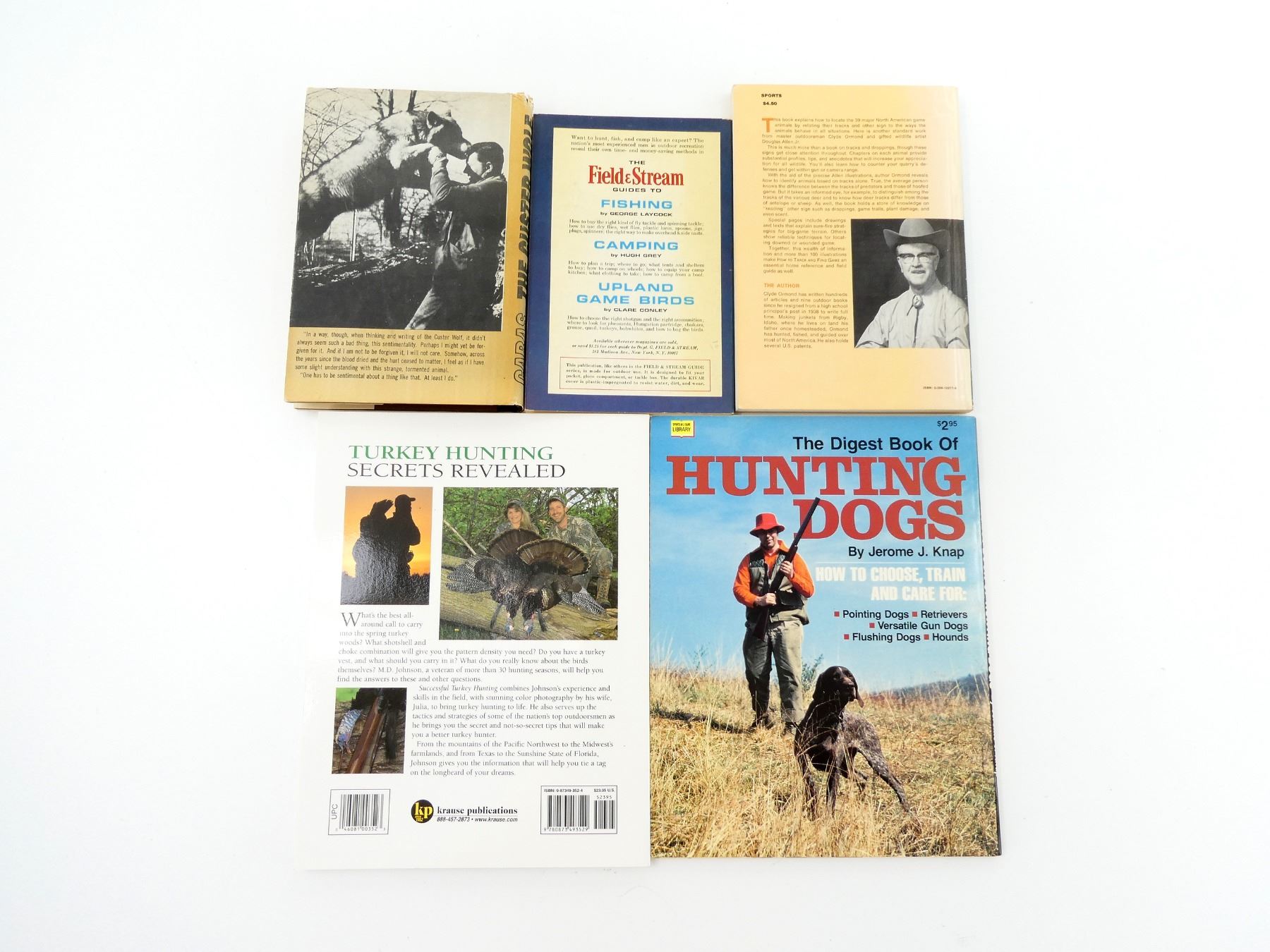 LOT INCLUDES; (1) "THE DIGEST BOOK OF HUNTING DOGS" BOOK BY JEROME J. KNAP, SOFT COVER, ISBN: 0-695-81323-4, (1) "SUCCESSFUL TURKEY HUNTING" BOOK BY M.D. JOHNSON WITH PHOTOS BY JULIA JOHNSON, SOFT COVER, ISBN: 0-87349-352-4, (1) "HOW TO TRACK AND FIND GAME" BOOK BY CLYDE ORMOND, SOFT COVER, ISBN: 0-308-10211-8, (1) "THE FIELD & STREAM GUIDE TO DEER HUNTING" BOOK BY WARREN PAGE, SOFT COVER, COPYRIGHT 1966 & (1) "THE CUSTER WOLF BIOGRAPHY OF AN AMERICAN RENEGADE" BOOK BY ROGER CARAS, HARD COVER WITH DUST COVER, COPYRIGHT 1966. SEE PHOTOS.