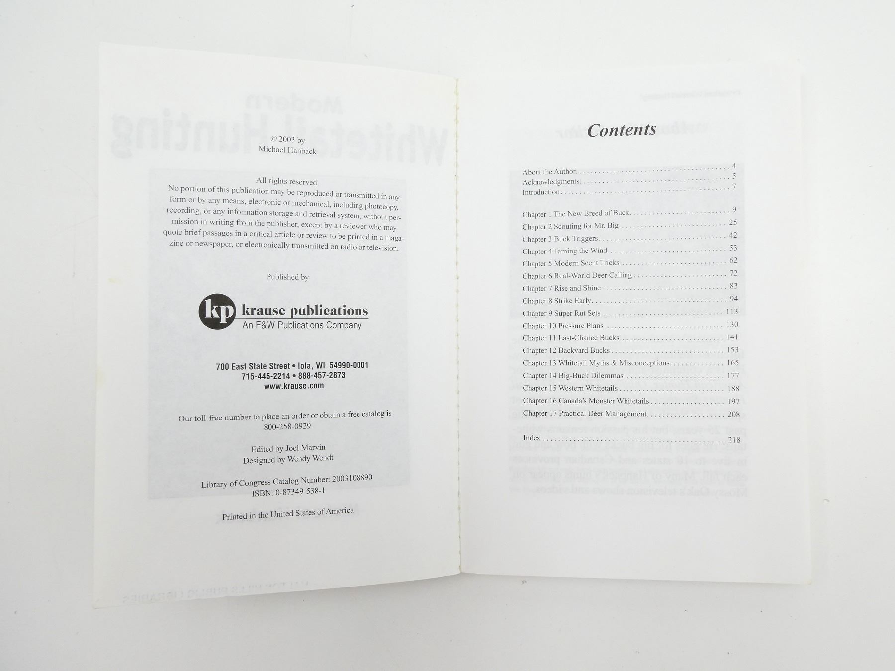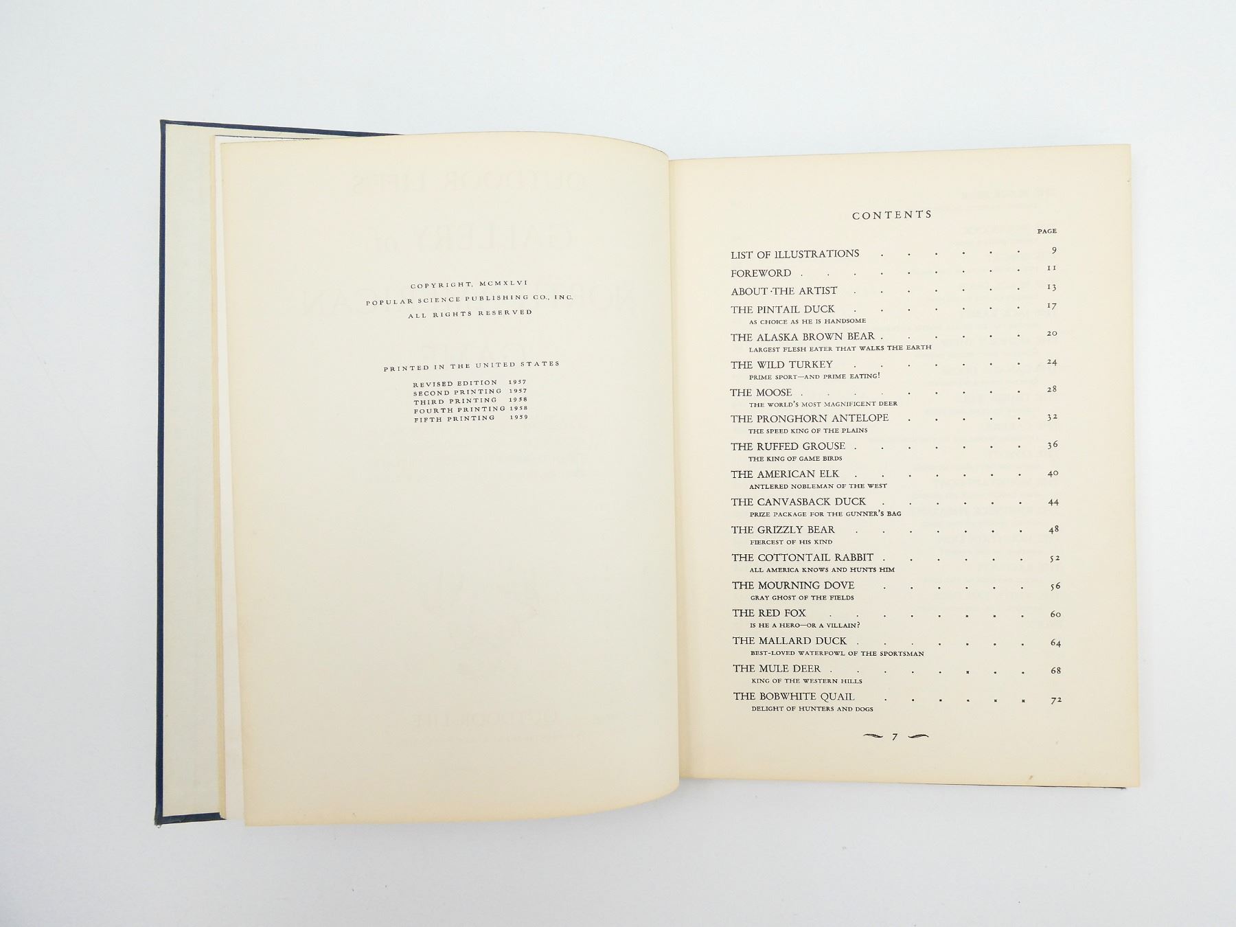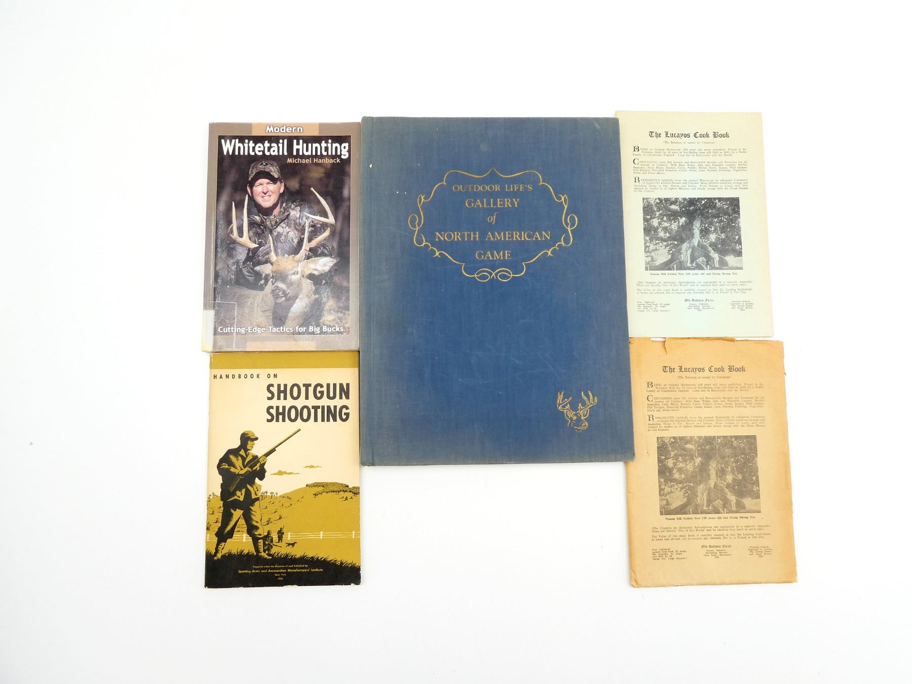LOT INCLUDES; (1) "HANDBOOK ON SHOTGUN SHOOTING" BOOK PUBLISHED BY COMMITTEE ON PROMOTIONAL ACTIVITIES SPORTING ARMS AND AMMUNITION MANUFACTURERS' INSTITUTE, SOFT COVER, COPYRIGHT 1955, (1) "THE LUCAYOS COOK BOOK" BOOK, SOFT COVER, COPYRIGHT 1959, (1) "MODERN WHITETAIL HUNTING" BOOK BY MIACHAEL HANBACK, SOFT COVER, ISBN: 0-87349-538-1 & (1) "OUTDOOR LIFE'S GALLERY OF NORTH AMERICAN GAME" BOOK PUBLISHED BY OUTDOOR LIFE, HARD COVER, COPYRIGHT 1946. SEE PHOTOS.