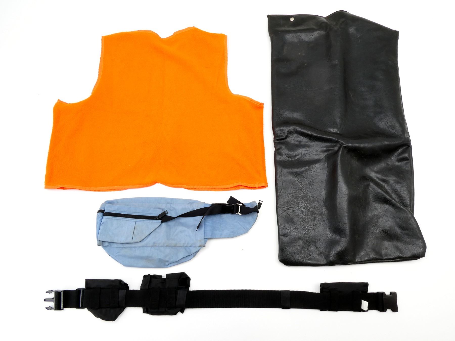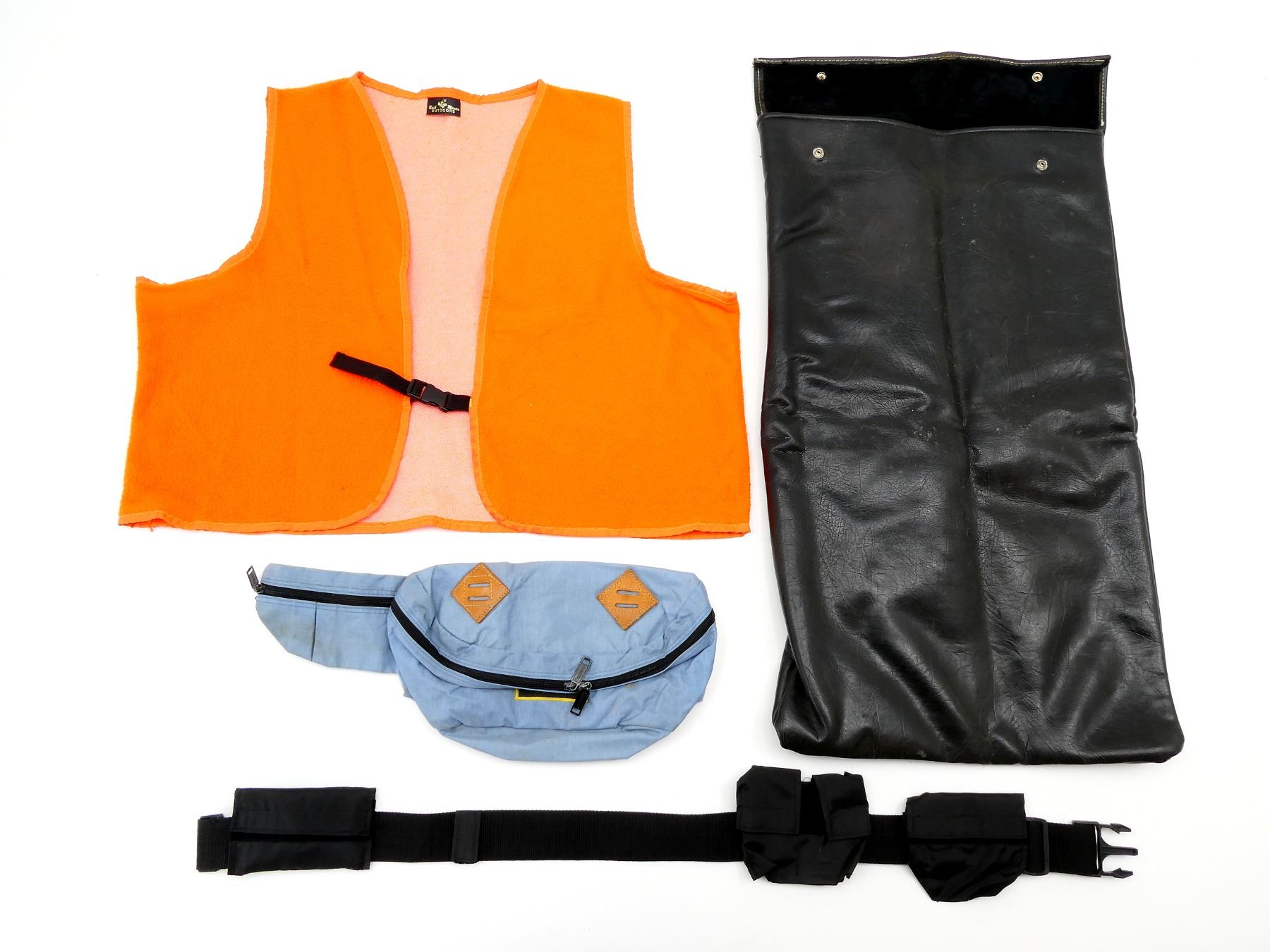 LOT INCLUDES; (1) HUNTING SAFETY VEST, SHOULDER LENGTH APPROX. 19", (1) LUGGER FANNYPACK, (1) UNKNOWN BLACK LEATHER HOLDER APPROX. 18" X 30" & (1) ACCESSORY POUCH. SEE PHOTOS.