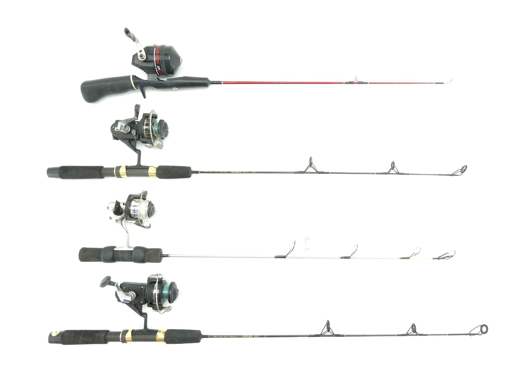 LOT INCLUDES; (2) LE BARON MODEL NO: LBI-126 ICE FISHING RODS WITH JOHNSON CHAIRMAN 820 REELS, WORKING CONDITION, VARIOUS MARKINGS, OALS APPROX. 31 3/8", (1) CRYSTAL ICE SOUTH BEND ICE FISHING ROD WITH REEL, MEDIUM LIGHT, WORKING CONDITION, VARIOUS MARKINGS, OAL APPROX. 27 5/8" & (1) SOUTH BEND CASY AWAY ICE FISHING ROD, NO. 00?3, MEDIUM ACTION, WITH SOUTH BEND 105 REEL, OAL APPROX. 28.75". SEE PHOTOS.