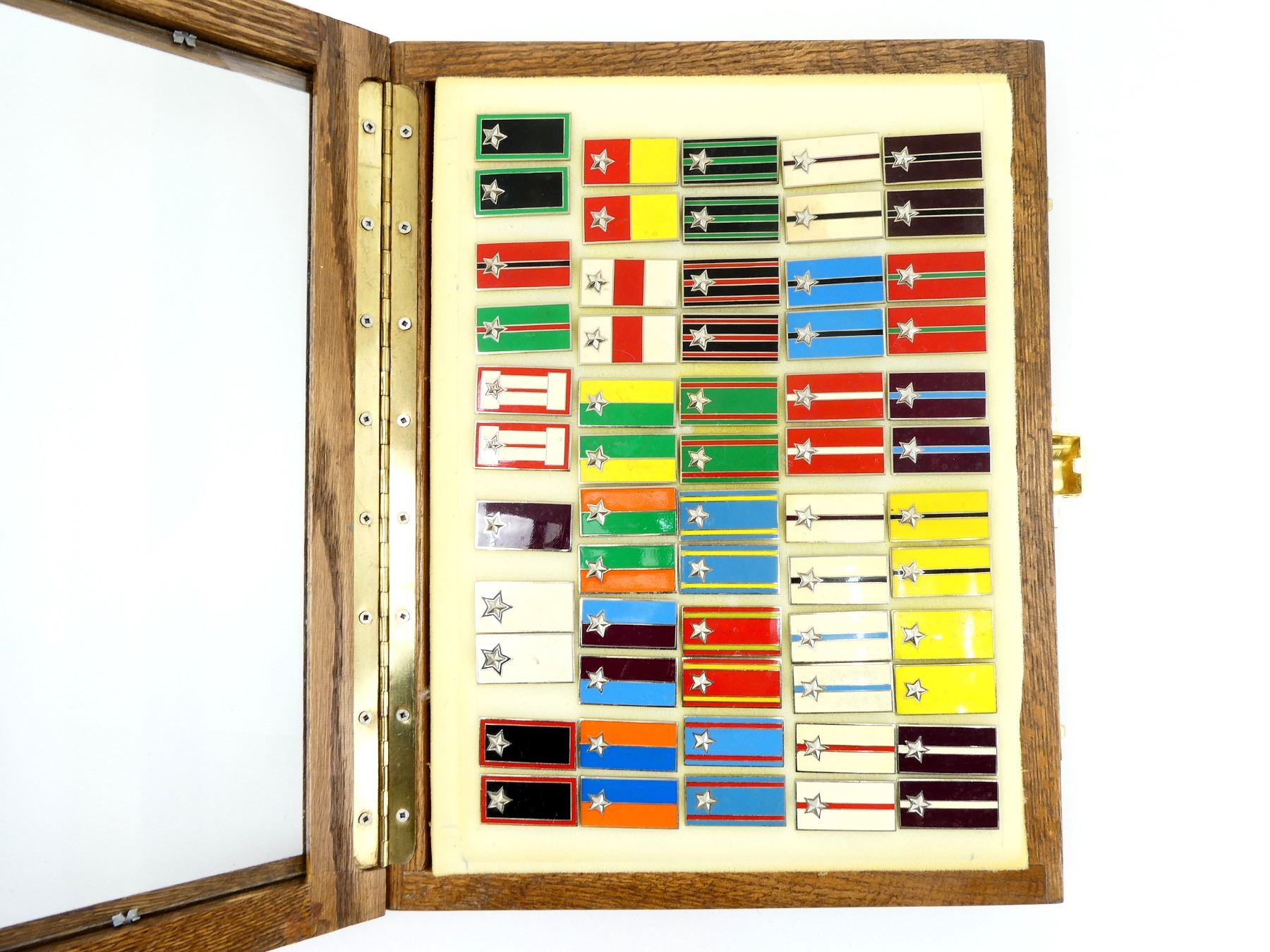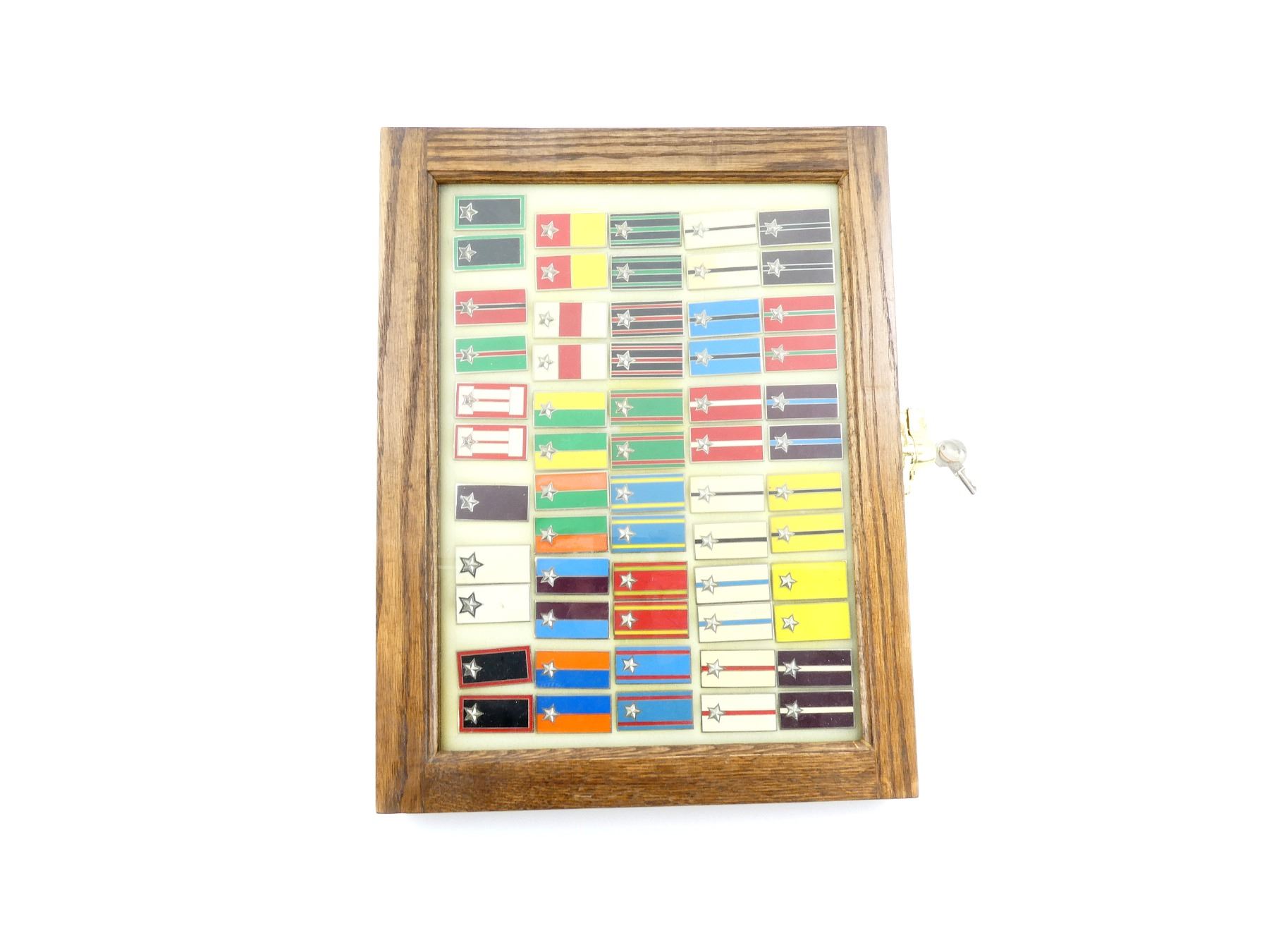 APPROX. (59) MOSTRINE (GORGET) BADGES, VARIOUS COLOURS, METAL ENAMELED, UNDER GLASS, INCLUDES; 5TH INFANTRY REGIMENT "AOSTA", 13TH COMMAND & TACTICAL SUPPORTS UNIT "PINEROLO", 9TH INFANTRY REGIMENT "BARI", 235TH VOLUNTEER TRAINING REGIMENT "PICENO", 78TH COMMAND AND TACTICAL SUPPORTS UNIT "LUPI DI TOSCANA", ETC. & (1) DISPLAY CASE, GLASS / WOOD CONSTRUCTION, LOCKABLE, WITH KEYS, APPROX. 18" X 13.75" X 1 5/8". SEE PHOTOS. *NO GUARANTEE ON GLASS FOR SHIPPING*