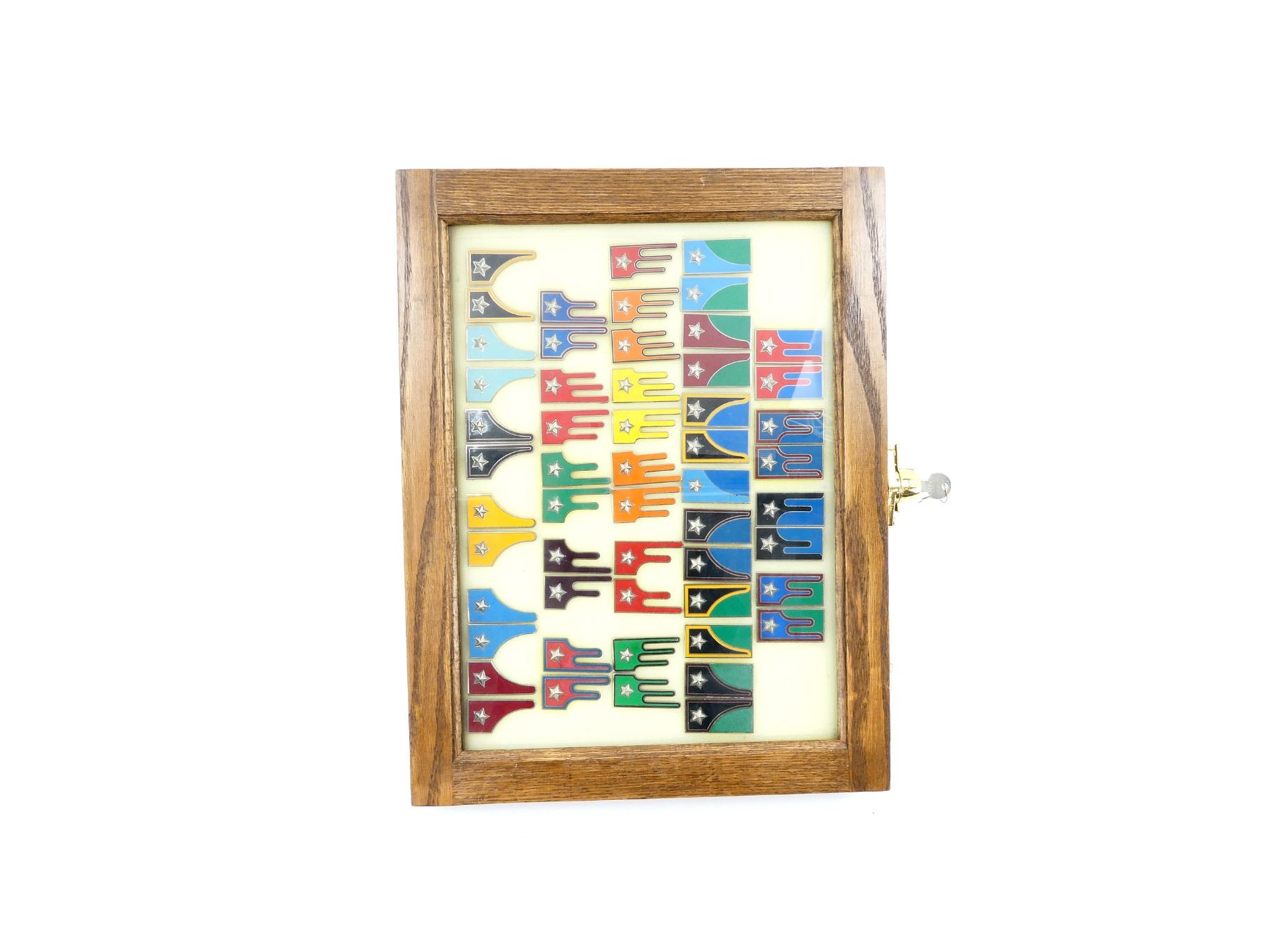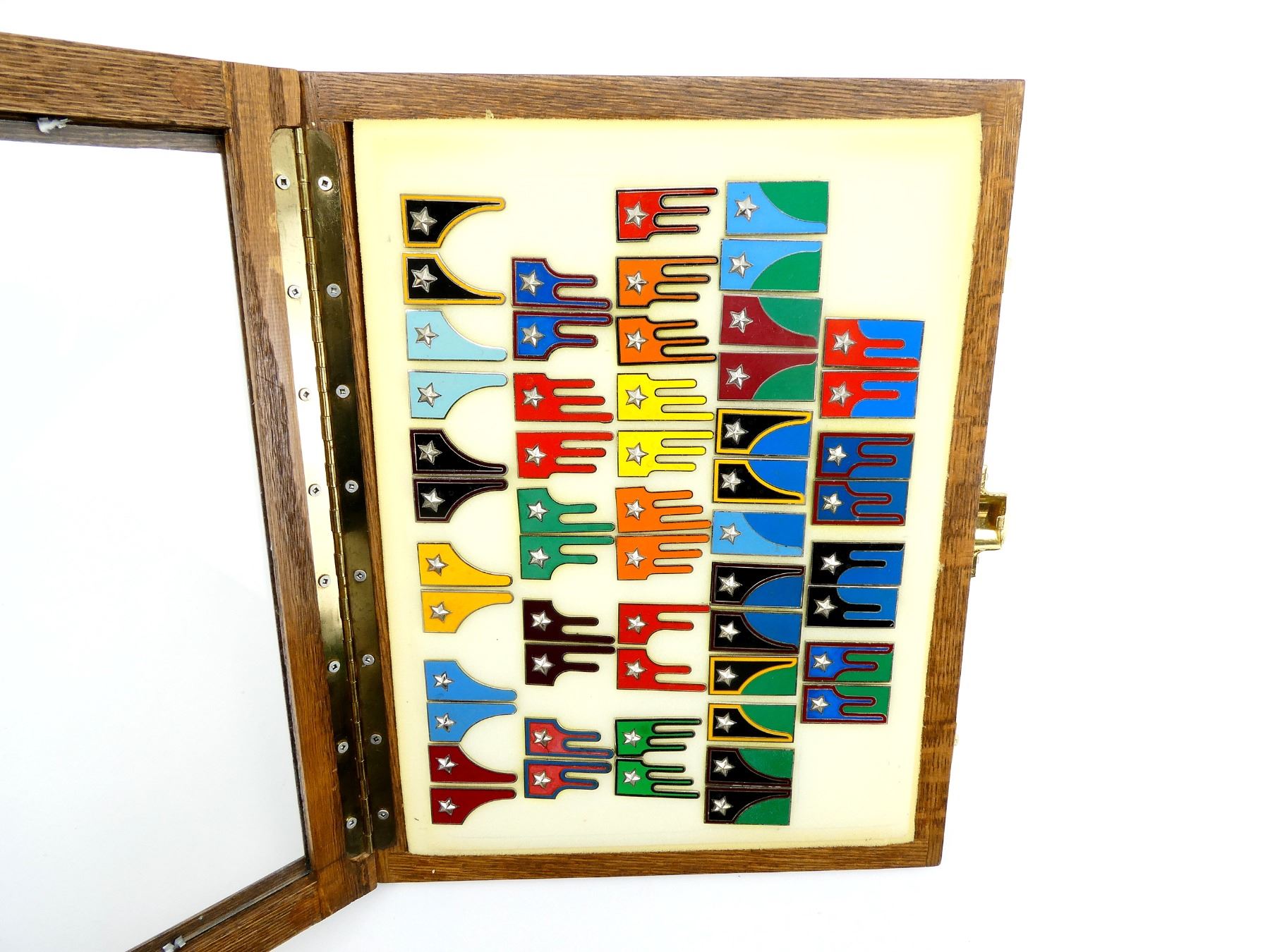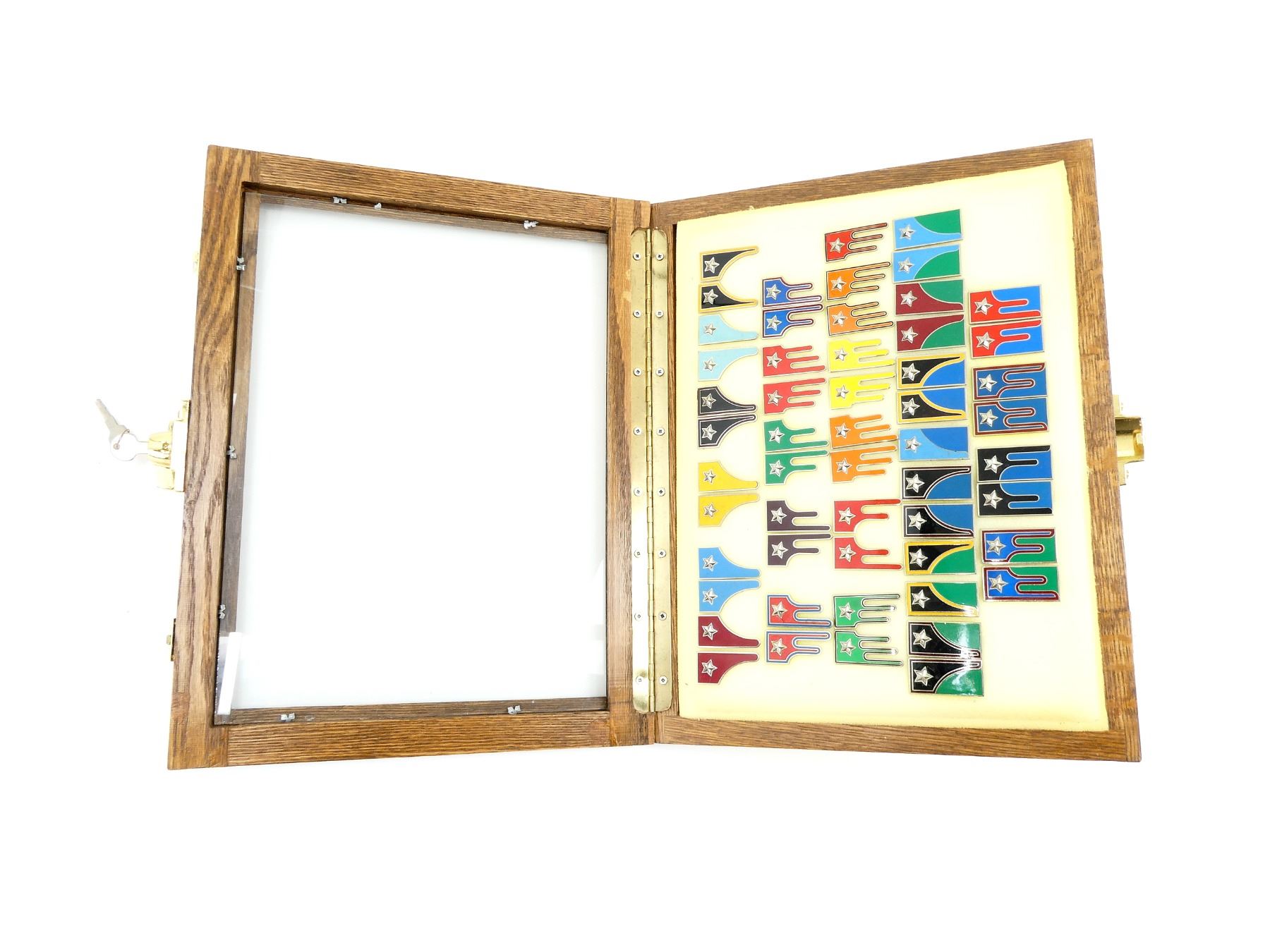 APPROX. (54) MOSTRINE (GORGET) BADGES, VARIOUS COLOURS, METAL ENAMELED, UNDER GLASS, INCLUDES; REGIMENT "NIZZA CAVALLERIA" (1ST), REGIMENT "PIEMONTE CAVALLERIA" (2ND), REGIMENT "GENOVA CAVALLERIA (4TH), REGIMENT "LANCIERI DI MONTEBELLO" (8TH), UN-ASSIGNED CAVALRY PERSONNEL, ALPINI (MOUNTAIN INFANTRY), BERSAGLIERI (SKIRMISHERS, SCOUTS & SHARPSHOOTERS), ETC. & (1) DISPLAY CASE, GLASS / WOOD CONSTRUCTION, LOCKABLE, WITH KEYS, APPROX. 18" X 13.75" X 1 5/8". SEE PHOTOS. *NO GUARANTEE ON GLASS FOR SHIPPING*