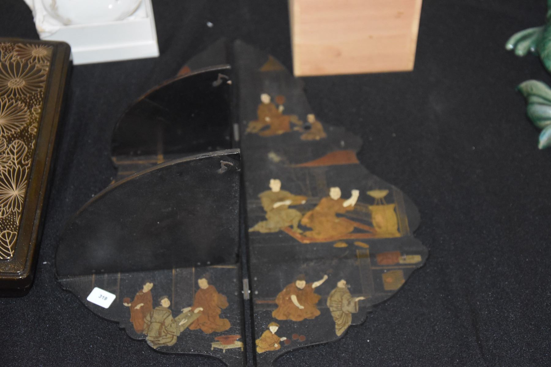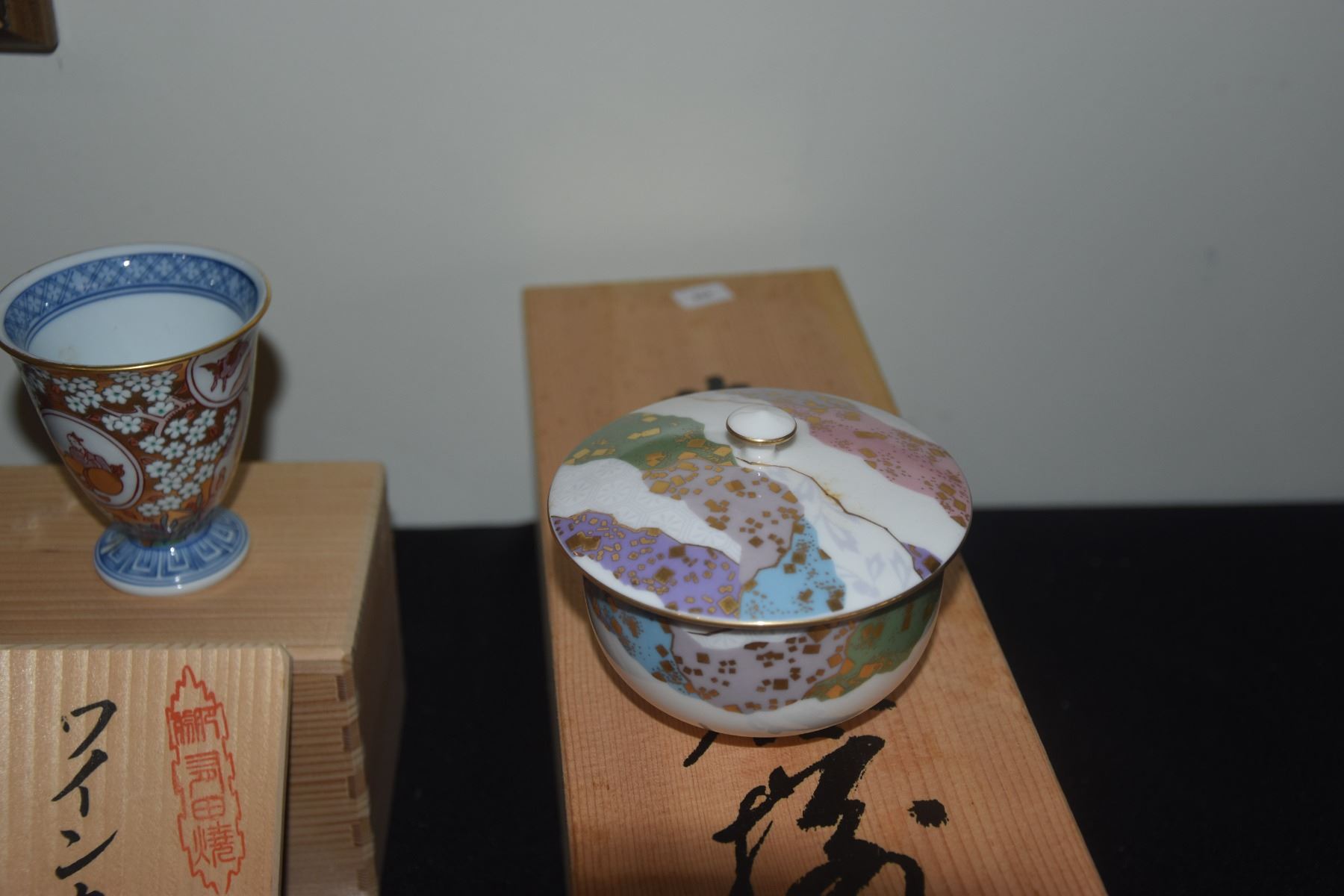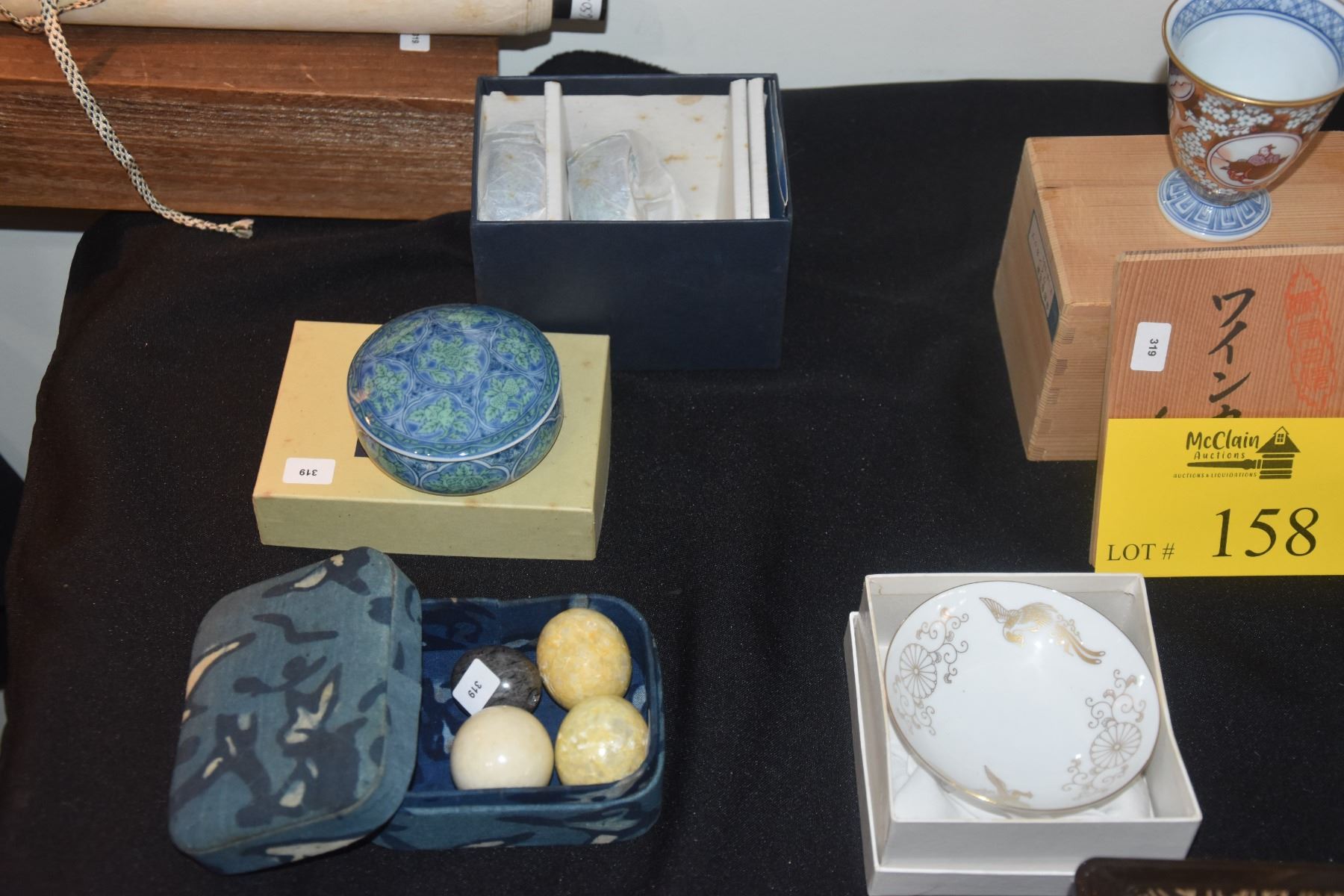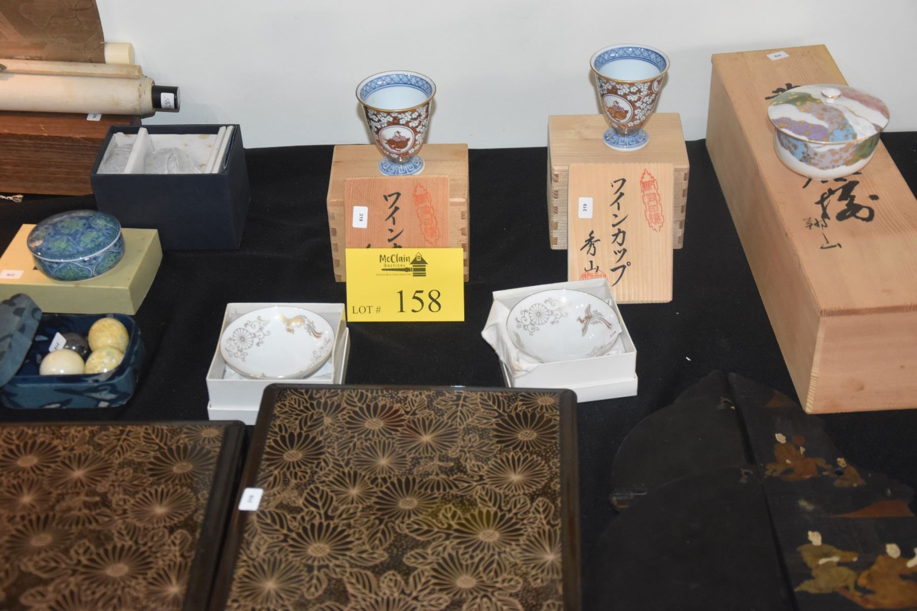 ASSORTED JAPANESE CUPS, COVERED BOWLS, SCROLL WEIGHTS & LACQUER BOXES/SHELF (19 PCS)