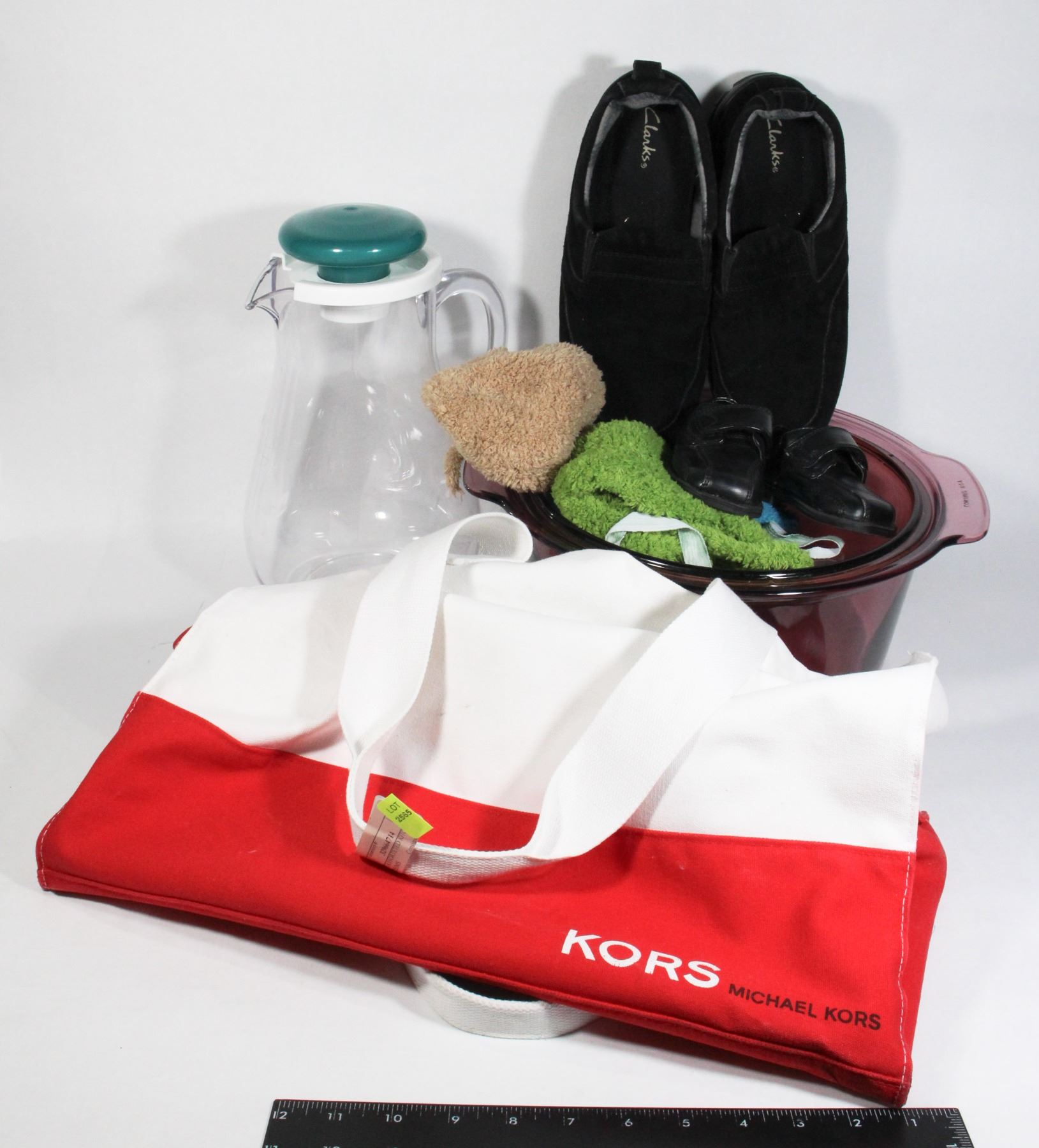 LARGE CORNING USA SERVER WITH LID, HOME MADE BABY TOQUES, LEATHER CLARKS SHOES SIZE 8 (NEAR NEW CONDITION), BABY SHOES SIZE 3, JUICE PITCHER, AND REUSABLE MICHEAL KORS CANVAS SHOPPING BAG