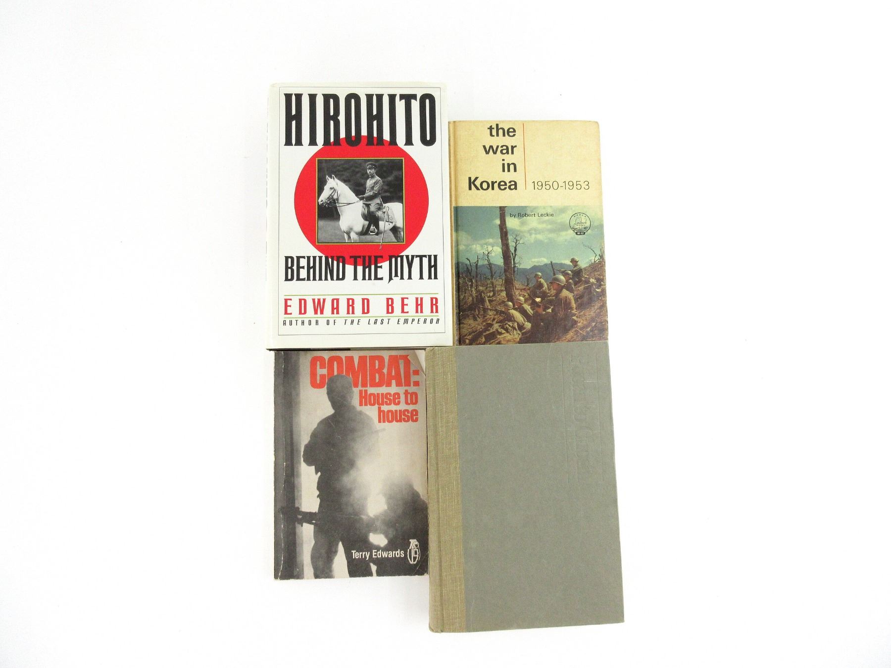LOT INCLUDES; (1) "COMBAT: HOUSE TO HOUSE" BOOK BY TERRY EDWARDS, SOFT COVER, COPYRIGHT 1979, (1) "HIROHITO, BEHIND THE MYTH" BOOK BY EDWARD BEHR, HARD COVER WITH DUST COVER, ISBN: 0-394-58072-9, (1) "THE WAR IN KOREA 1950-1953" BOOK BY ROBERT LECKIE, HARD COVER, COPYRIGHT 1963 & (1) "THE KOREAN WAR, PUSAN TO CHOSIN, AN ORAL HISTORY" BOOK BY DONALD KNOX, HARD COVER, ISBN: 0-15-147288-2. SEE PHOTOS.