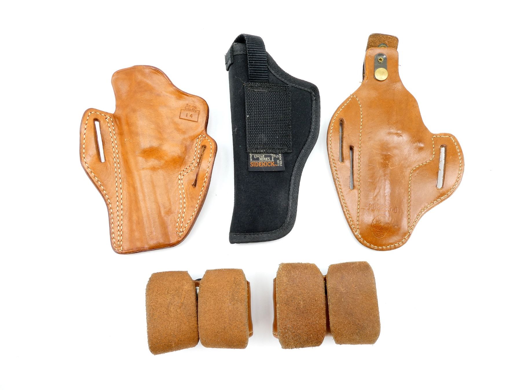 LOT INCLUDES; (2) ASSORTED RIGHT-HAND BROWN LEATHER SHOULDER HOLSTERS, (1) RIGHT-HAND UNCLE MIKE'S SIZE 5 BLACK NYLON HOLSTER & (2) BROWN LEATHER MAG POUCHES. SEE PHOTOS.