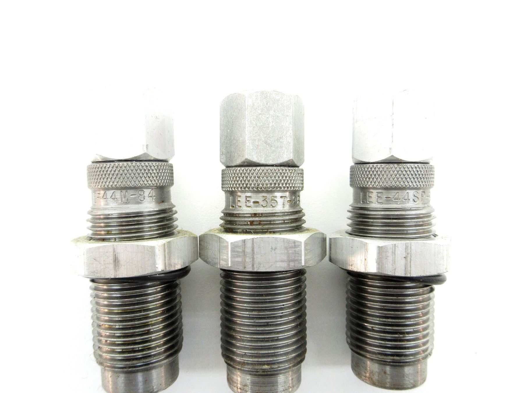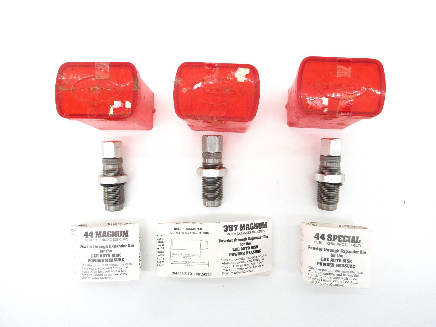 LOT INCLUDES; (1) LEE .44 MAG 1-PIECE POWDER THRU EXPANDER DIE FOR LEE AUTO DISK POWDER MEASURE, (1) LEE .44 SPL 1-PIECE POWDER THRU EXPANDER DIE FOR LEE AUTO DISK POWDER MEASURE & (1) LEE .357 MAG POWDER THRU EXPANDER DIE FOR LEE AUTO DISK POWDER MEASURE. SEE PHOTOS.