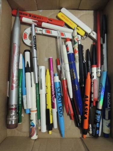 ASSORTED LOT BUSINESS ADVERTISING BALL POINT PENS. AS SHOWN. VIEW PICTURE FOR DETAIL.