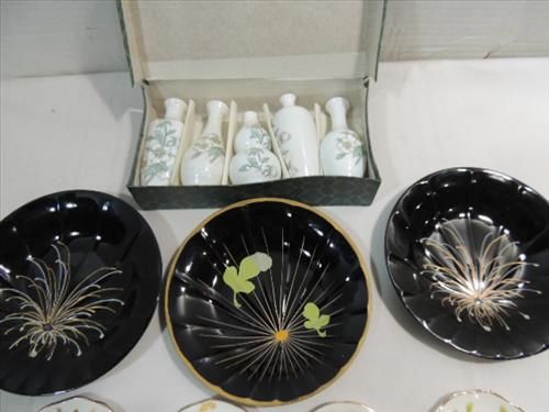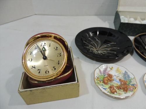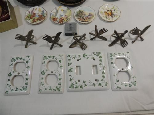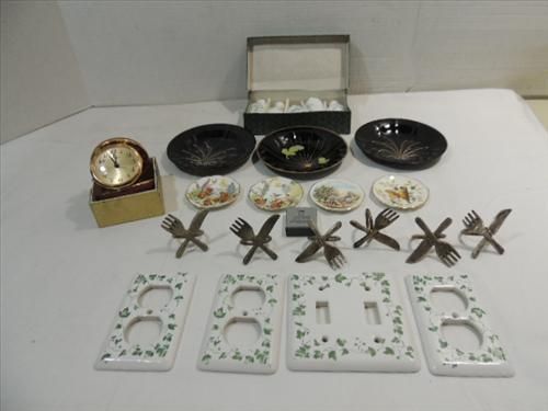 ASSORTED LOT COLLECTIBLES: TRAVEL ALARM CLOCK, SILVER PLATED NAPKIN HOLDERS, CERAMIC LIGHT SWITCH COVERS, SMALL PLATES AND MORE. AS SHOWN. VIEW PICTURE OFR DETAIL.
