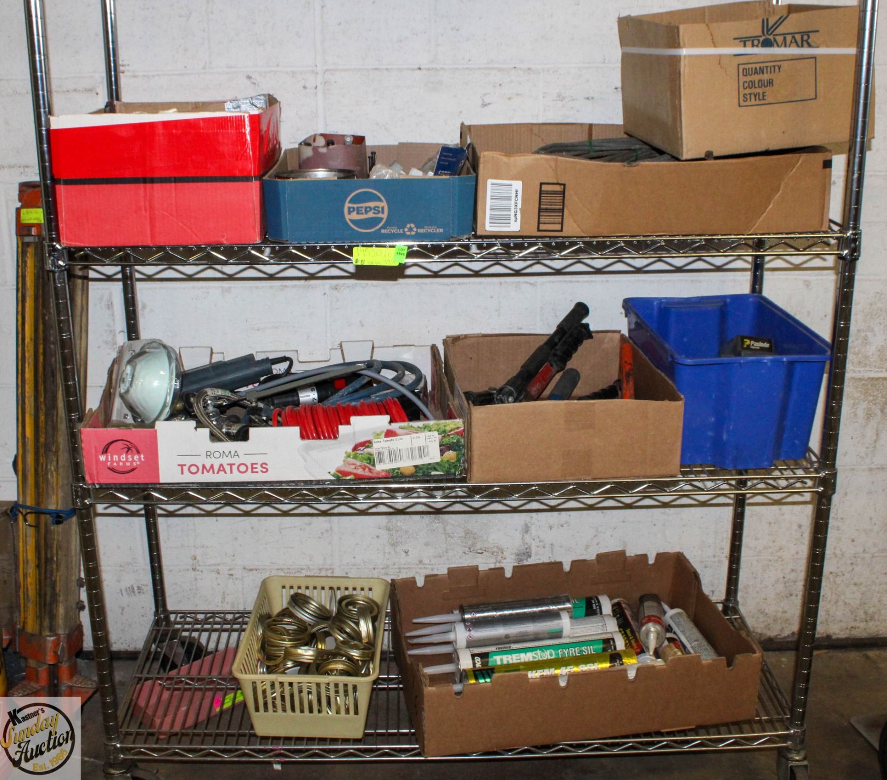 ASSORTED LOT HARDWARE, CAULKING, LIGHT + MORE